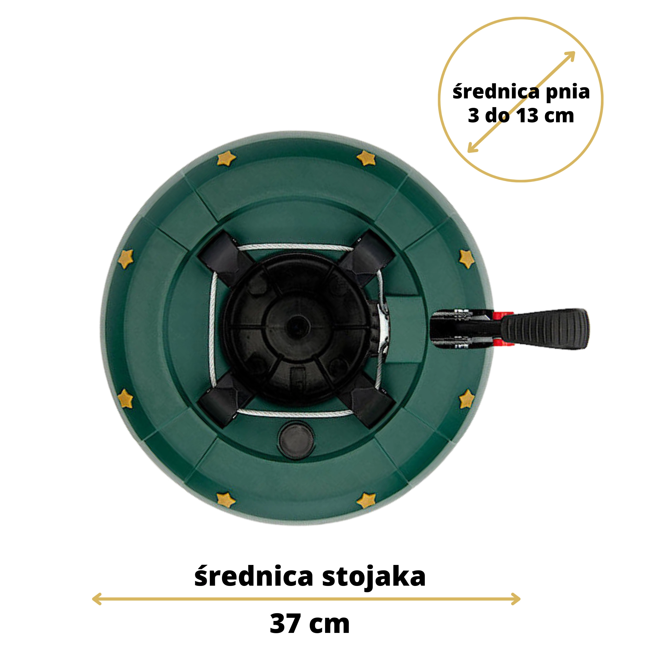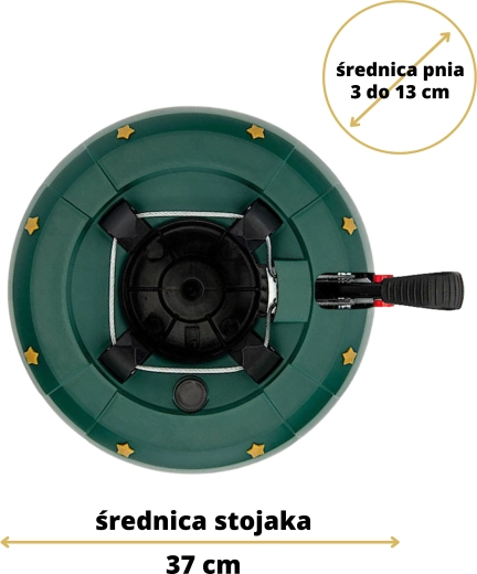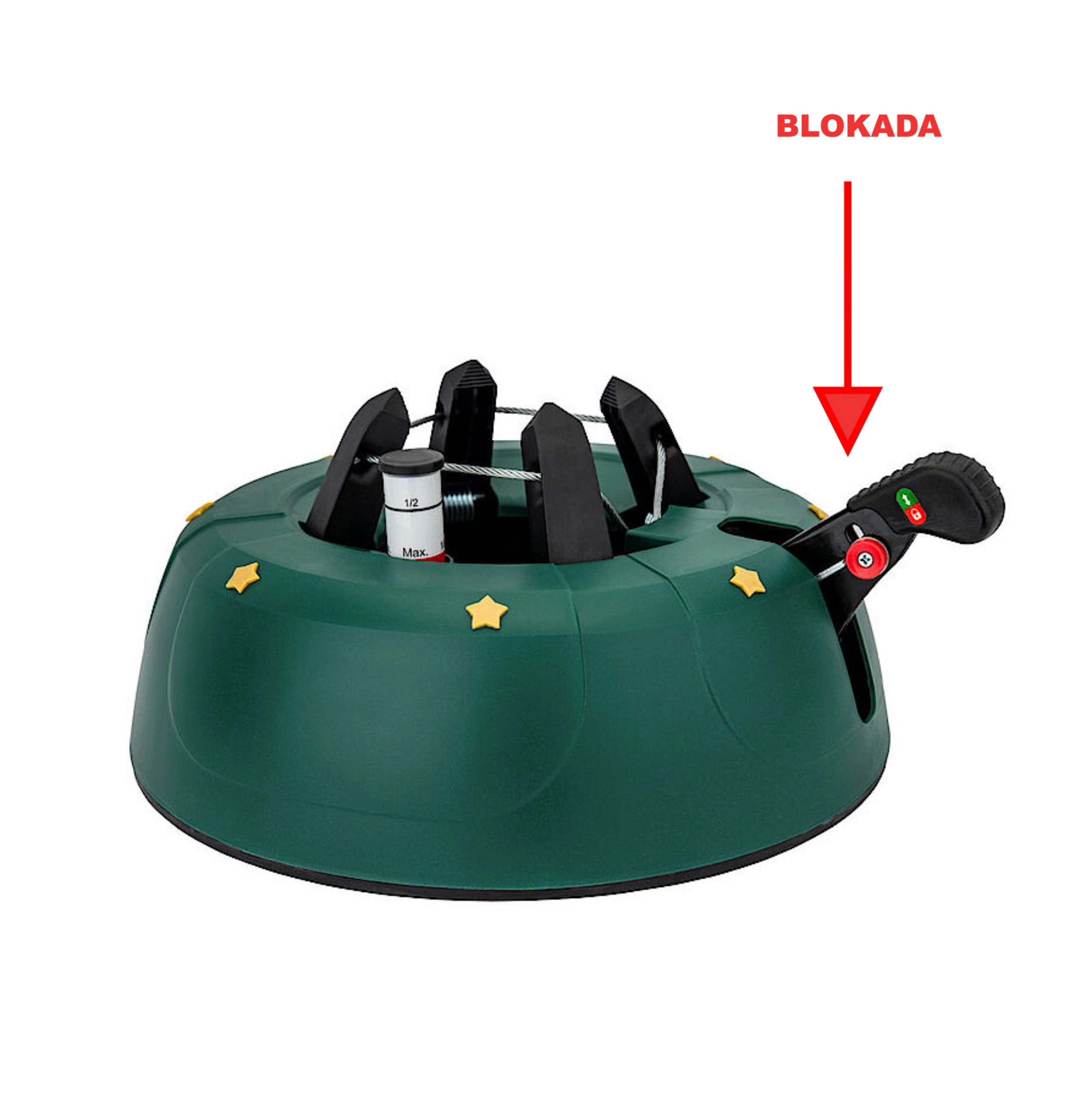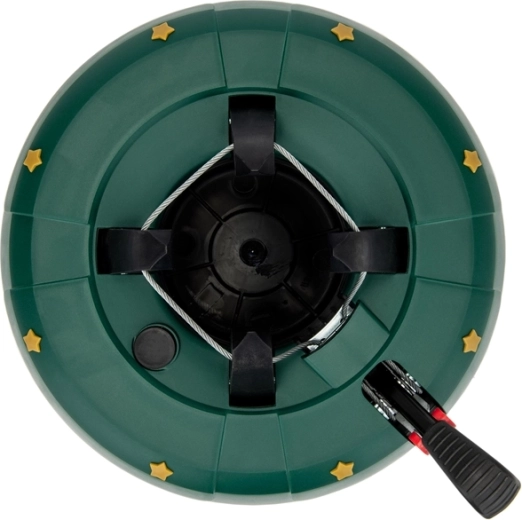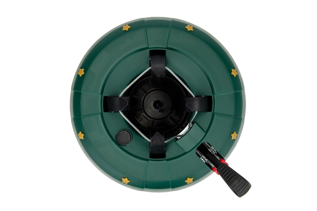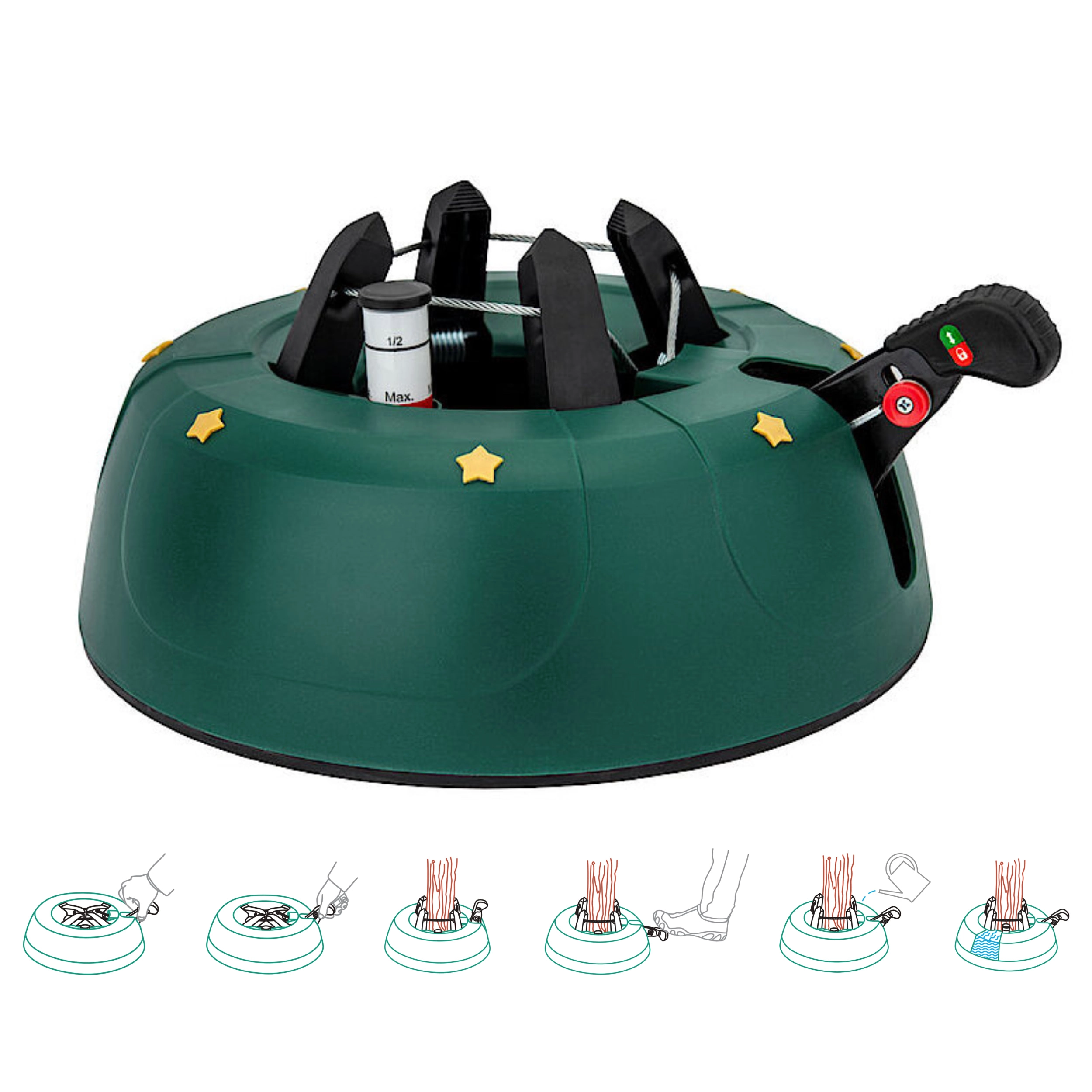 Betjeningen er intuitiv: Placer træet på den centrale stålpig, træd flere gange på armen for at stramme kæberne, og aktiver derefter sikkerhedslåsen på armen for at forhindre utilsigtet løsning. Dekor i form af gyldne stjerner og den festlige grønne farve passer til hjem, hoteller, butikker og offentlige rum.