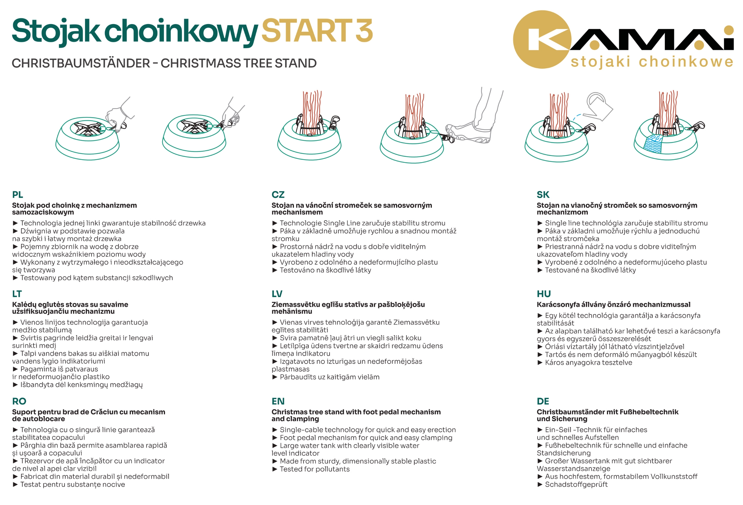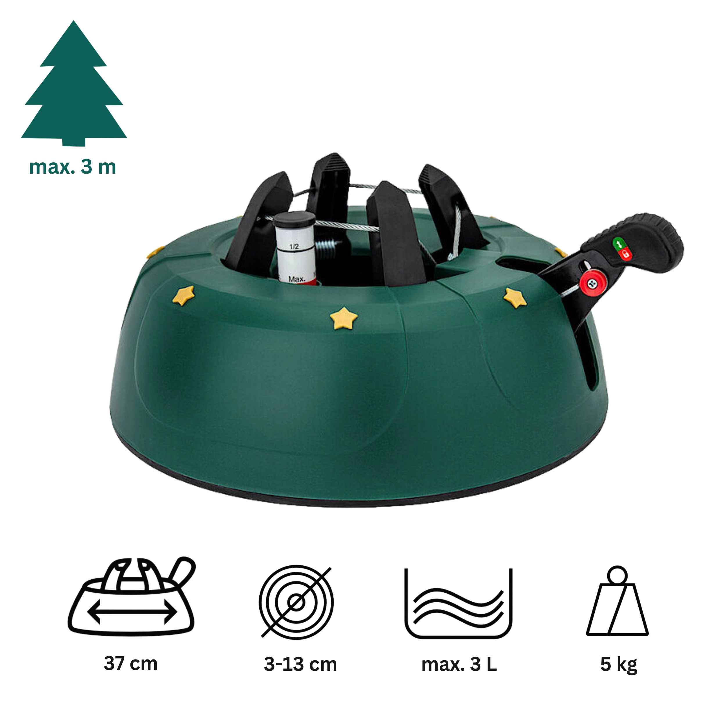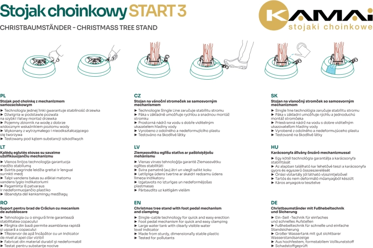 Kamai Start 3 er en pålidelig fod til levende juletræer op til 3 meters højde. Den brede base, vægt på 5 kg og fire selvklemmende kroge med stærkt stålkabel omslutter stammen (3–13 cm) og holder den præcist lodret. Den integrerede vandtank på 3 liter med flydende niveaumåler hjælper med at holde nålene friske længere.