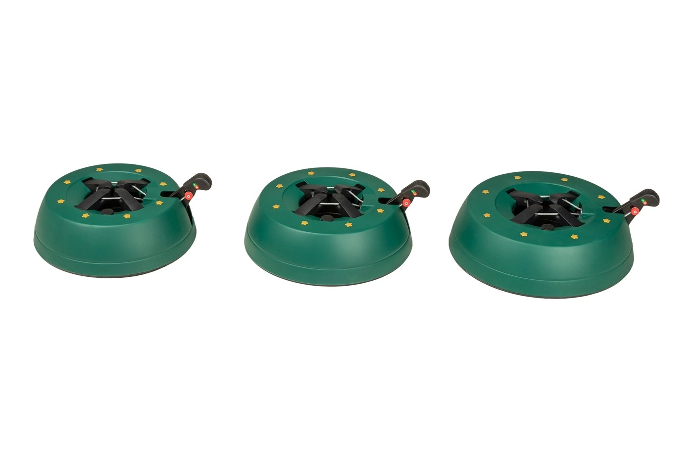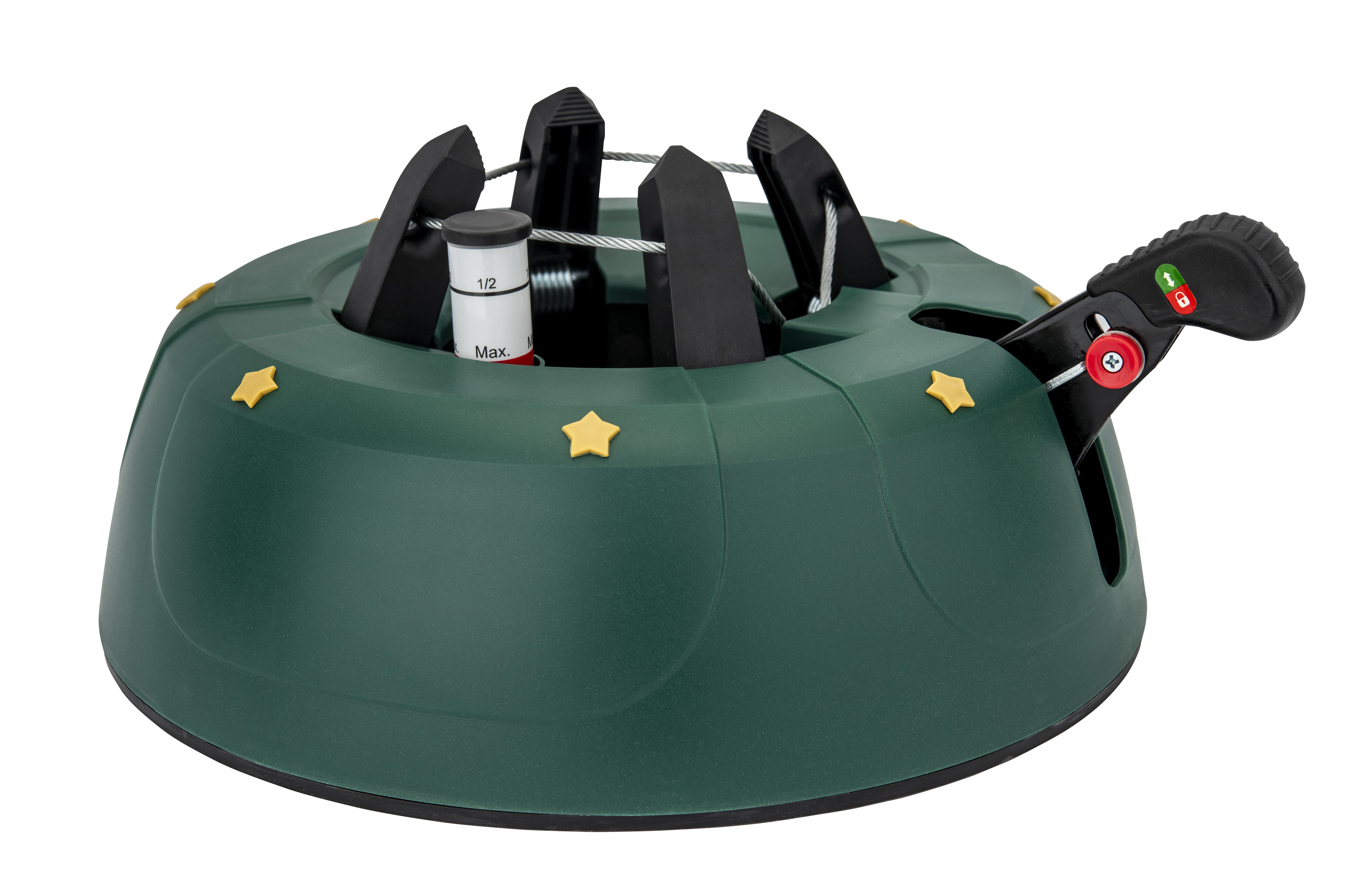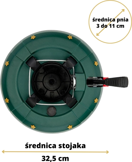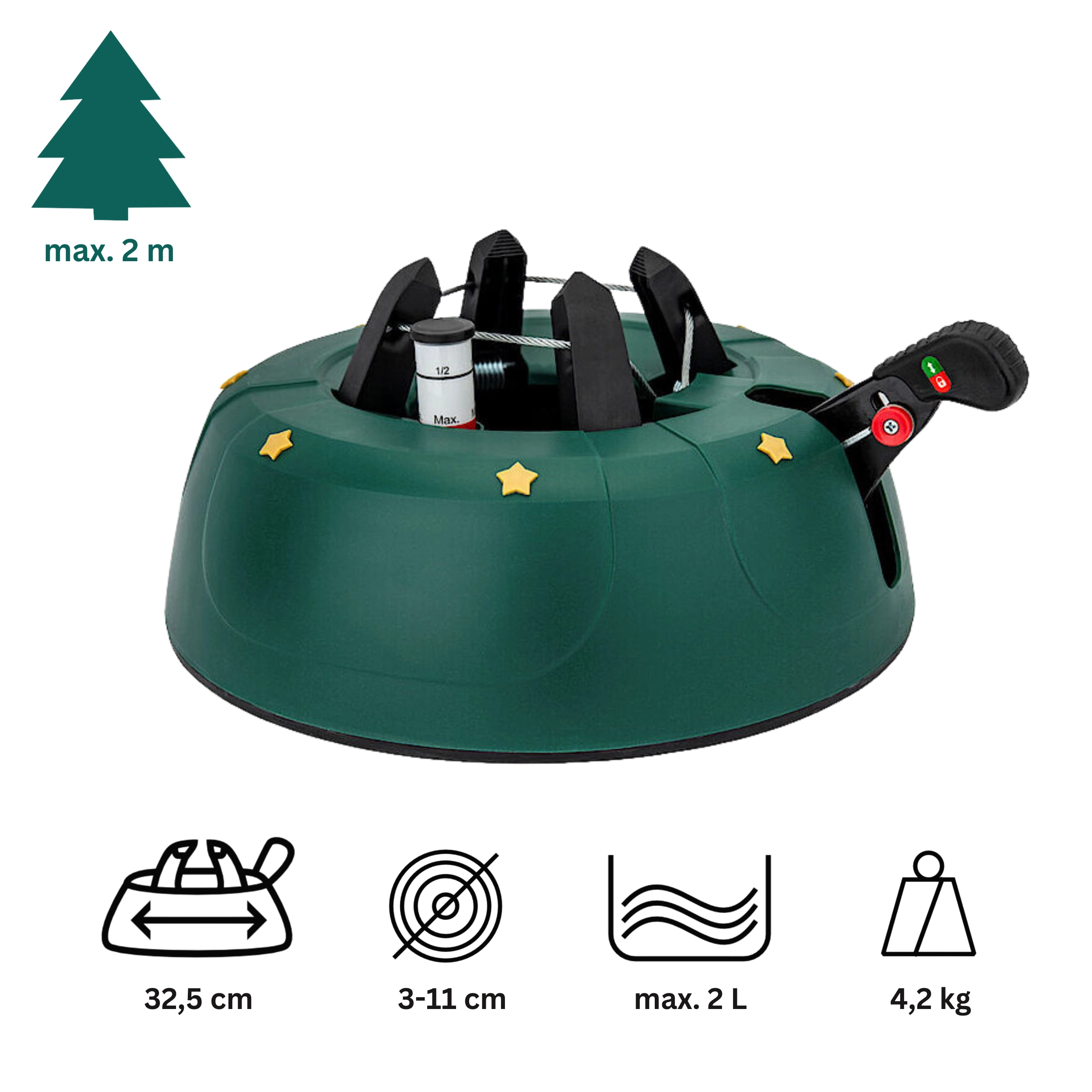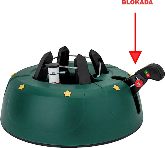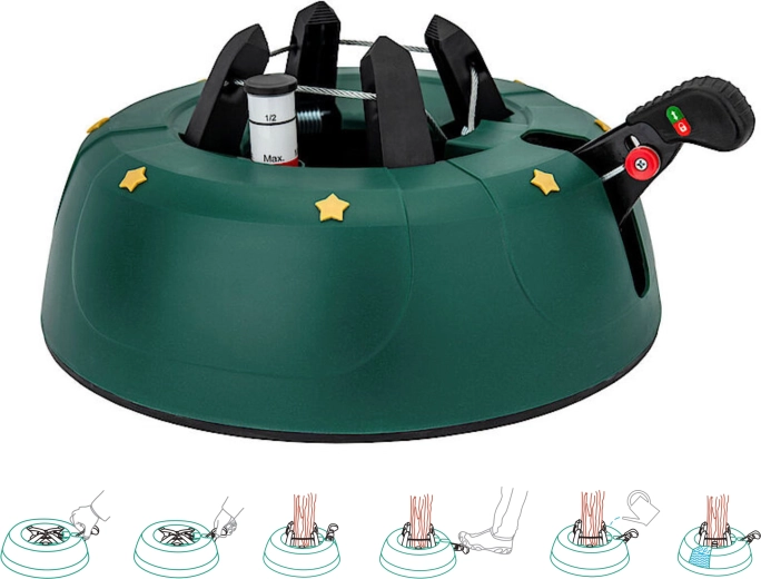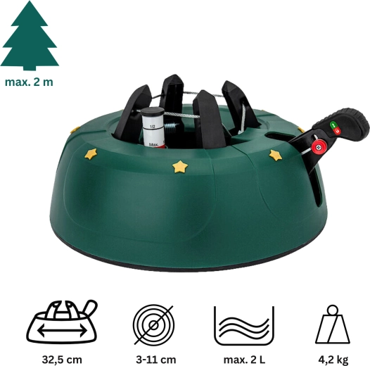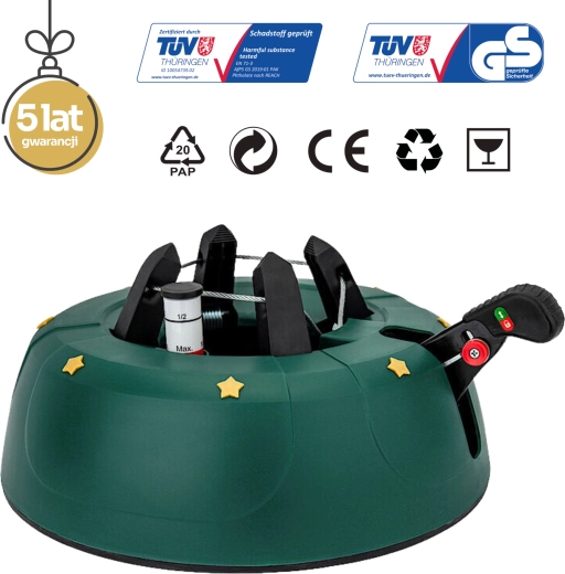 Det dekorative grønne design med gyldne stjerner passer til julepynten, og de robuste materialer (PP-korpus, ABS-kæber) tåler daglig brug. Takket være nem montering og armsikring mod utilsigtet frigørelse er foden ideel til lejligheder, huse, hoteller, kirker og butikker. Velegnet til populære arter som gran, ædelgran og fyr.