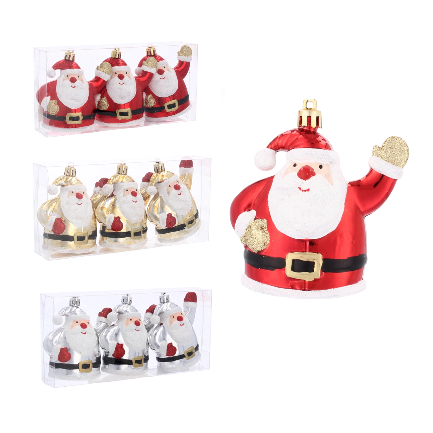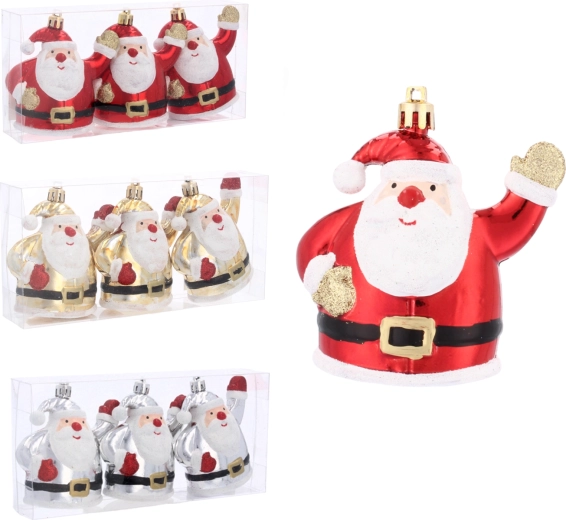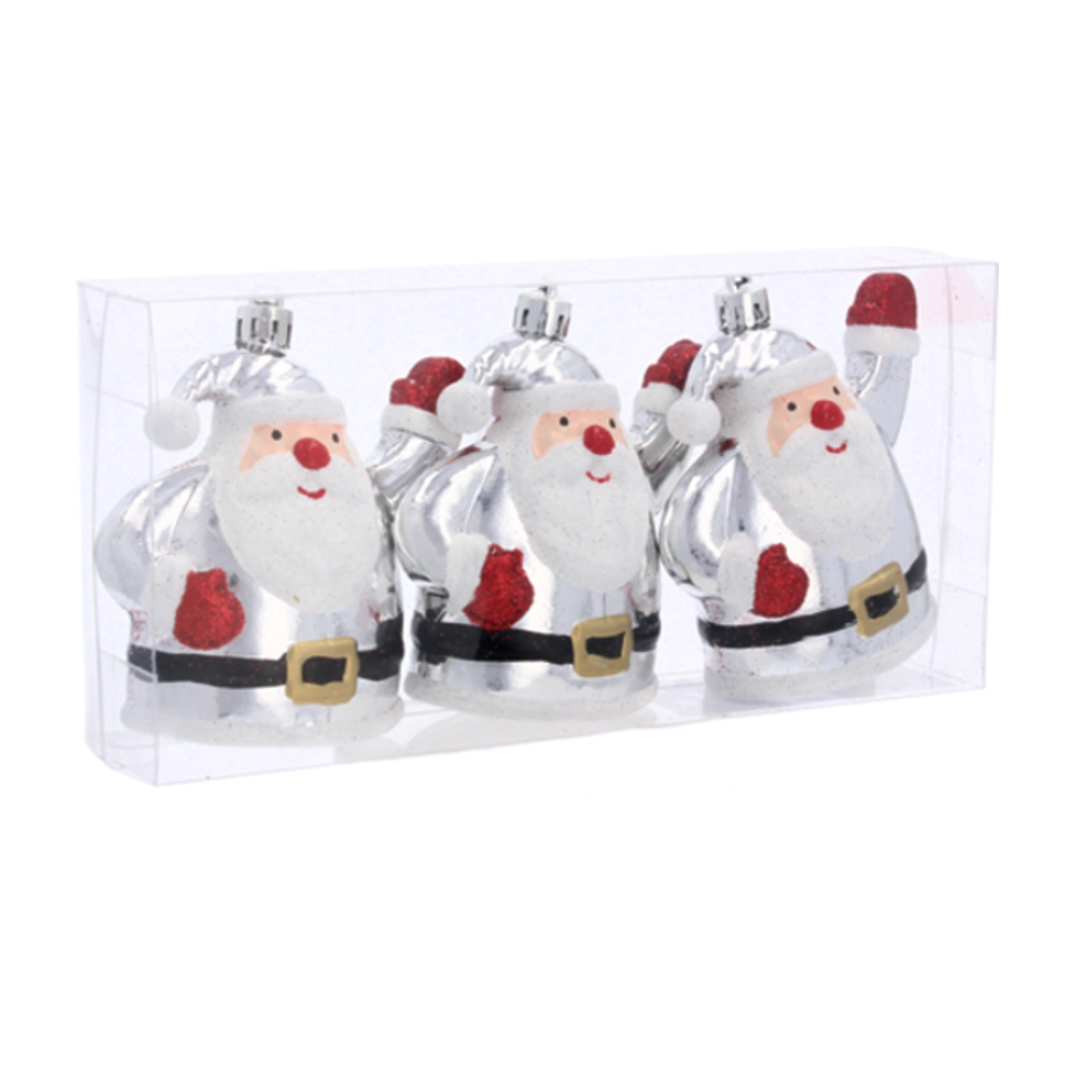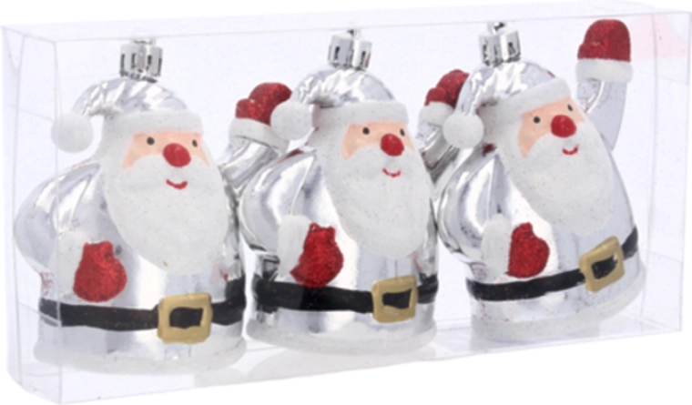 Giv din juleudsmykning et strejf af magi med et sæt på tre sølvfarvede pynt i form af Santa Claus. De er splintfri, lette at hænge op og fremhæver det klassiske julemotiv på dit træ eller i din hjemmedekoration.