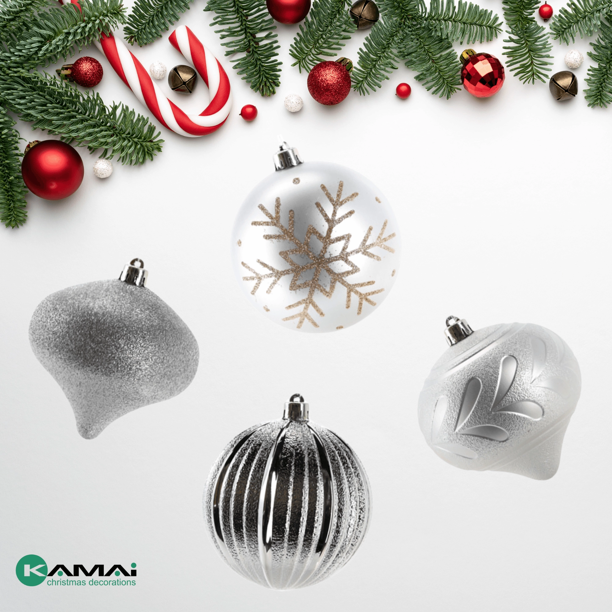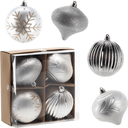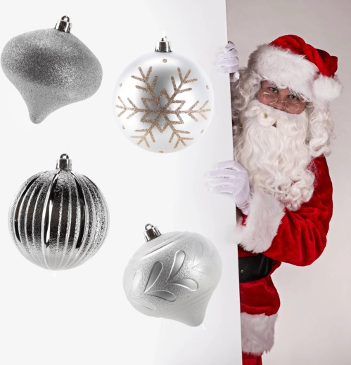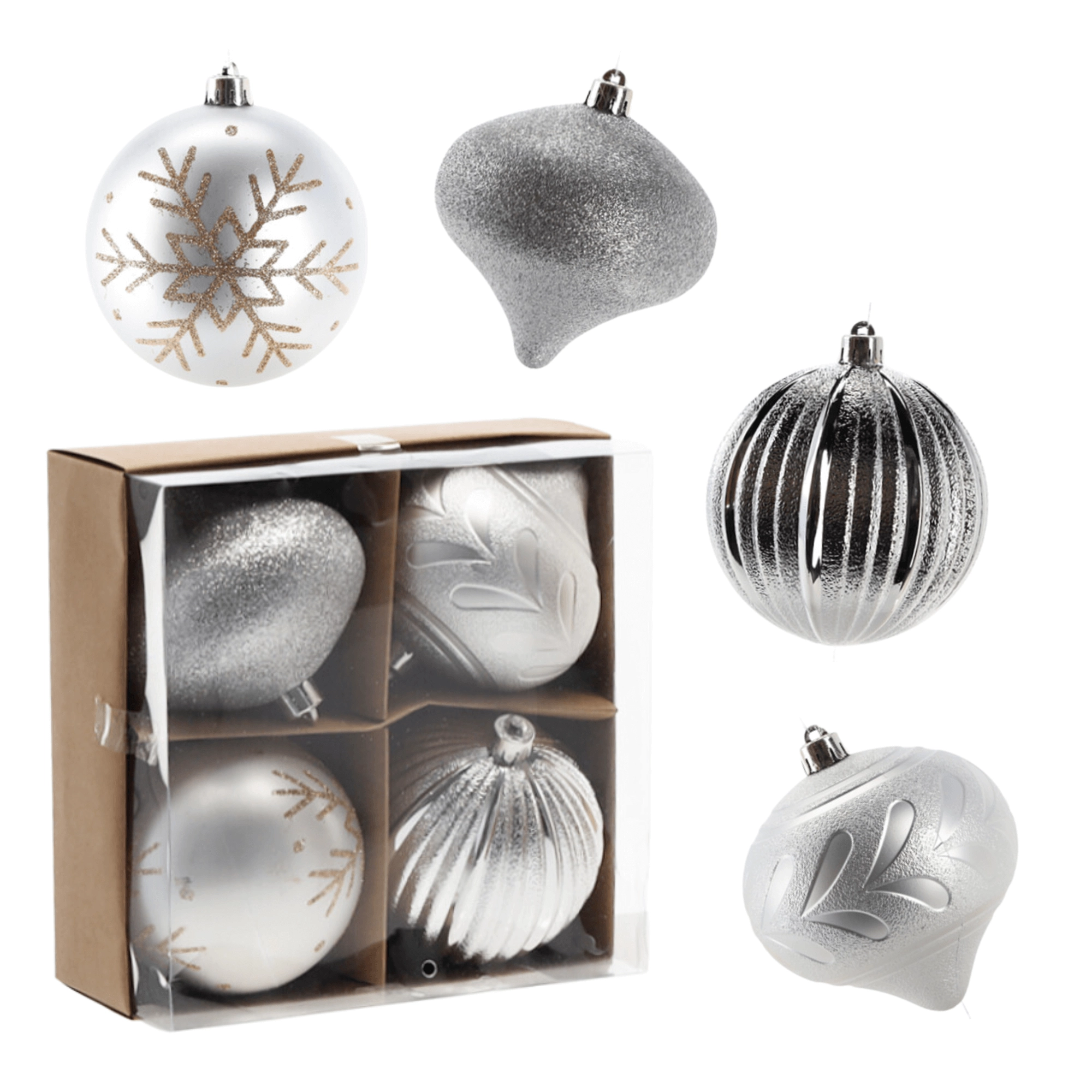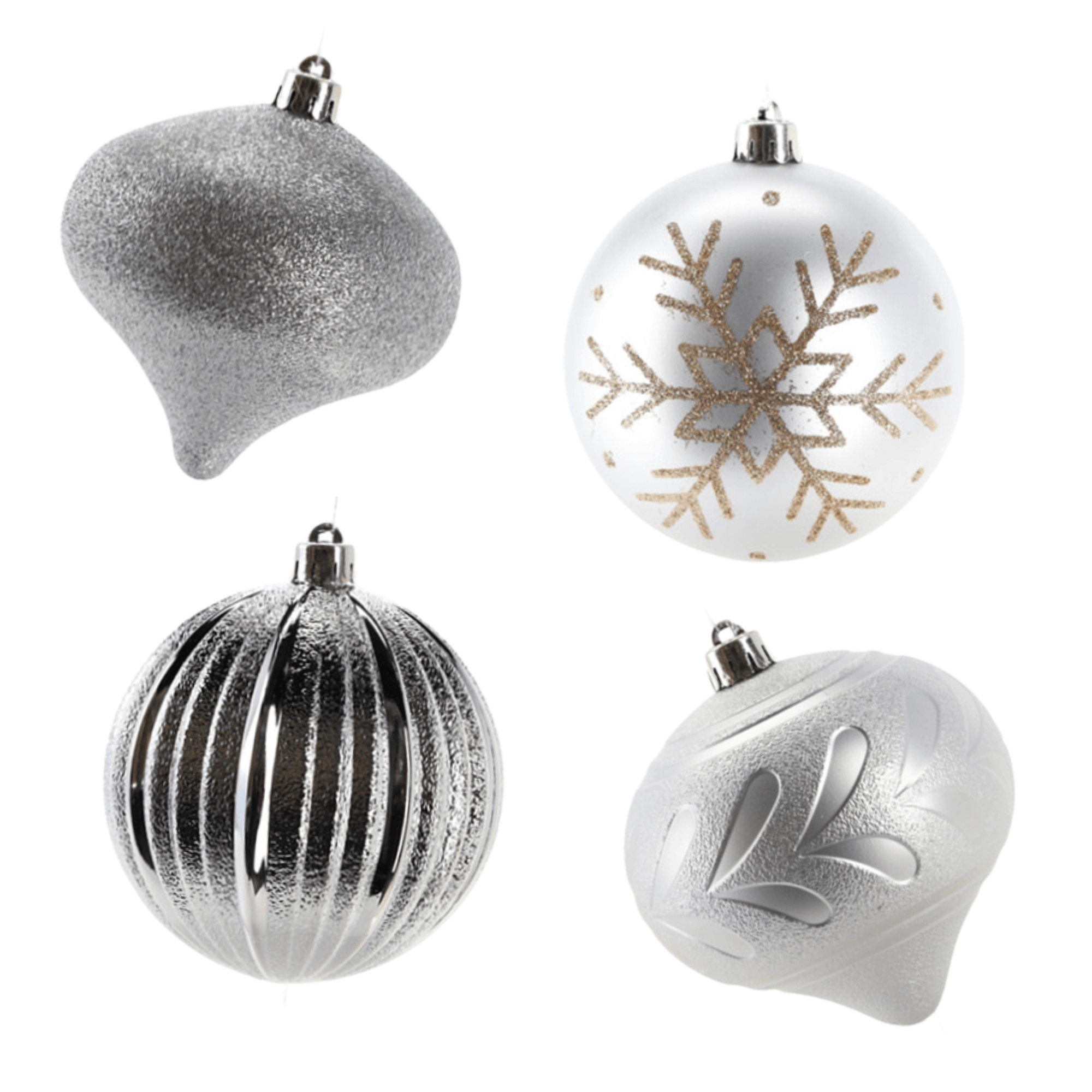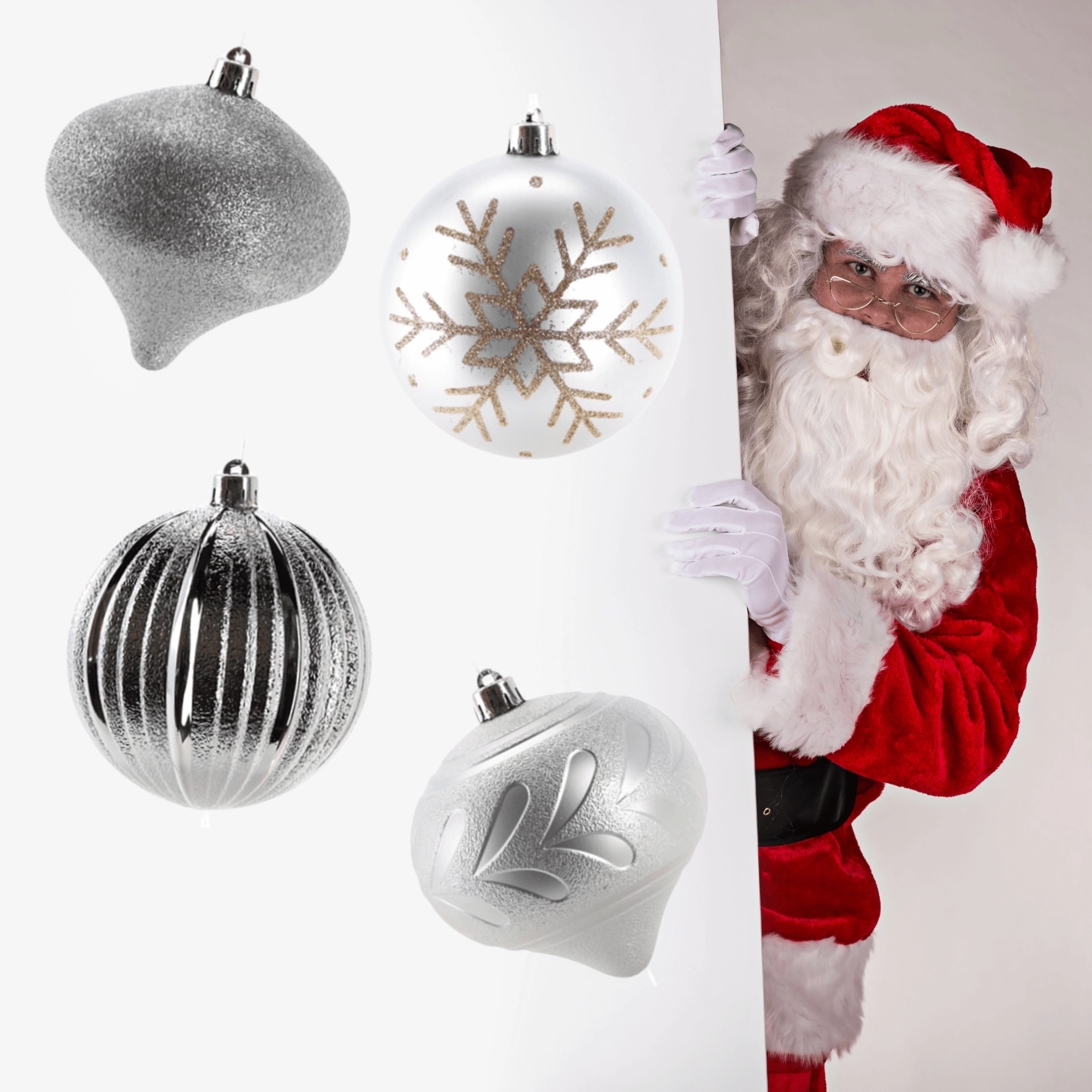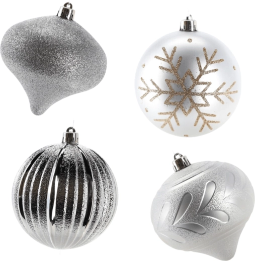 Det stilfulde sæt sølvkugler tilfører dit hjem flair og harmoni. Kombinationen af matte, riflede og glitrende overflader reflekterer lyset smukt, så dit juletræ imponerer fra alle vinkler. Takket være det robuste materiale er ornamenterne også velegnede i hjem med børn eller kæledyr.