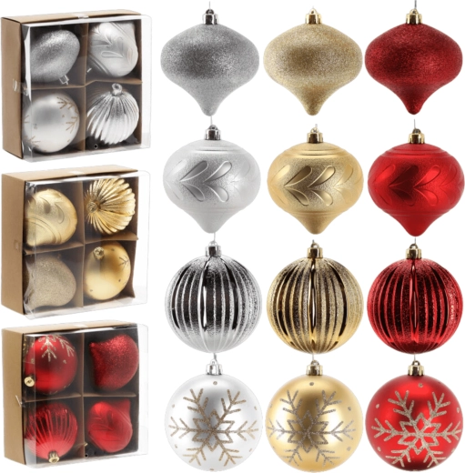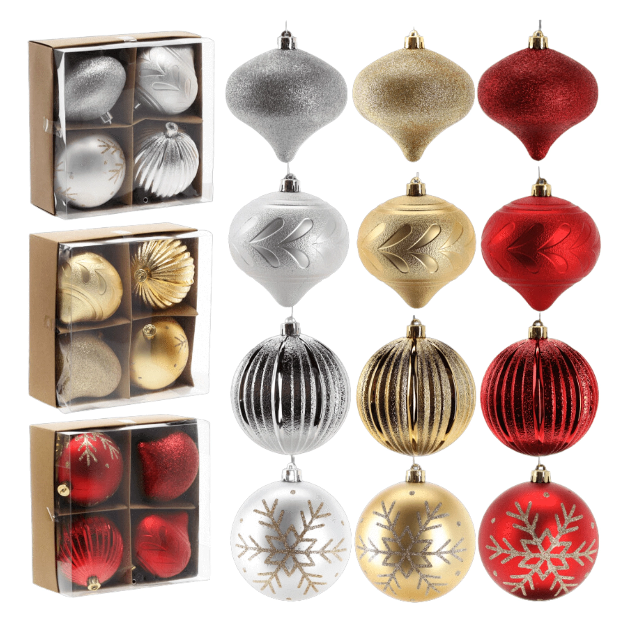 Hver kugle har et praktisk øje for nem ophængning. De varierede dekorationer – fra glitrende detaljer til fine reliefmønstre – giver dybde og elegant glans. Ideelt til både moderne og klassiske julearrangementer i stuen, entréen eller til firmadekoration.