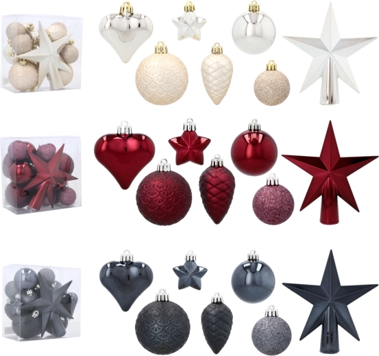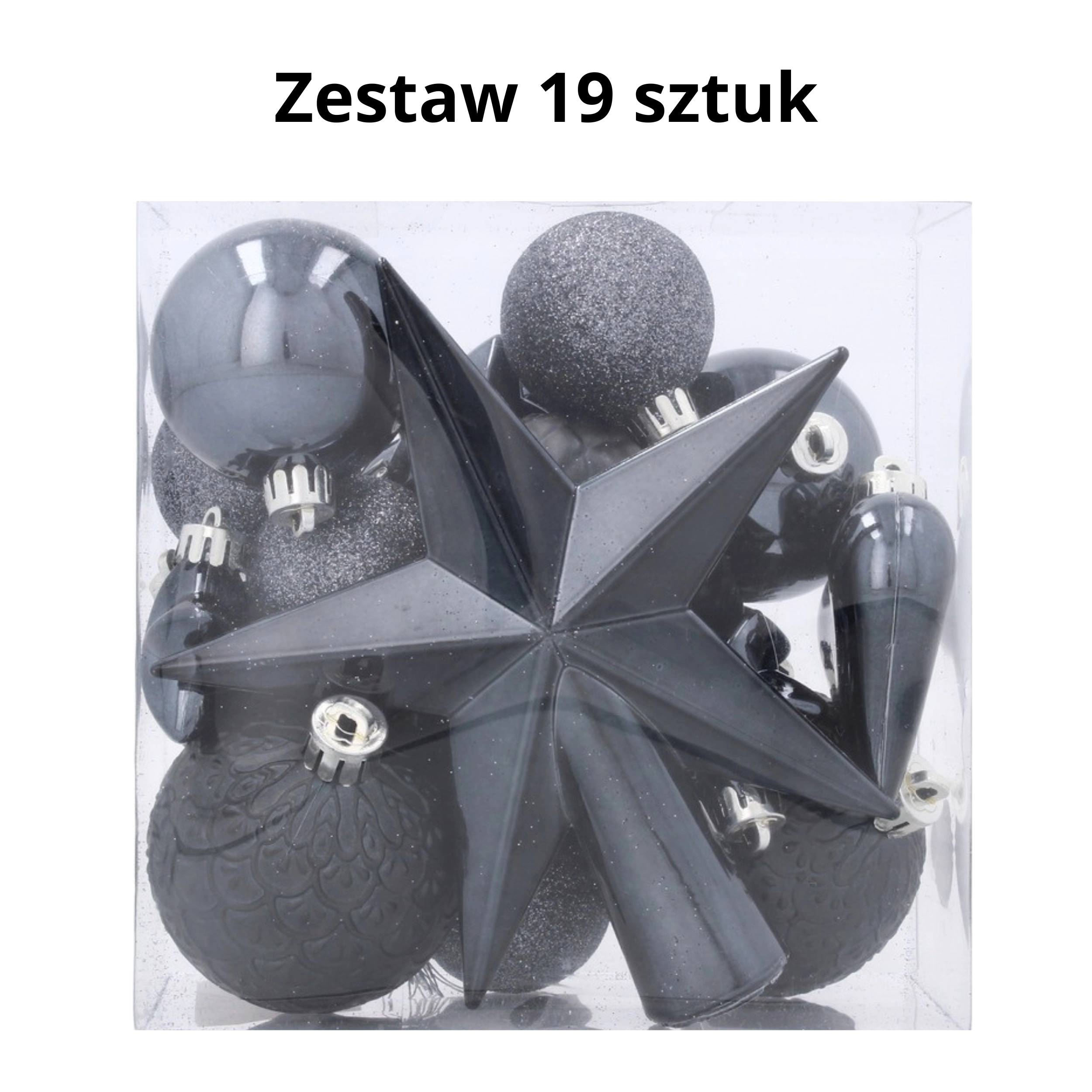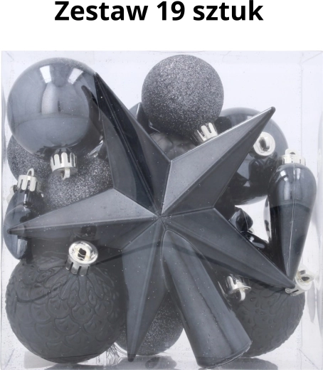 Giv din juleudsmykning et præg af moderne elegance med det eksklusive sæt på 19 antracitfarvede ornamenter KAMAI Christmas Decoration, komplet med en stilfuld stjerne til toppen. Holdbare splintfrie materialer, forskellige størrelser (3–6 cm) og sølvfarvede snore i pakken gør det nemt at dekorere træ, kranse og festlige arrangementer.