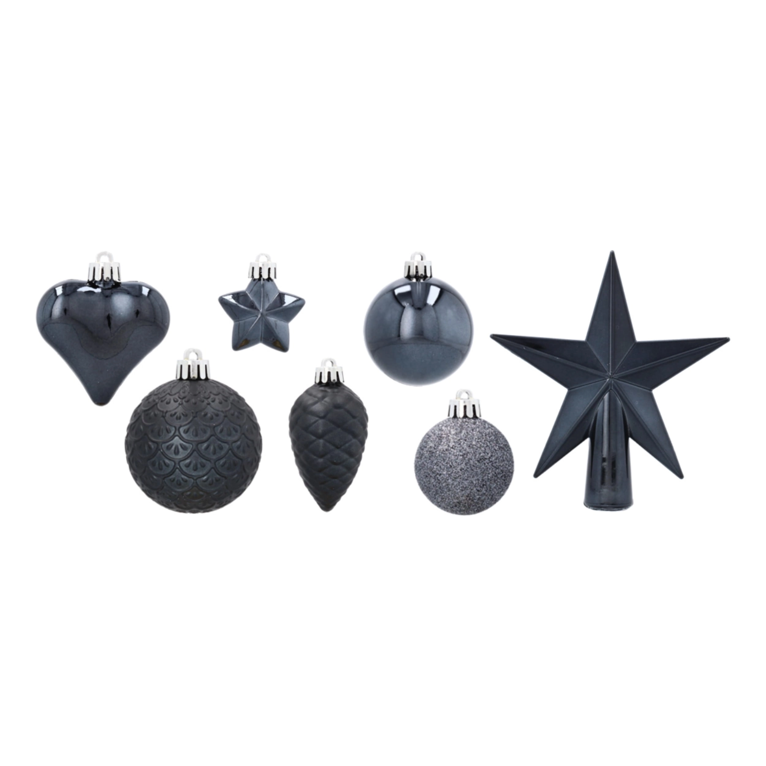 Dette designsæt i den trendy antracit nuance kombinerer matte, blanke og prægede overflader for et perfekt afbalanceret udtryk. Den store stjerne til toppen skaber et markant fokuspunkt og afrunder helhedsindtrykket af dit træ.