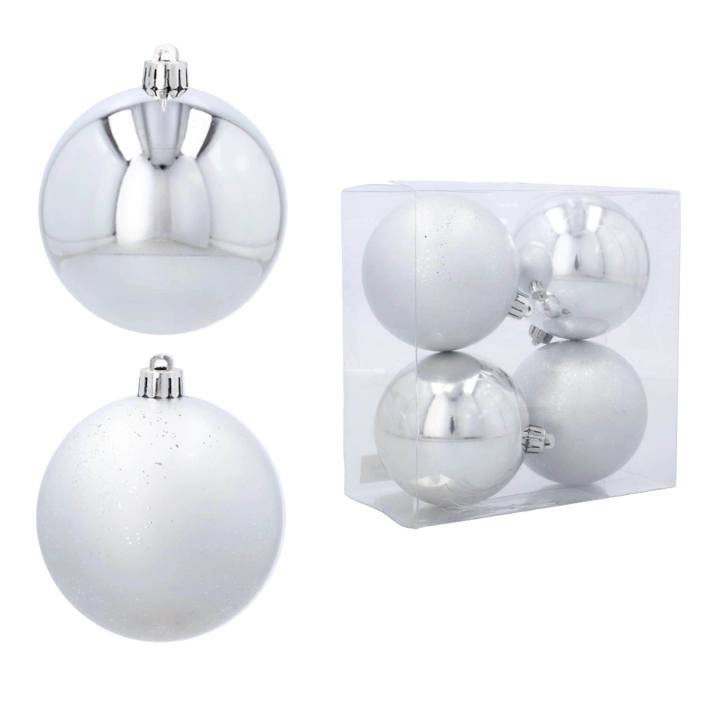 Skab en magisk, festlig atmosfære med et sæt på fire sølvfarvede julekugler med en diameter på 8 cm. To styk har en blank, glat overflade, og to styk har en fin kornet mat overflade for et afbalanceret udtryk uden at dominere med én stil. Kuglerne er lavet af splintsikkert materiale og leveres med sølvfarvede snore for nem ophængning.