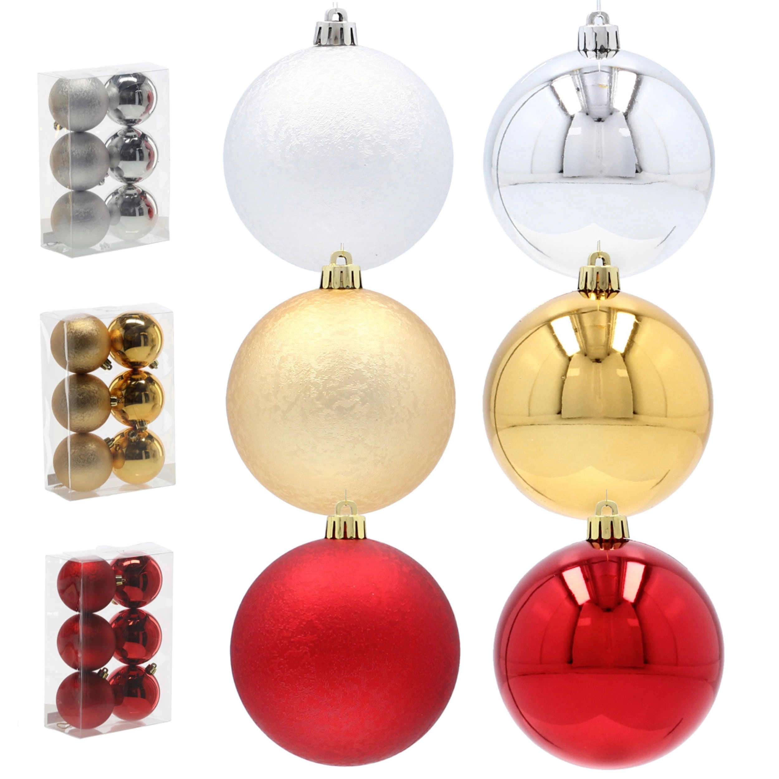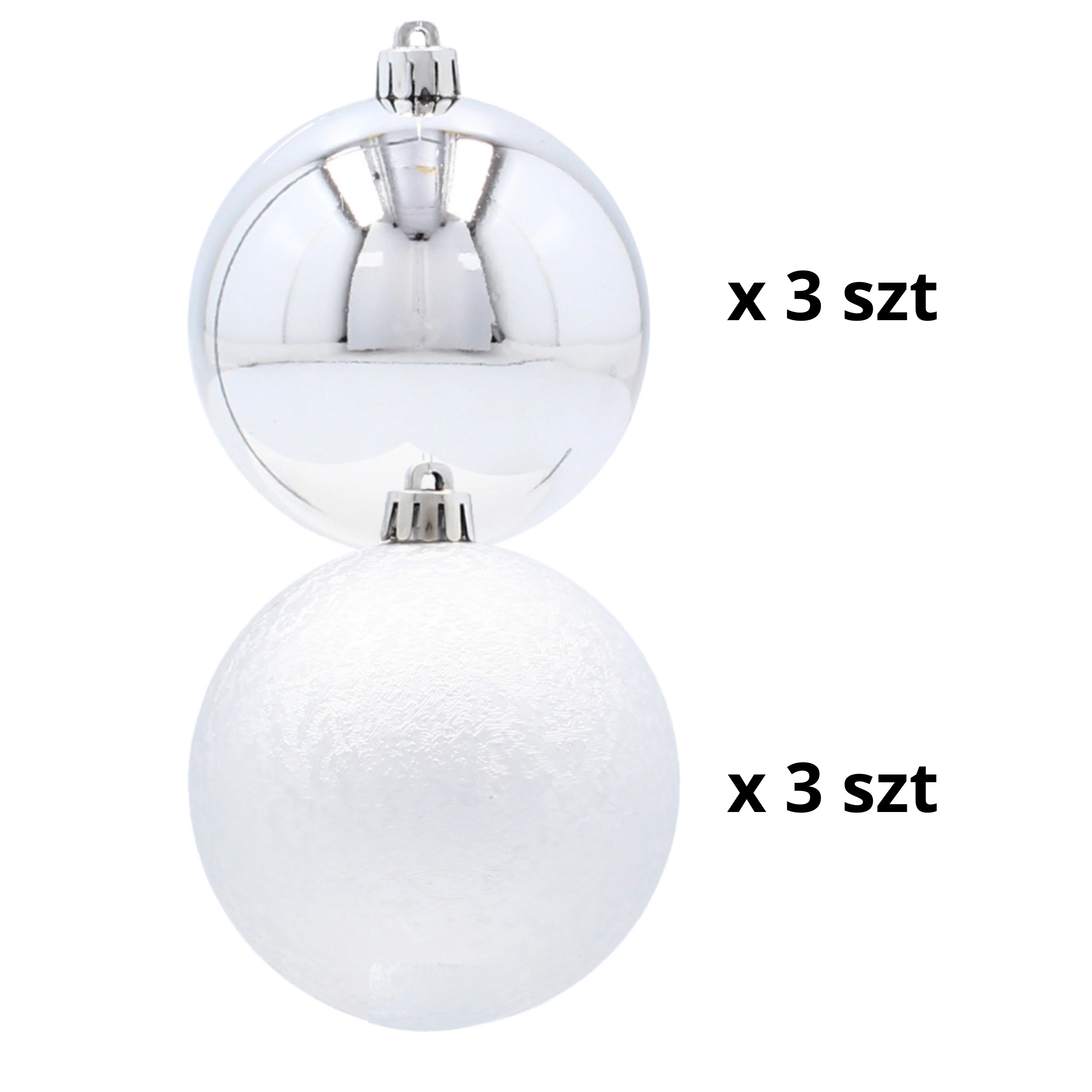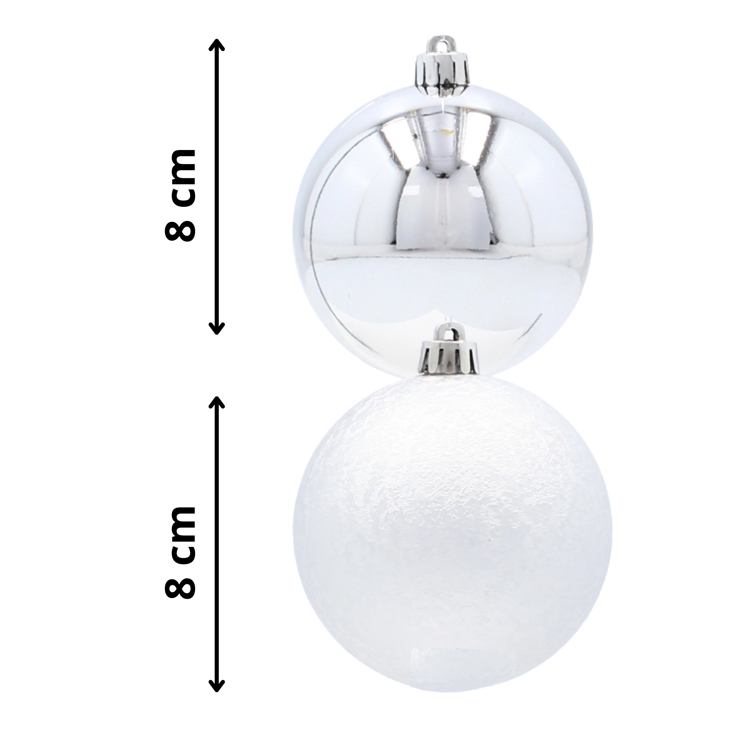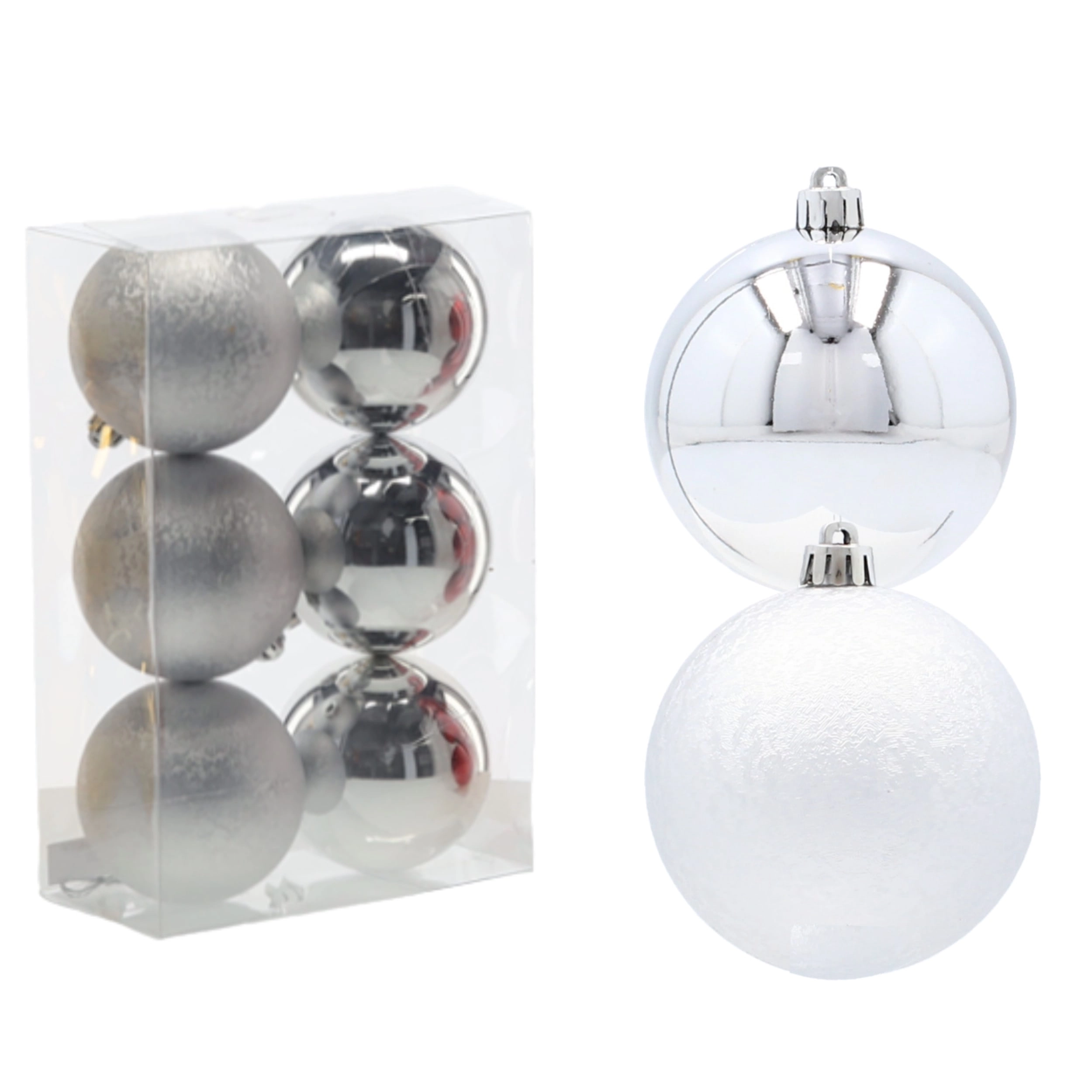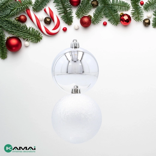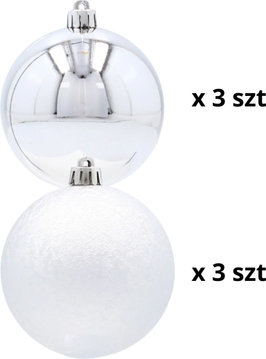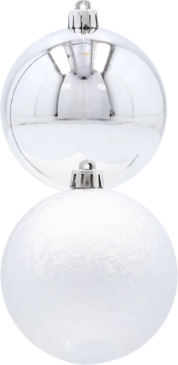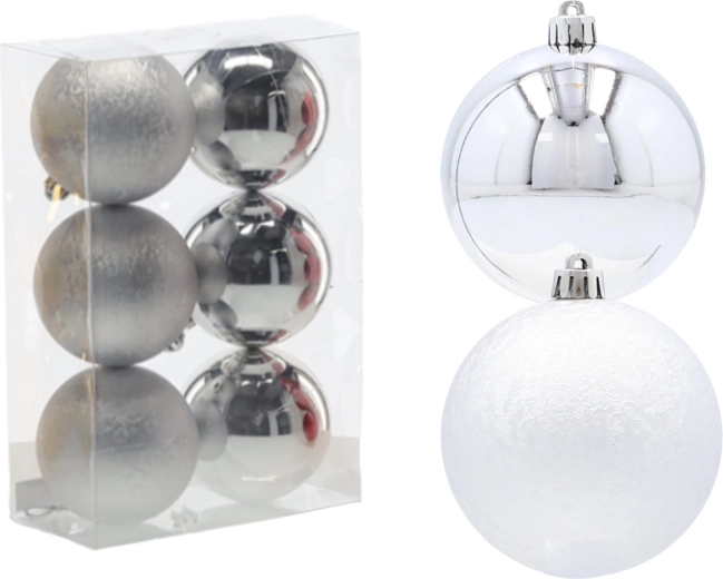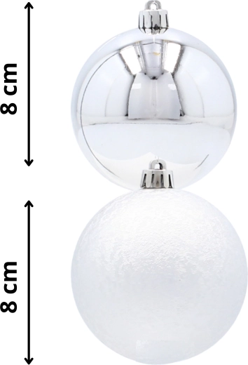Oplev den fine sølvglans og moderne elegance med dette eksklusive sæt af seks julekugler med en diameter på 8 cm. Kombinationen af glat og let struktureret overflade skaber en effektfuld kontrast på træet, mens det uknuselige design sikrer tryghed for både børn og hjem med kæledyr. I pakken medfølger sølvfarvede snore til øjeblikkelig ophængning.