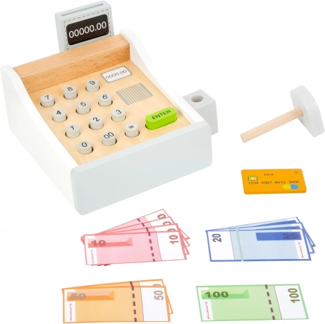 Oplev det kvalitetsrige kasseapparat i træ fra SMALL FOOT, som på en sjov måde lærer børn at tælle, genkende priser og træne sociale færdigheder gennem butikleg. Takket være realistiske elementer som scanner, kortlæser og pengeskuffe virker legen autentisk og motiverer til aktiv og meningsfuld leg.