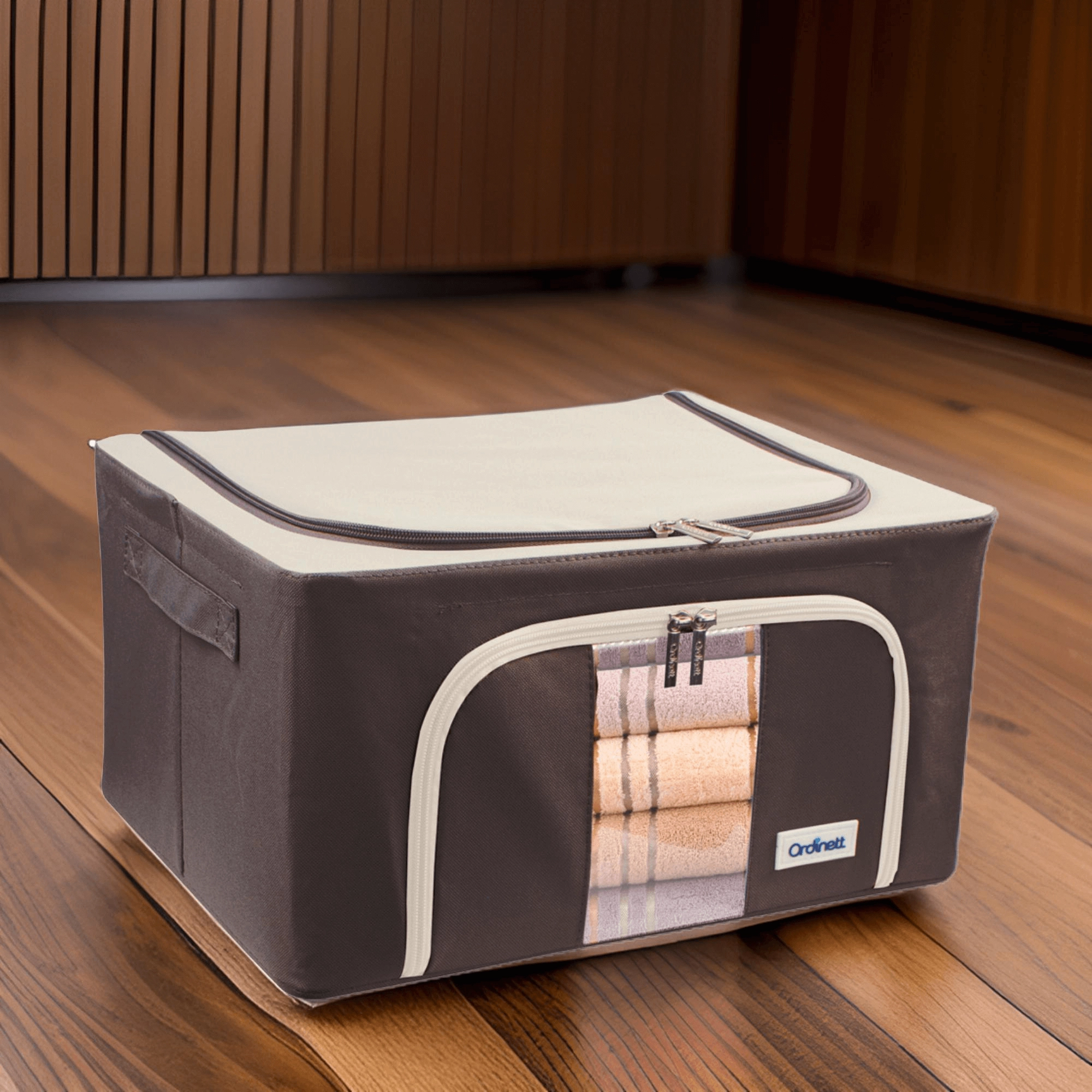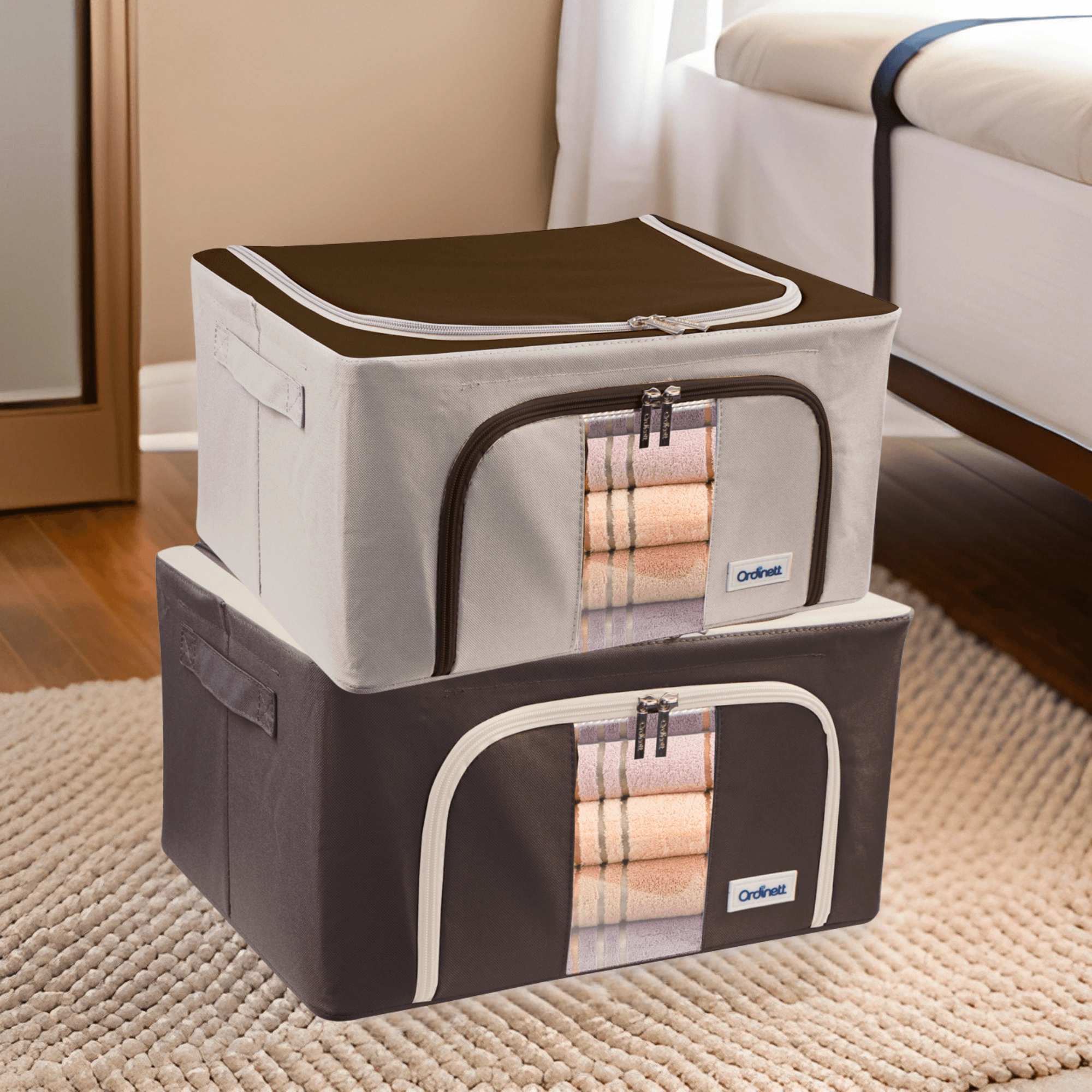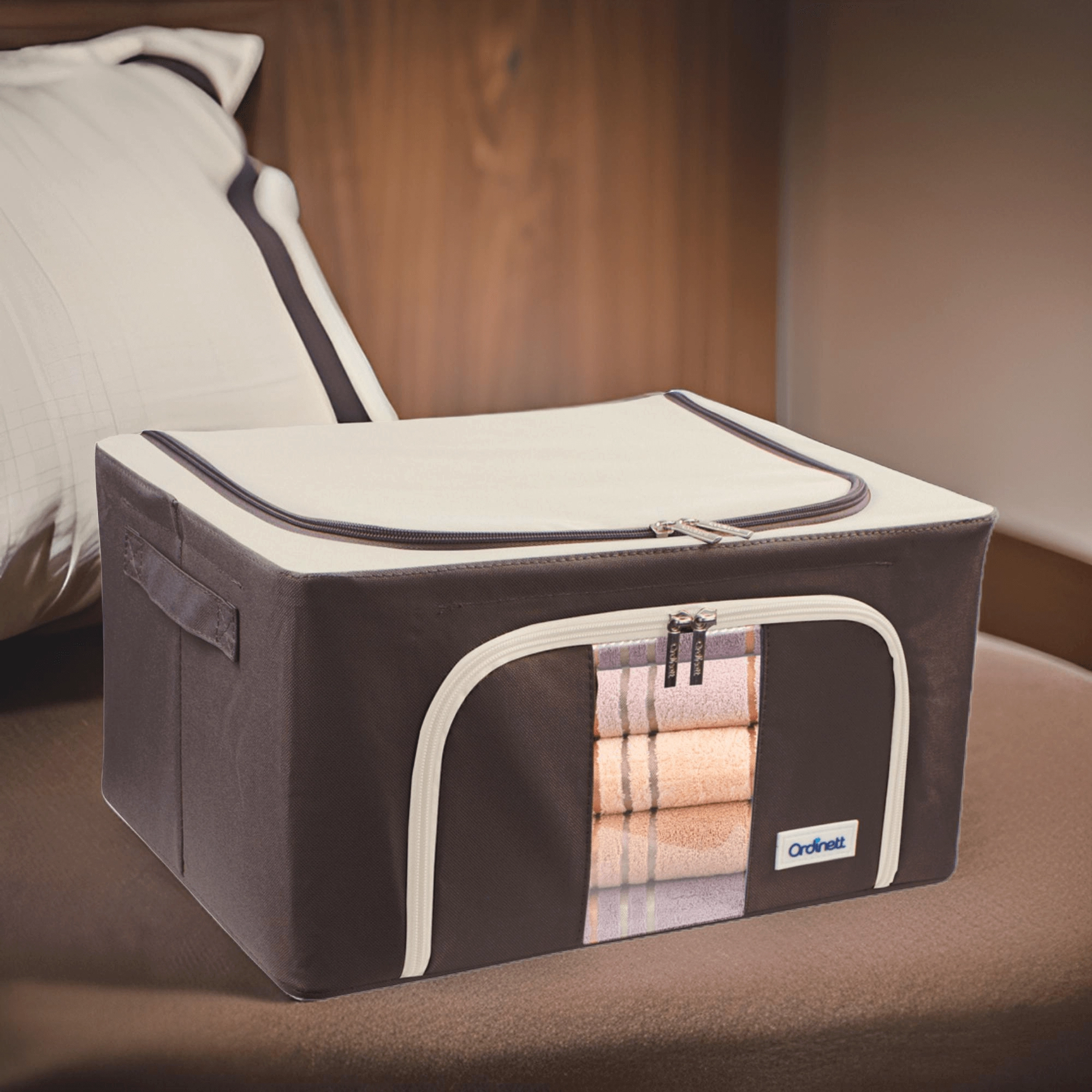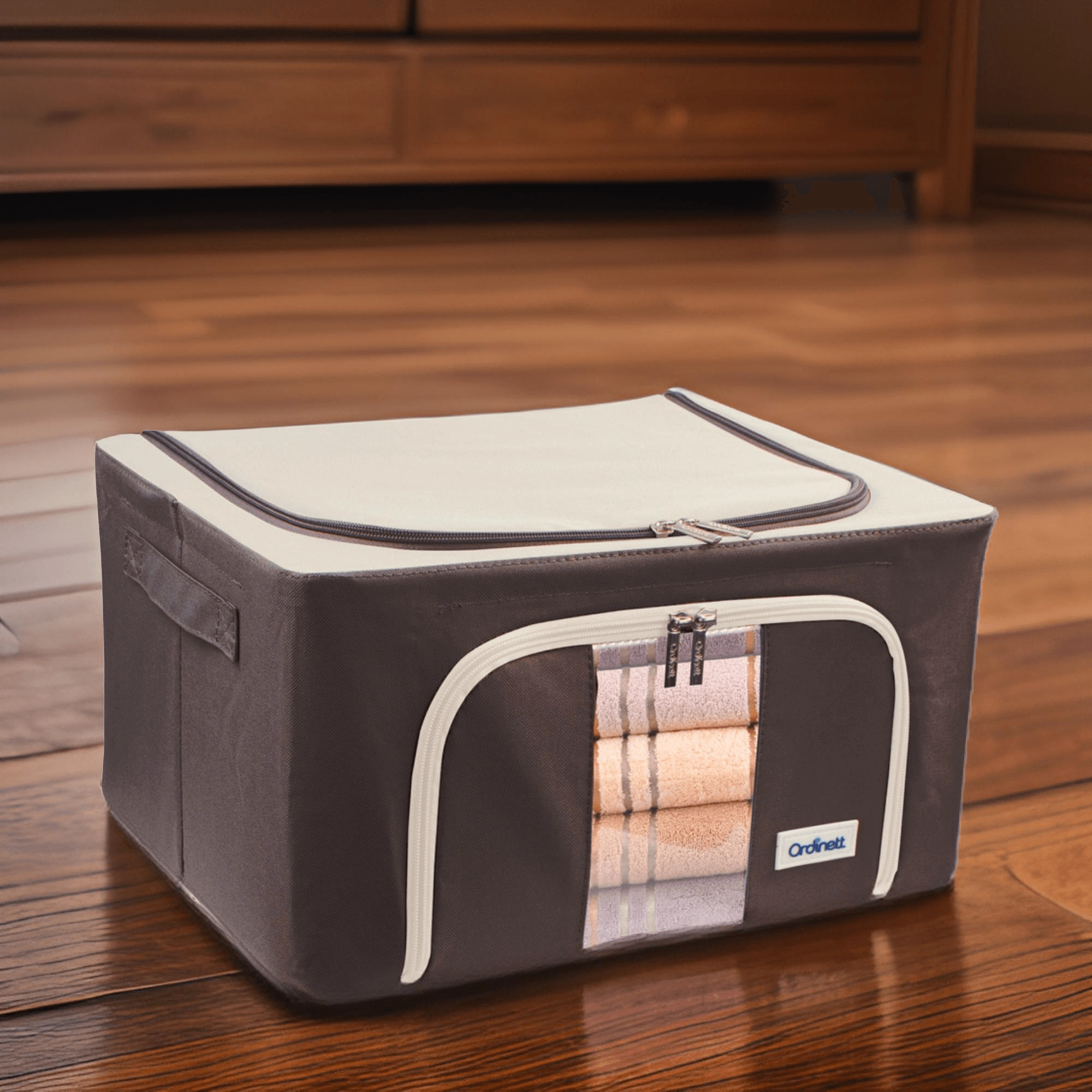 Du vil også sætte pris på dobbelt åbning – øverste og forreste lynlås – for hurtig adgang både fra hylden og under sengen. Sidehåndtag gør håndtering og transport nemmere. Det tidløse farvedesign passer til garderobe, soveværelse, stue og børneværelse.