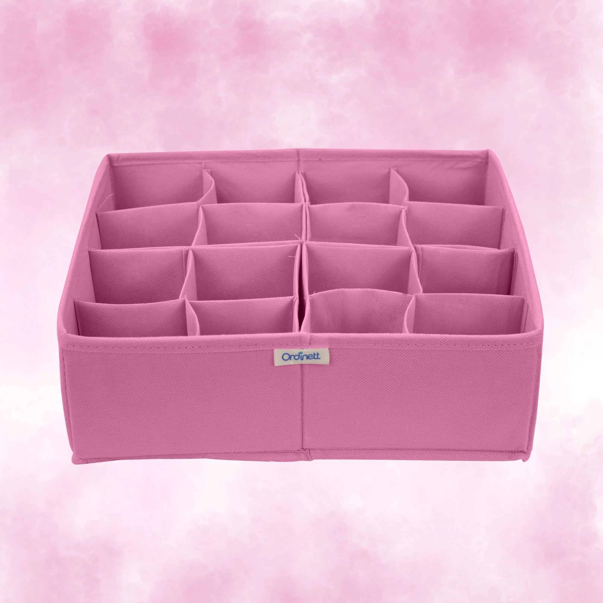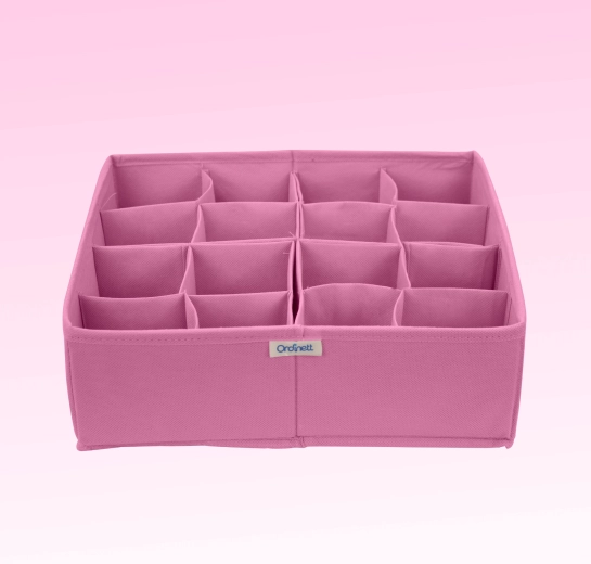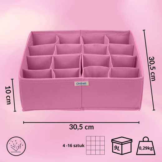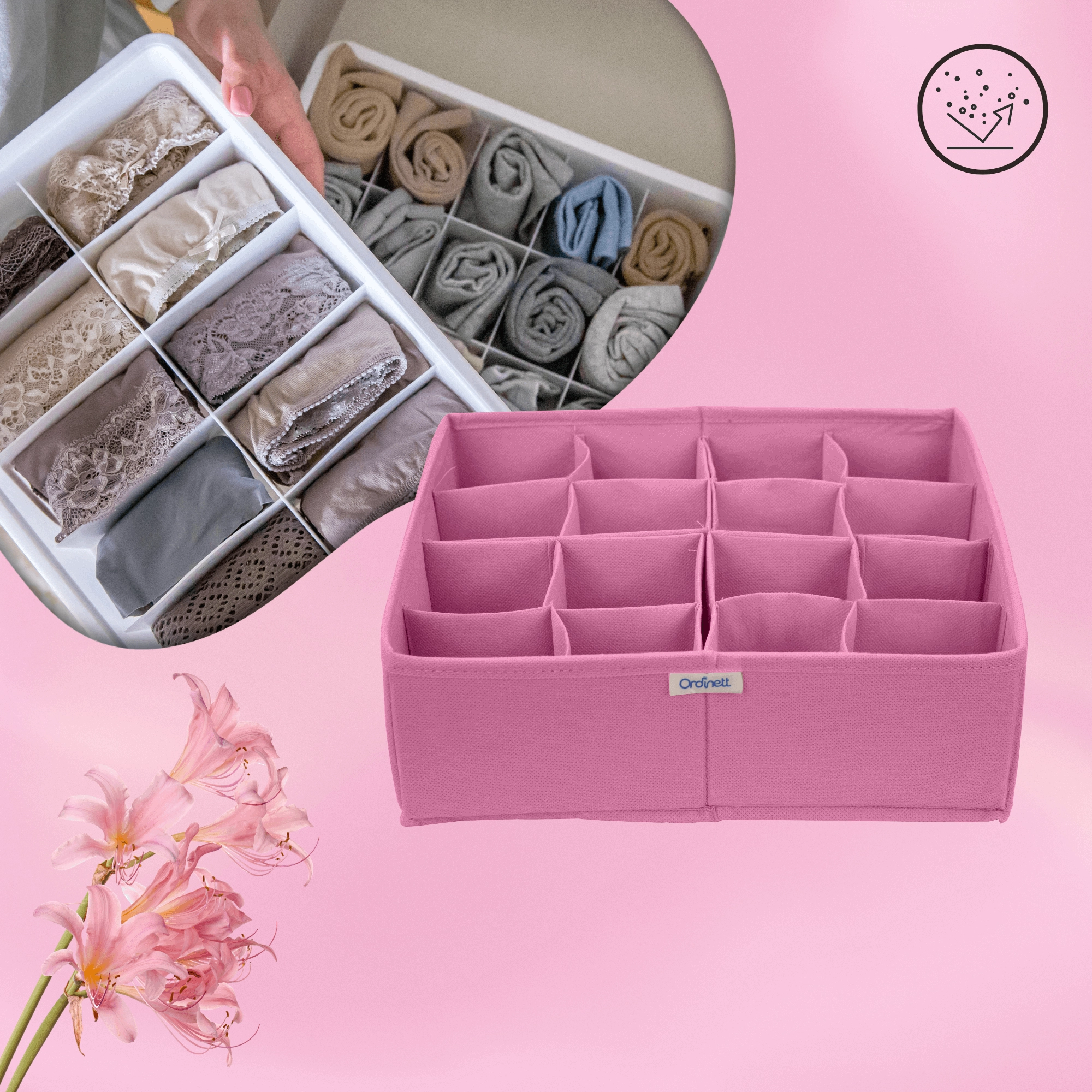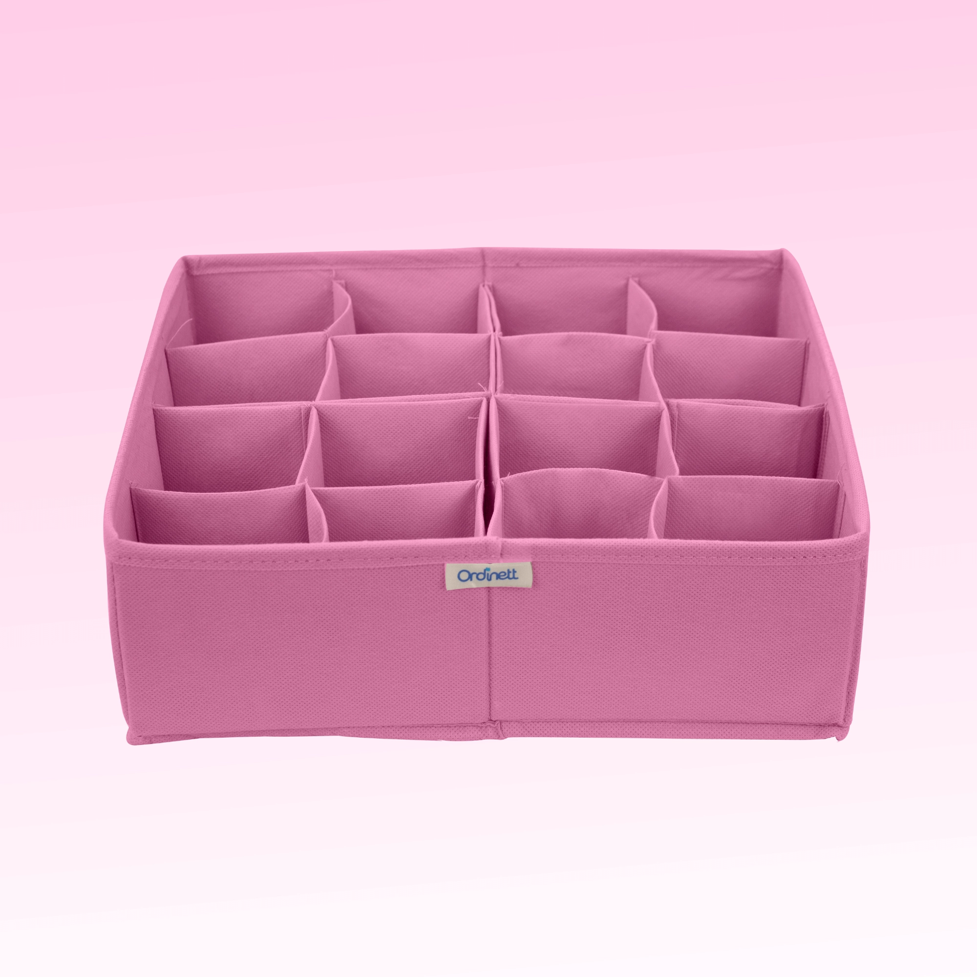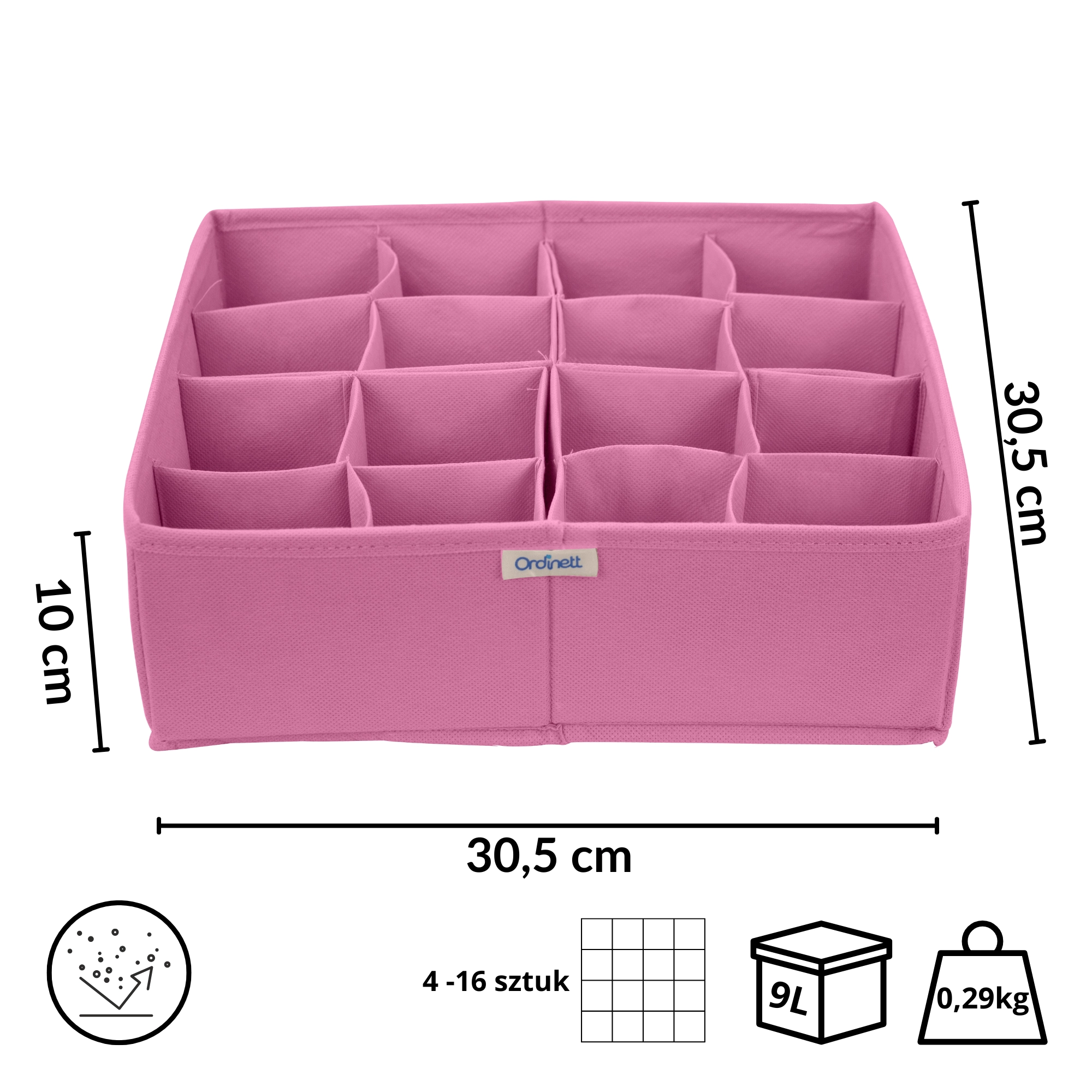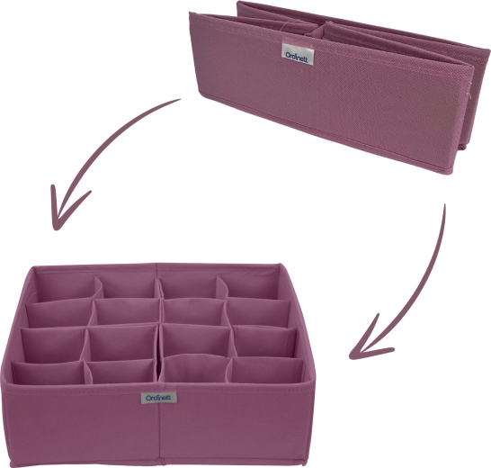 Få styr på dine skuffer én gang for alle. Tekstilorganizeren BLOSSOM tilbyder 16 rum til overskuelig opbevaring af strømper, undertøj, tilbehør og kosmetik. Den har et kompakt kvadratisk format 30,5 × 30,5 × 10 cm, er sammenklappelig, let og lavet af slidstærkt non-woven tekstil i elegant rosa.
