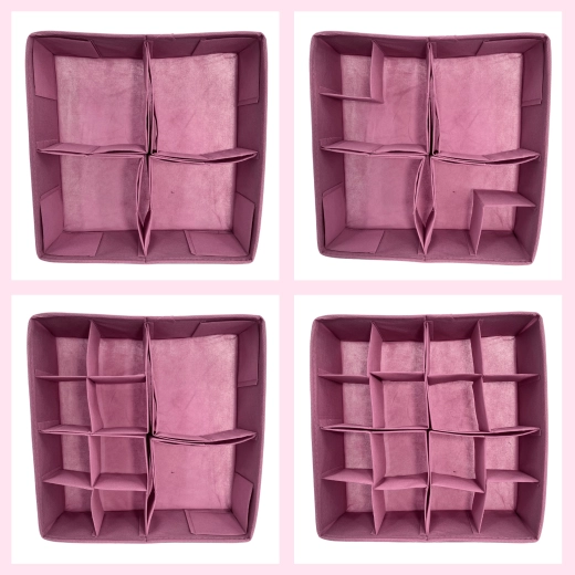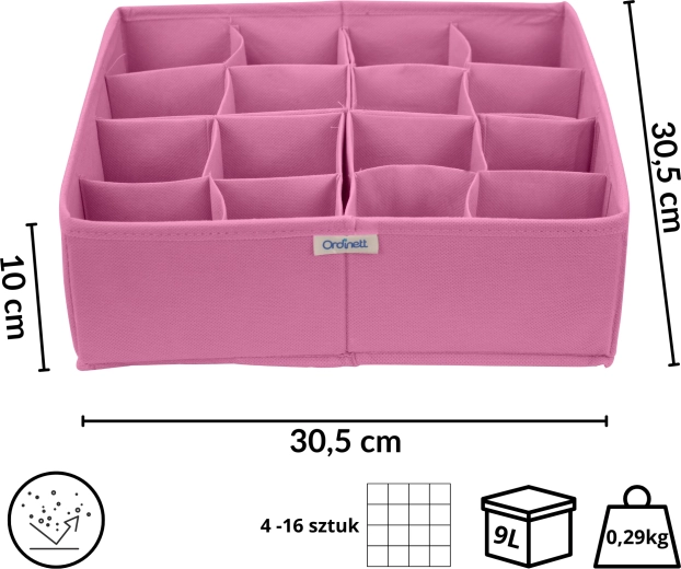 Det praktiske kvadratiske format 30,5 × 30,5 × 10 cm passer perfekt i kommoder, garderobeskabe og kontorskuffer. Når du ikke behøver den, kan du nemt folde den sammen og spare plads. Den rosa farve giver indretningen et frisk pust og understøtter nem sortering.