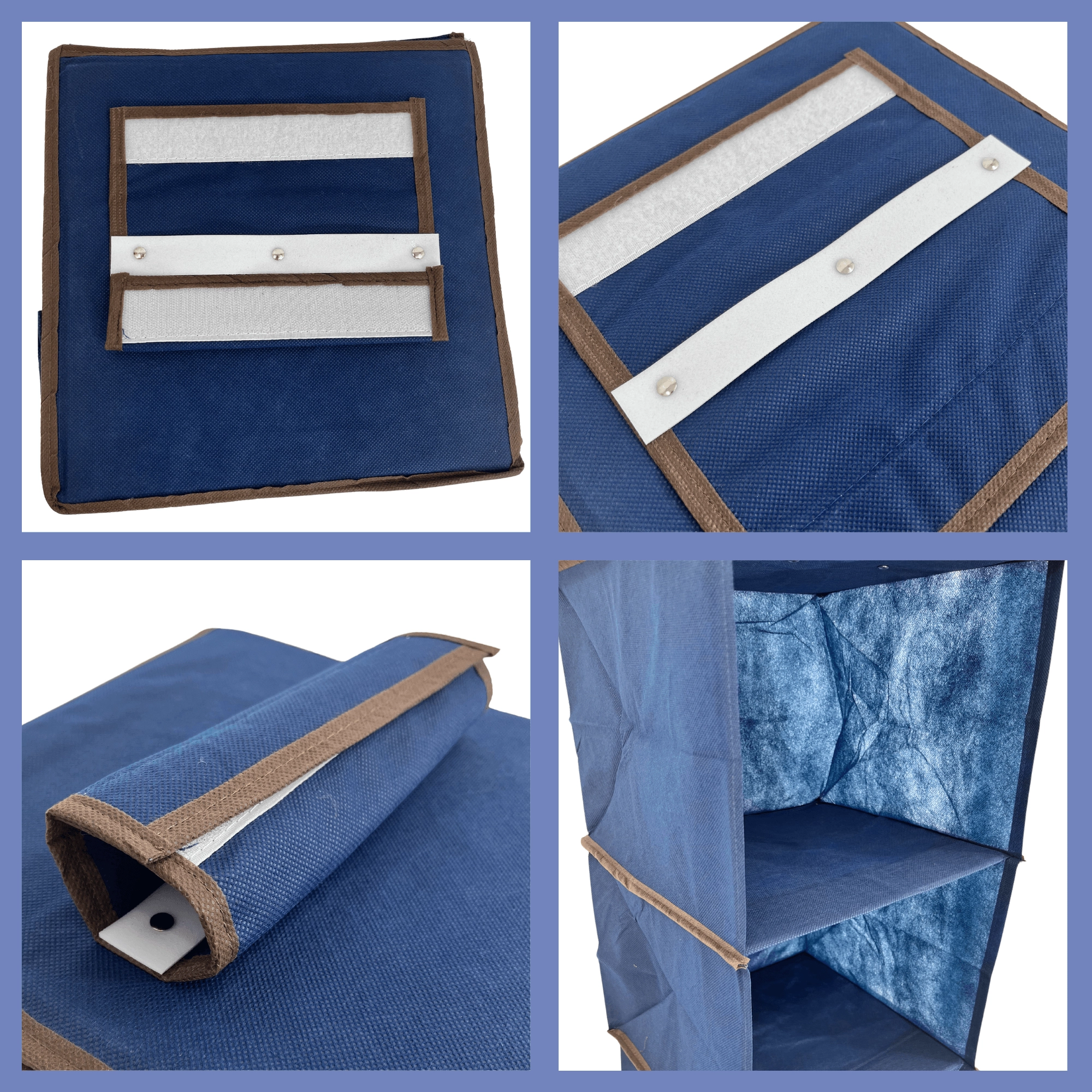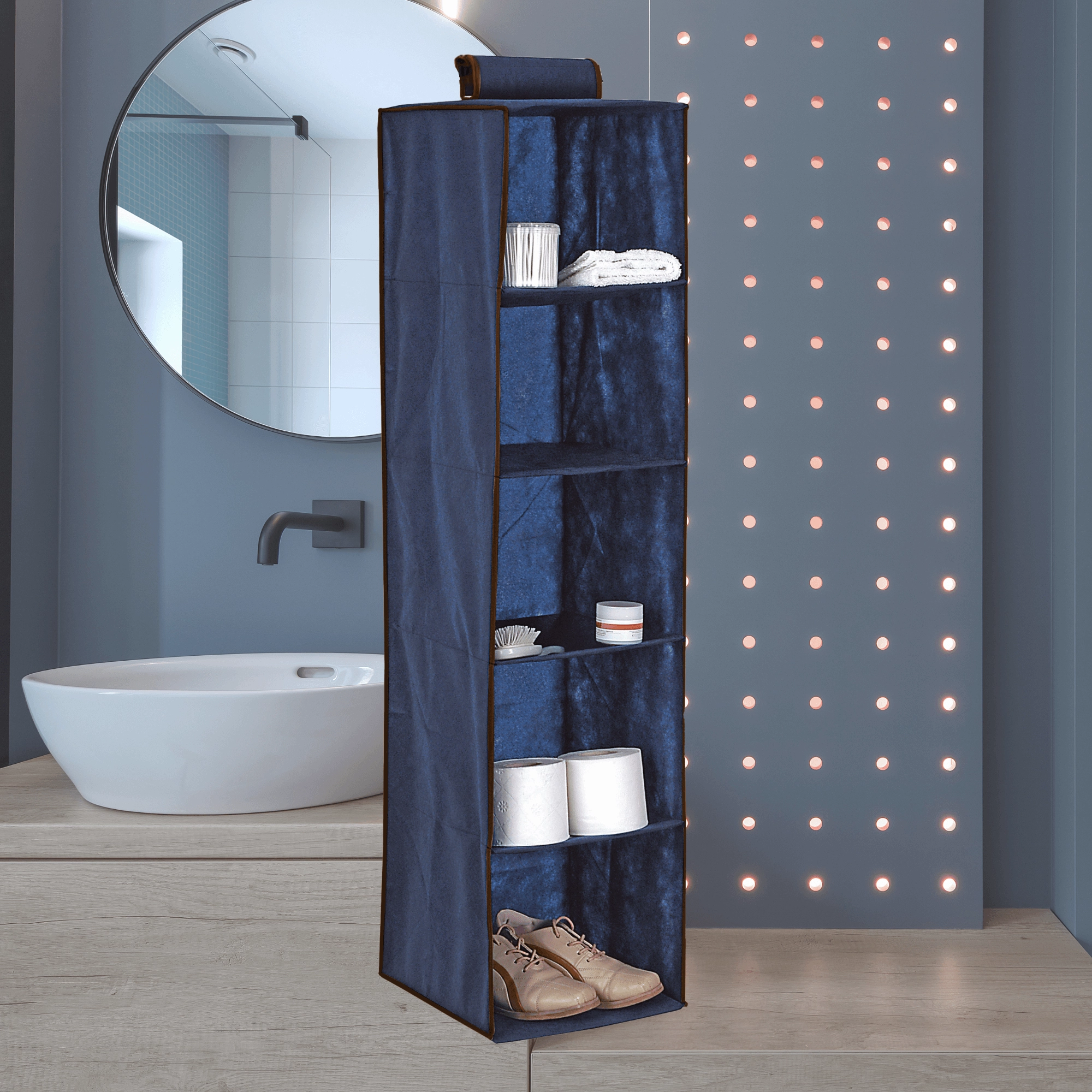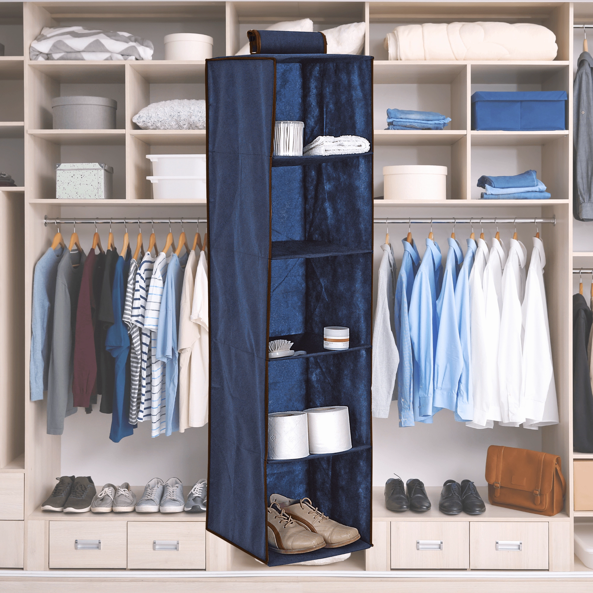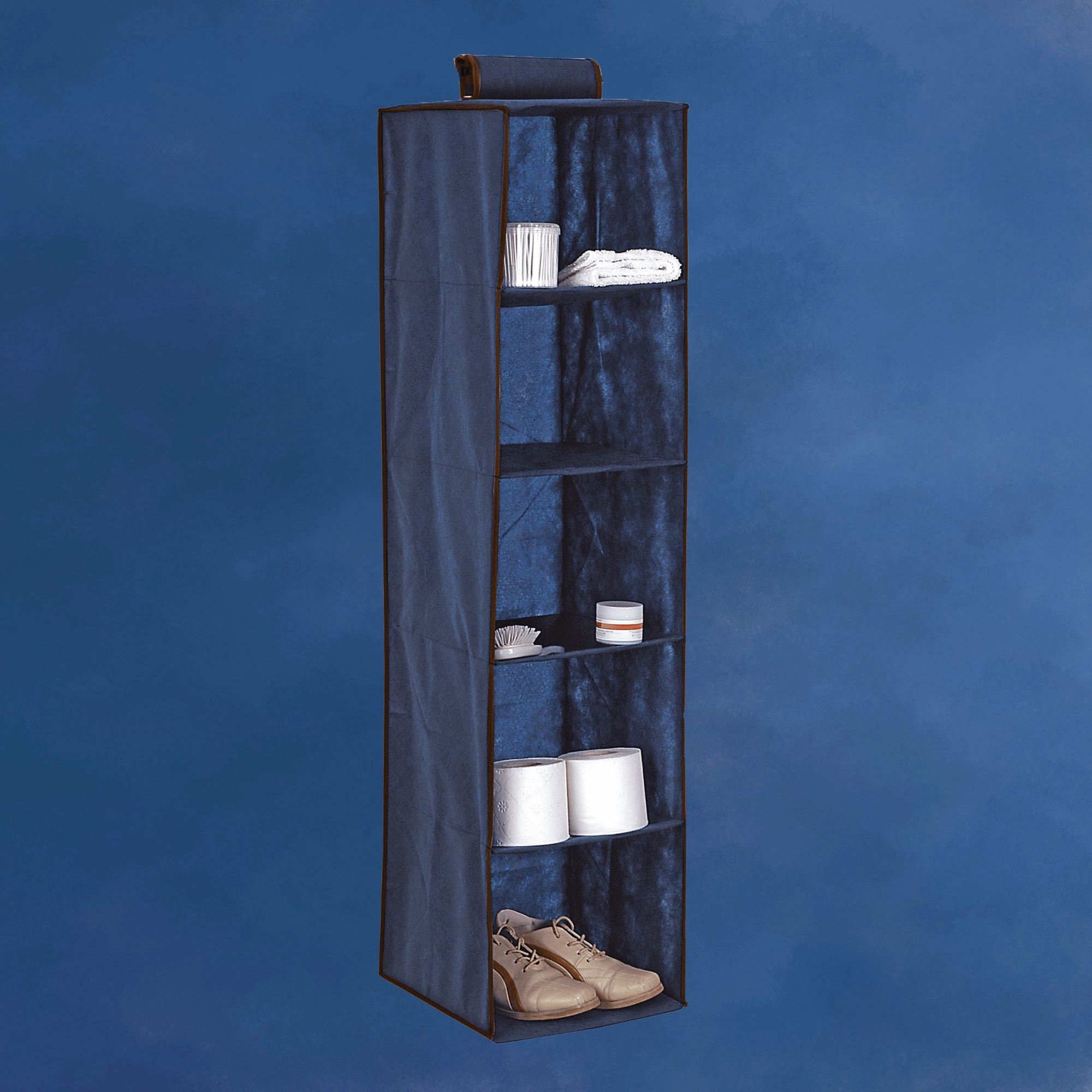 Praktisk blå hængende skabsorganisator med fem hylder i målene 30 × 30 × 120 cm, der hjælper dig med at udnytte den lodrette plads smart og holde alting overskueligt lige ved hånden. Takket være det åbne design har du øjeblikkelig adgang til tøj, håndklæder og tilbehør, mens den lette nonwoven-tekstil sikrer nem håndtering og montering. Enkel ophængning på garderobestang uden værktøj og en stabil konstruktion gør denne organisator til en ideel løsning til hurtig opbevaring – også af større beklædningsgenstande.
