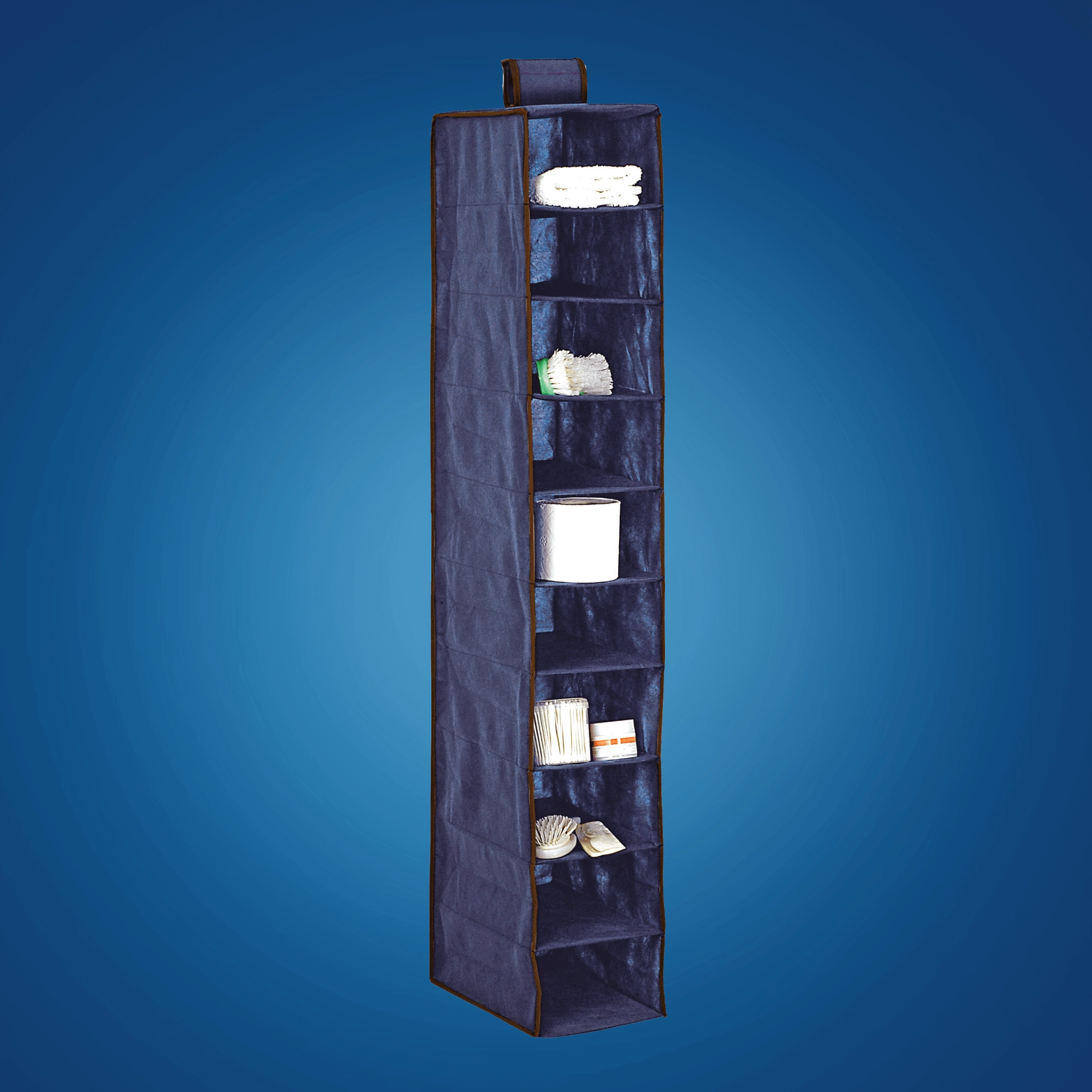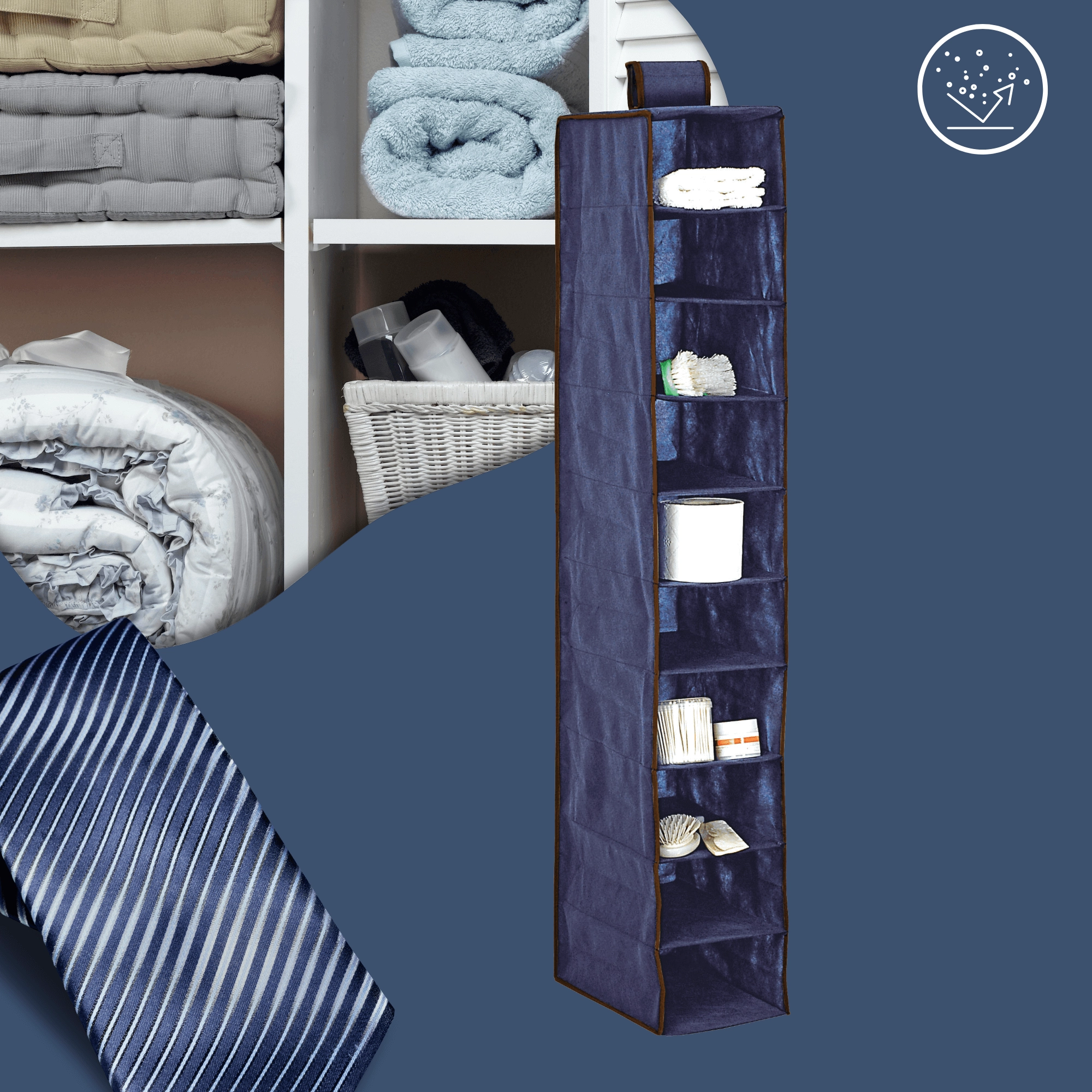 Denne hængende organisator udnytter den lodrette plads i skabet maksimalt og hjælper dig med at holde alting synligt og organiseret. Takket være de åbne rum finder du straks sweatre, pyjamas, håndklæder, huer og andre småting. Den mørkeblå farve passer let ind i indretningen og giver skabet et ryddeligt udtryk.
