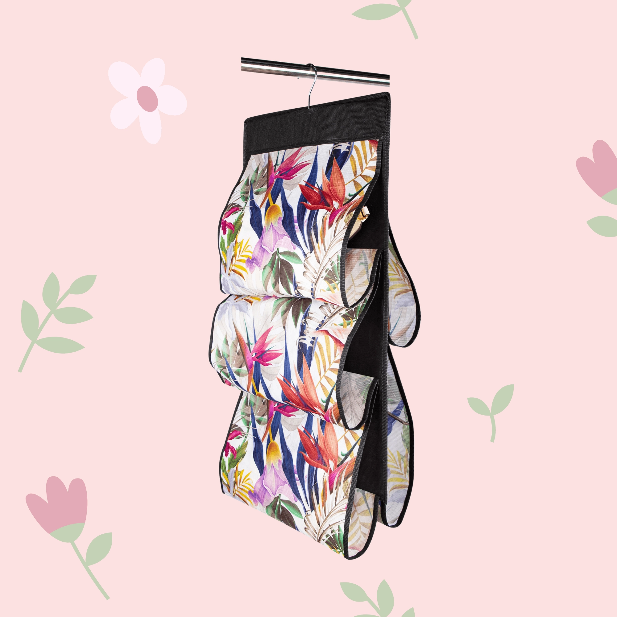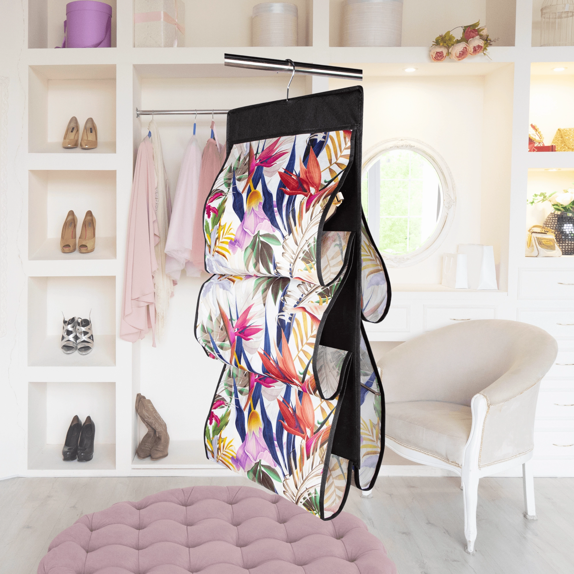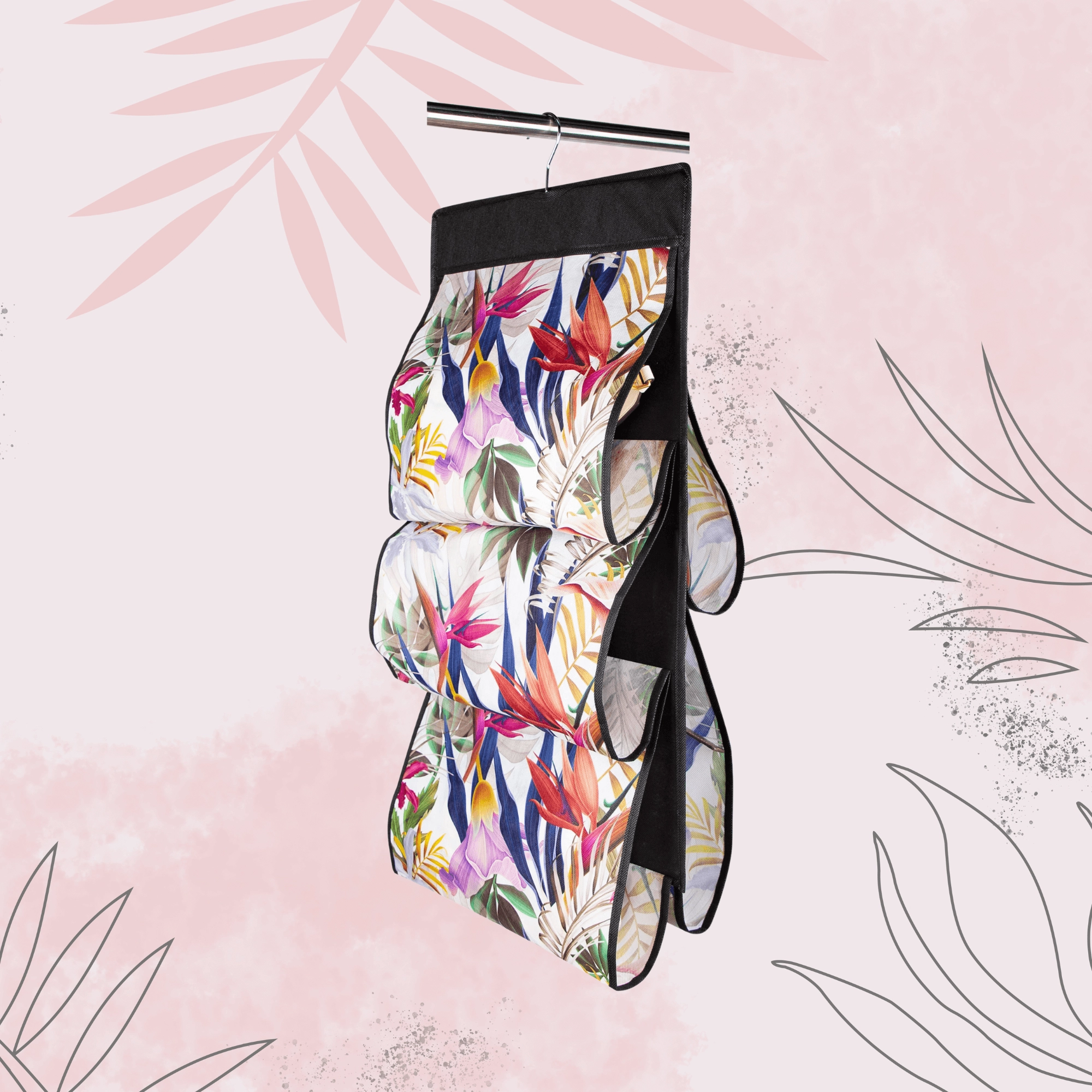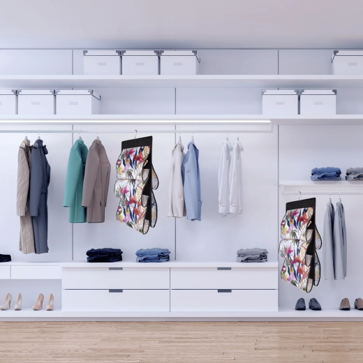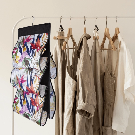 Montering tager få sekunder – hæng den blot på garderobestangen. Det blomstrede motiv i livlige farver tilfører garderoben friskhed og stil, uanset om du placerer den i soveværelset, walk-in-closet eller entré.