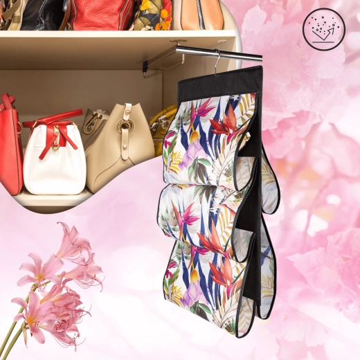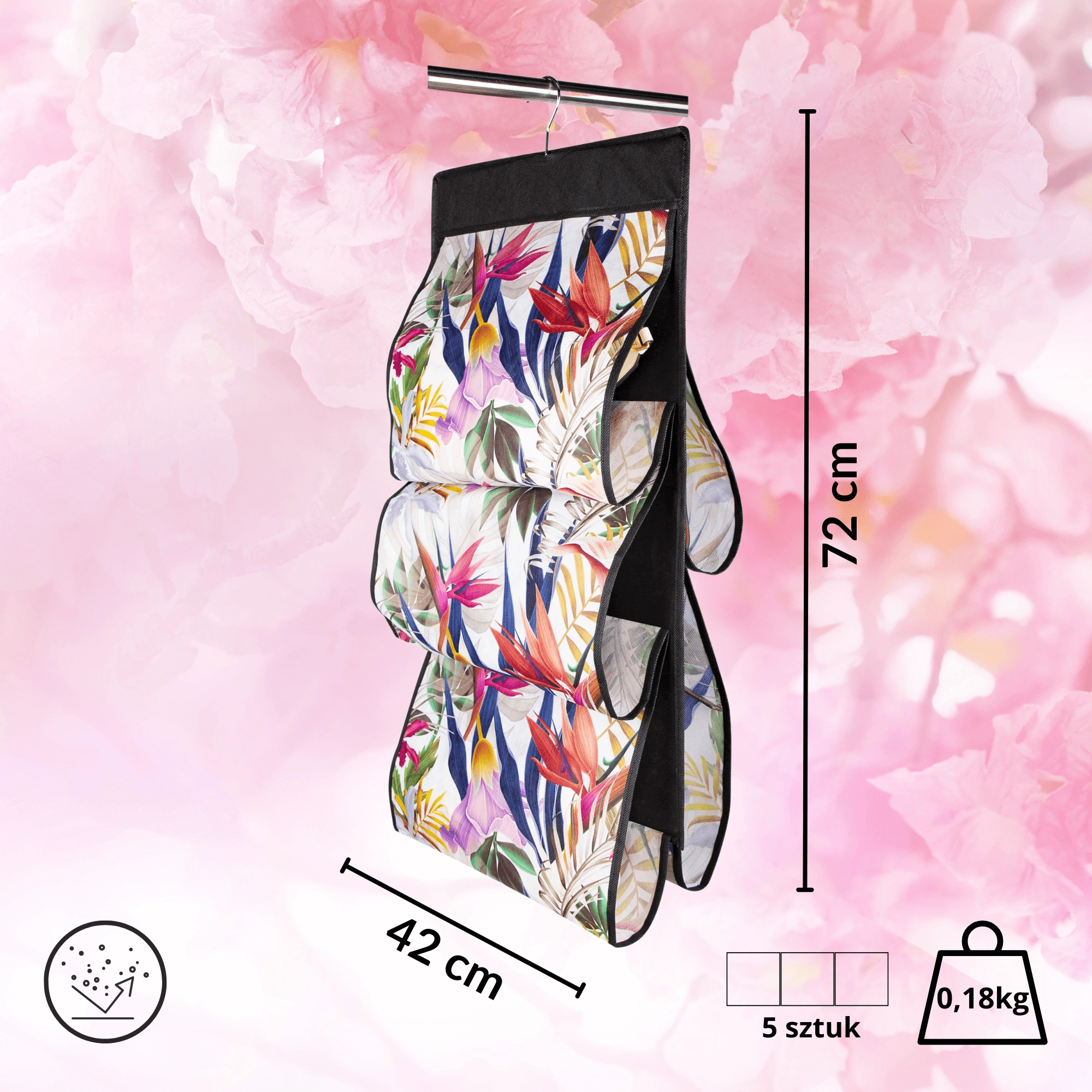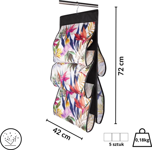 Den hængende organizer FLORAL er en smart løsning til vertikal opbevaring af håndtasker og tilbehør. Med fem overskuelige lommer har du alt lige ved hånden, og skabet forbliver ryddeligt. Det luftige og slidstærke nonwoven-tekstil af PET beskytter mod støv og slidmærker, samtidig med at det er let og nemt at vedligeholde.