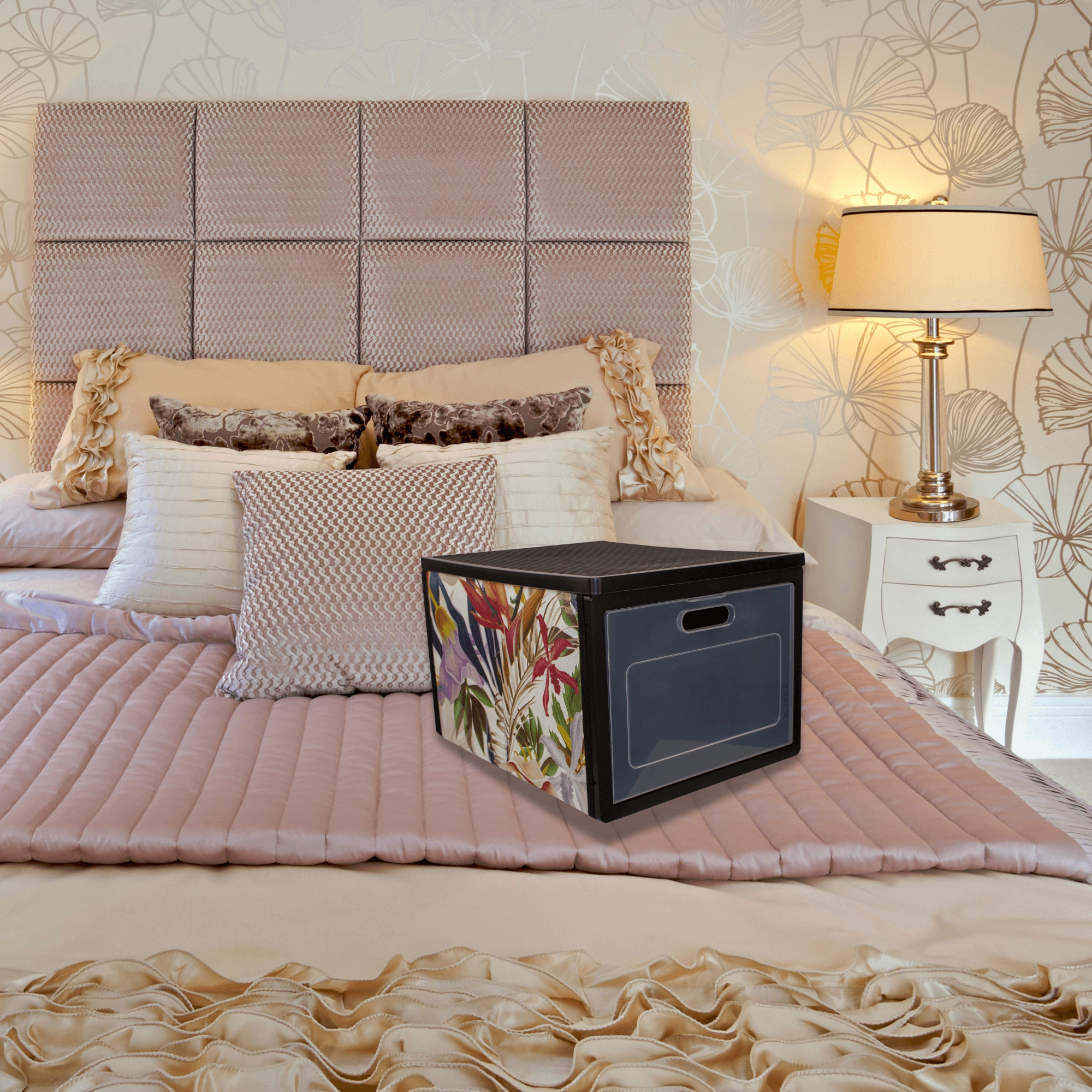 En stilfuld organizer fra kollektionen FLORAL hjælper dig med at holde orden i garderoben og hjemmet. Har forreste gennemsigtige låger for hurtig adgang uden at trække boksen ud, er sammenklappelig, let og fremstillet af holdbart nonwoven PET. Ideel til tøj, sengetøj, accessories og dokumenter.