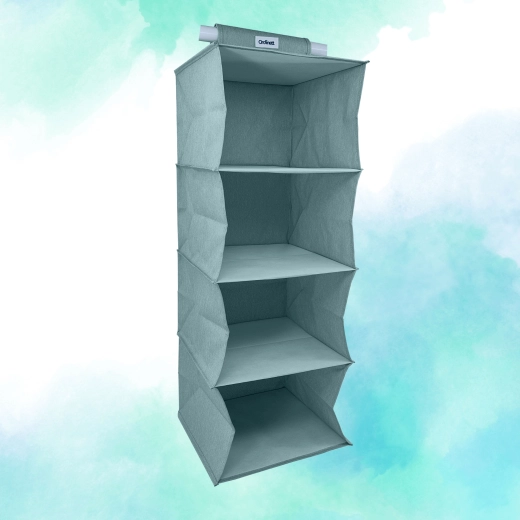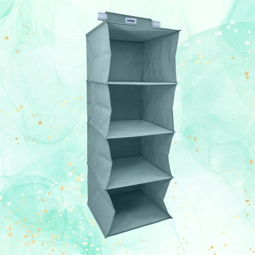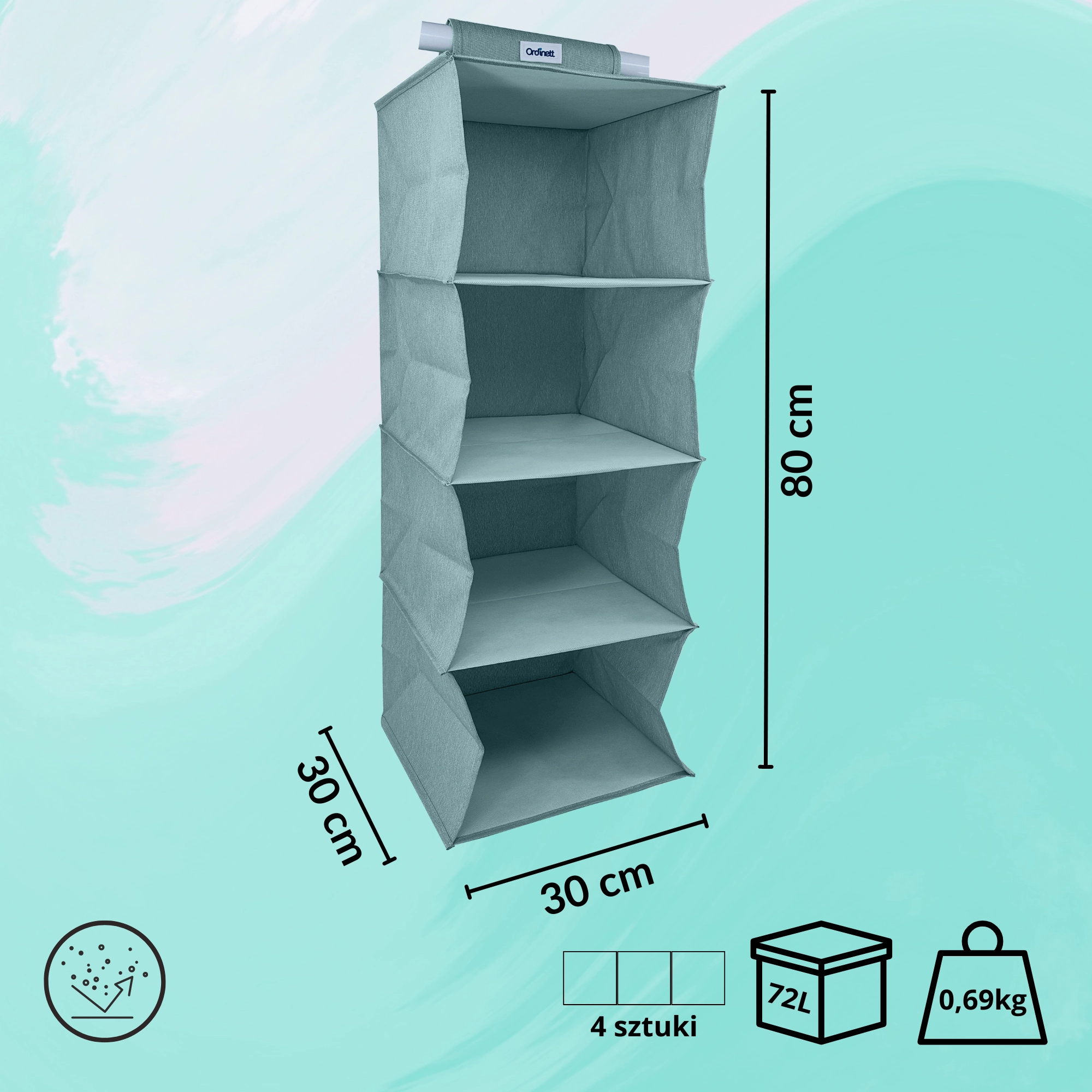 Få styr på garderoben på ingen tid. Denne mintfarvede hængeorganizer med 4 rummelige hylder i holdbart polyester hjælper dig med at maksimere den lodrette plads, have tøj og tilbehør overskueligt lige ved hånden og holde skabet rent og organiseret.