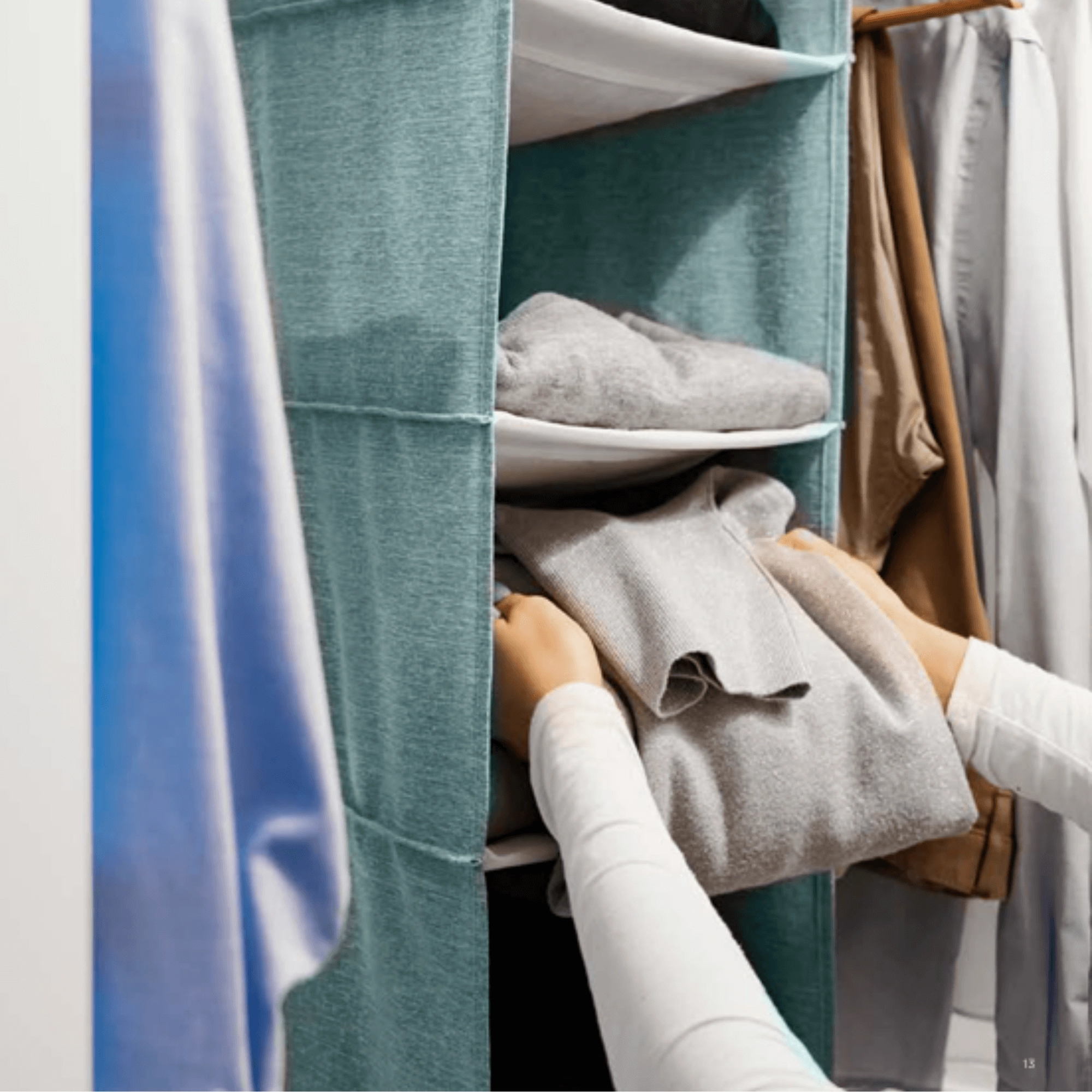 Den mintfarvede tone giver interiøret friskhed og renhed, mens den sammenfoldelige konstruktion sparer plads, når organiseren ikke er i brug. Ideel til walk-in, soveværelse, børneværelse og badeværelse.
