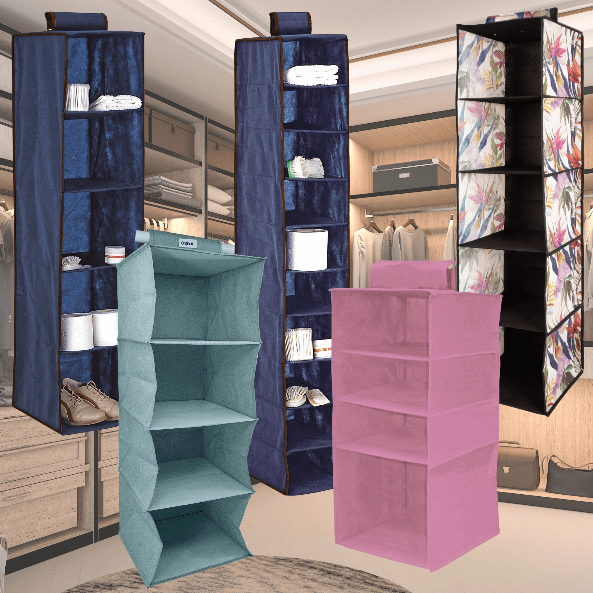 Den hængende skabsorganizer er en smart løsning til daglig orden. Takket være den lette tekstilkonstruktion og fastgørelsen med velcro monteres den nemt på garderobestangen. Fire forstærkede hylder holder sikkert på sweatre, T-shirts, undertøj, accessories og håndklæder.