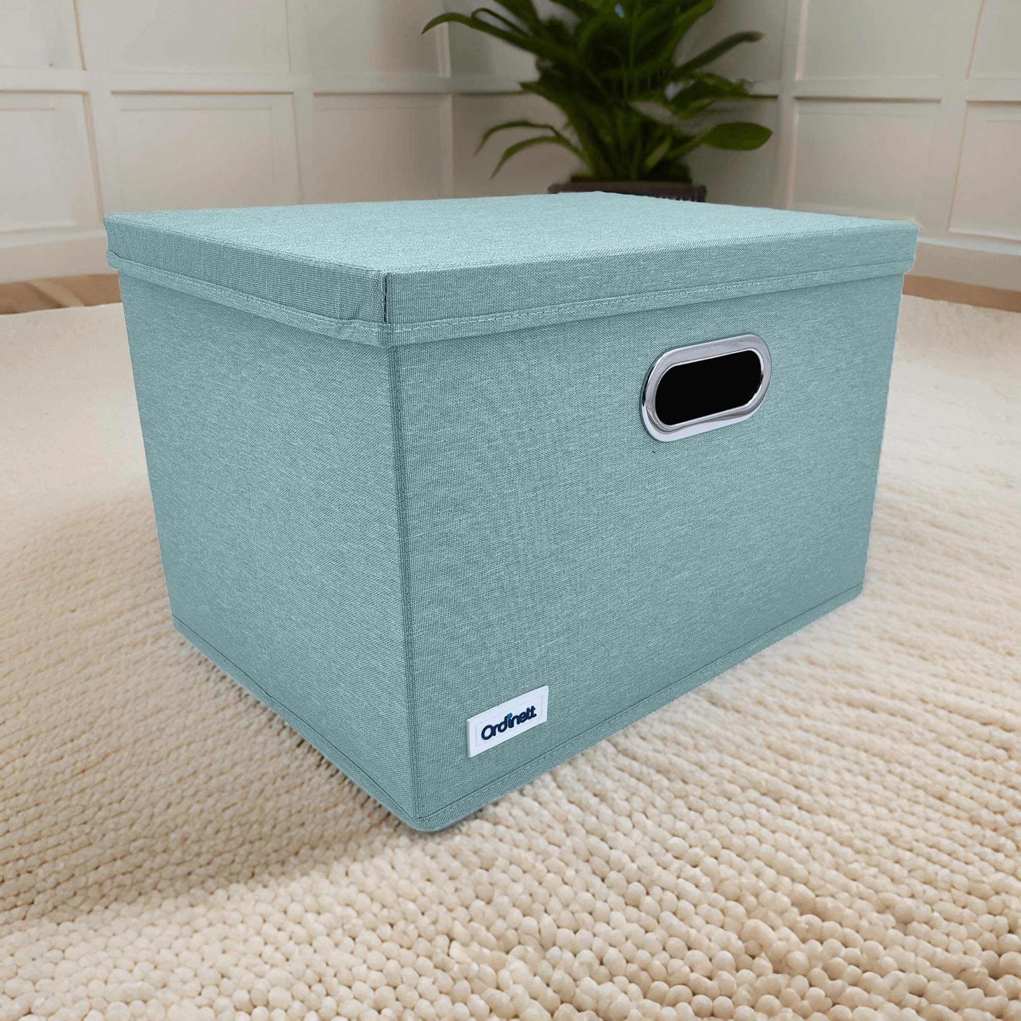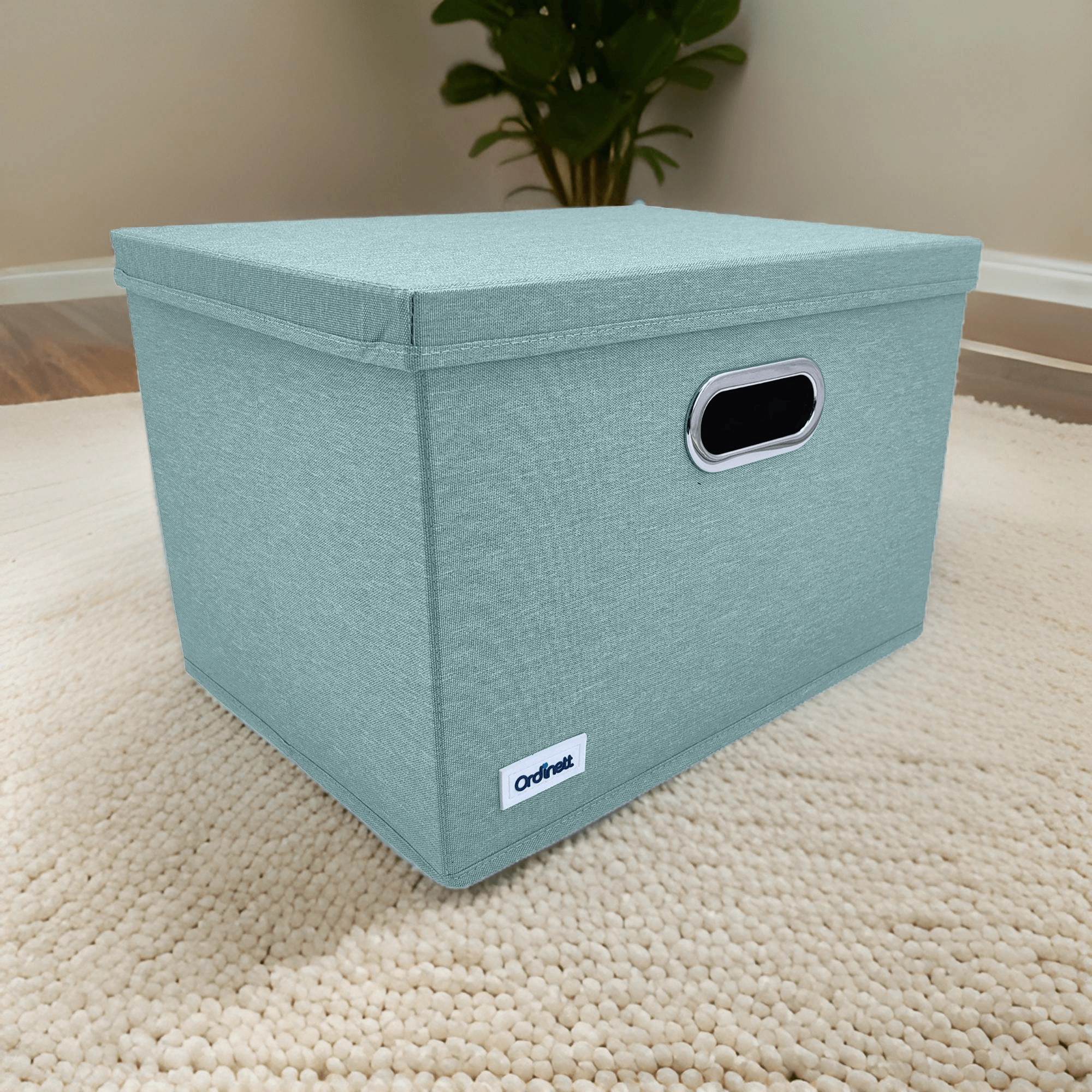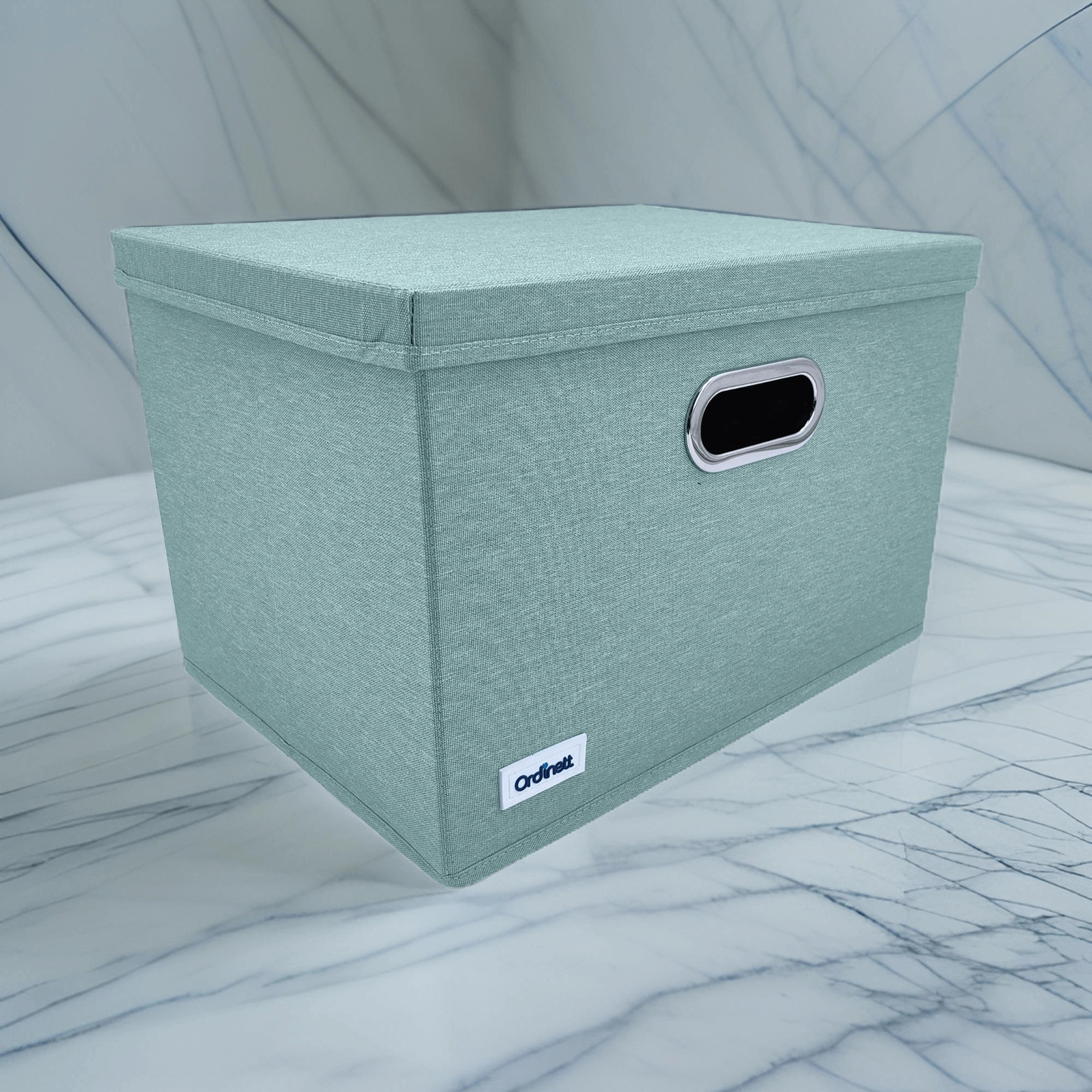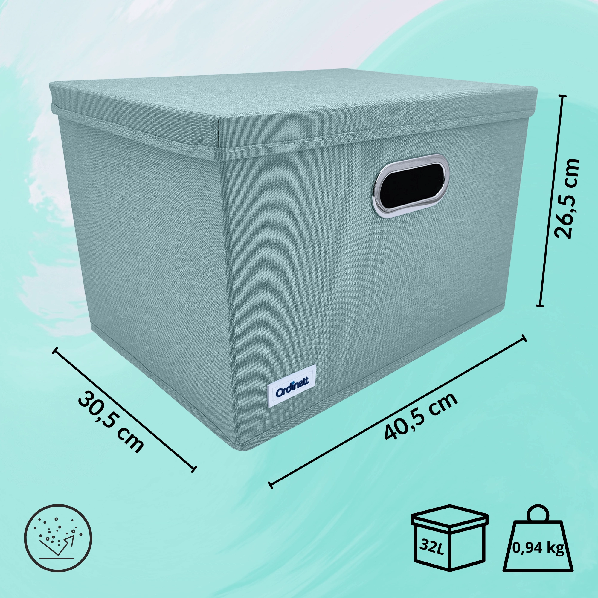Denne praktiske boks i mintgrøn bringer straks orden og ro til dit hjem. Det aftagelige, solide låg beskytter indholdet mod støv og indblik, mens de ovale håndtag med metalforstærkning gør det nemt at trække den ud af skabet eller fra hylden.