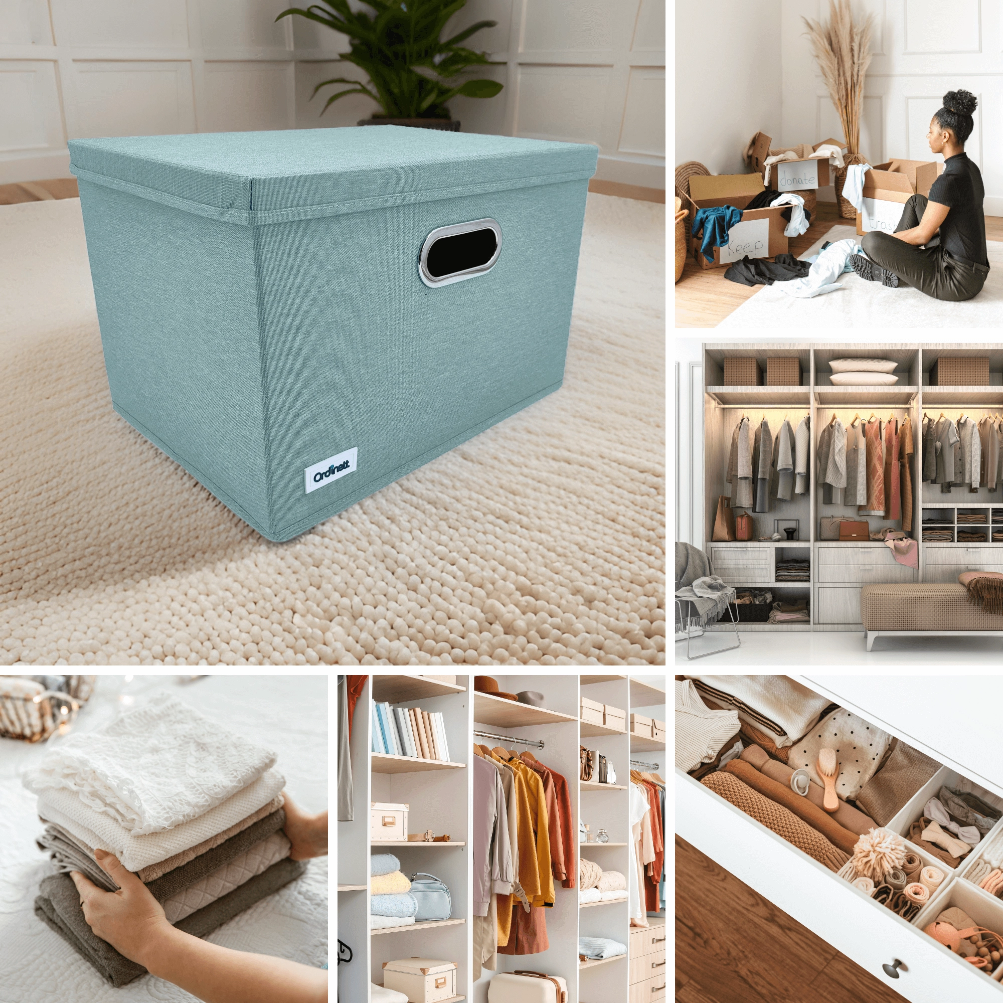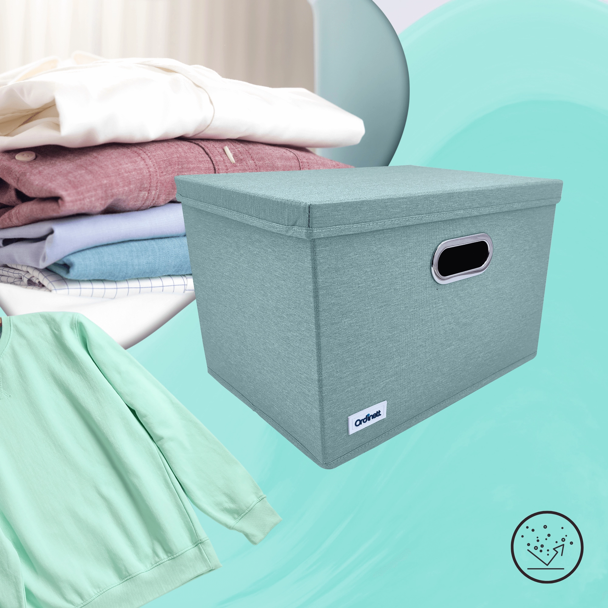 Få styr på skabet med denne elegante mintgrønne organizer. Den kombinerer en solid tekstilkonstruktion, et aftageligt låg til beskyttelse mod støv og håndtag med metalforstærkning for nem transport. Takket være det sammenklappelige design sparer den plads, når den ikke er i brug, og holder orden i tøj, linned, legetøj og bøger.