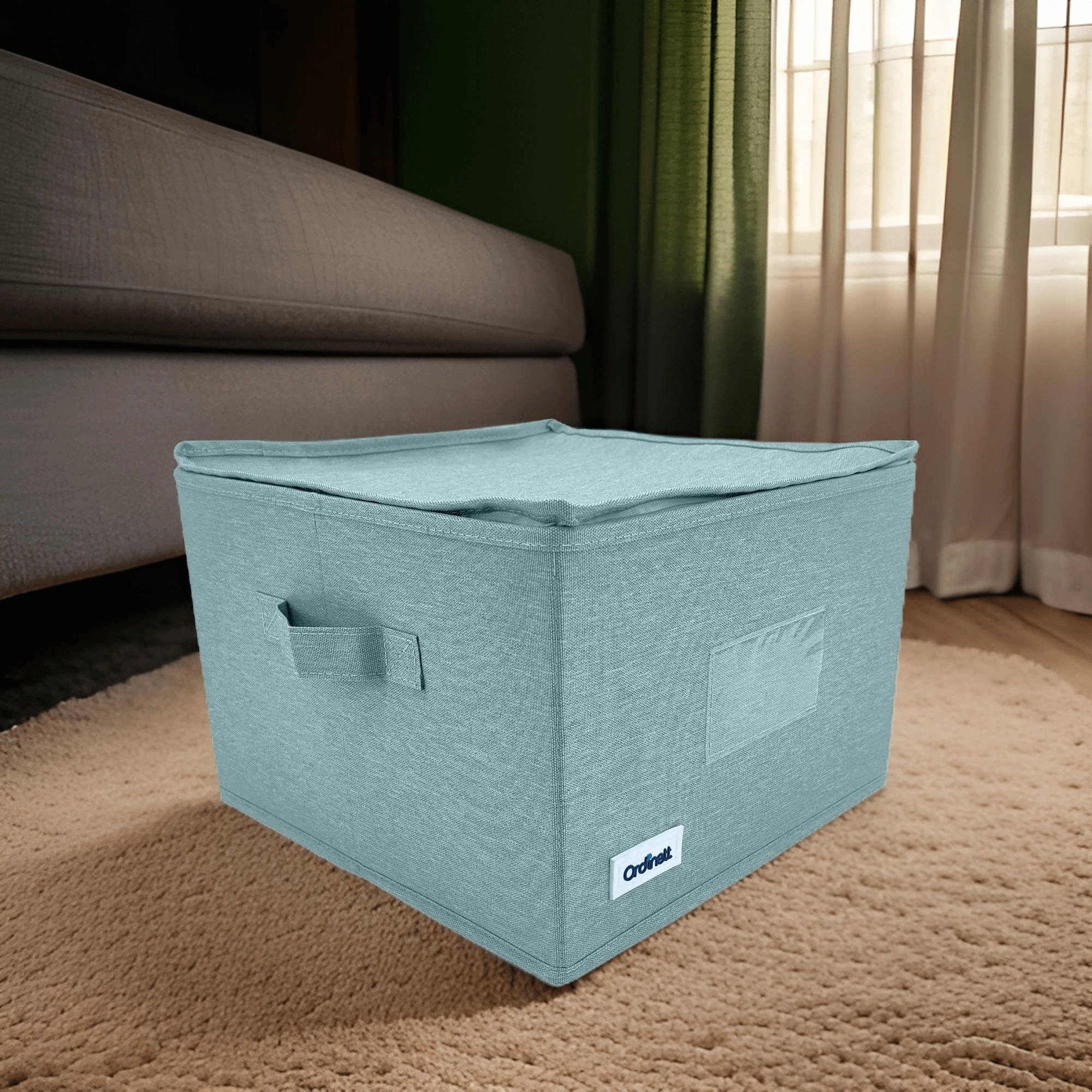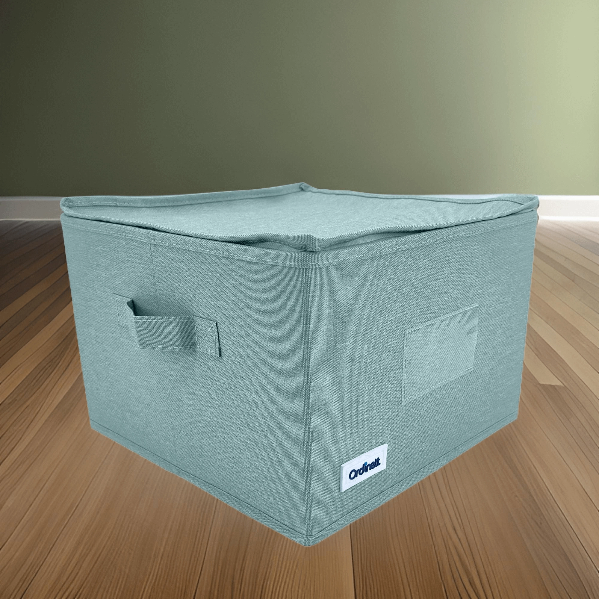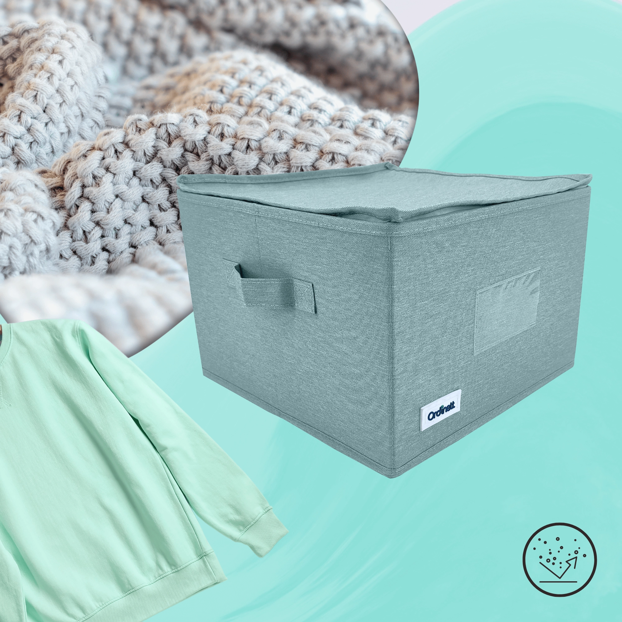 Hold orden derhjemme med stil. Denne tekstil-opbevaringsboks i målene 30 × 30 × 21 cm i en elegant mint farve har et solidt låg, sidehåndtag for nem transport og en sammenklappelig konstruktion, der sparer plads. Ideel til tøj, linned, legetøj, bøger og småting – dine ting forbliver overskueligt organiseret og beskyttet mod støv.