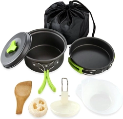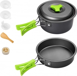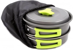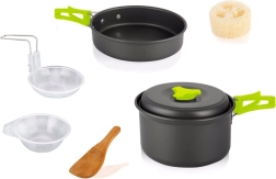 Komplet rejsesæt ideelt til camping og vandring. Gryde, pande og øse har sammenklappelige håndtag, som gør dem lette at stable og opbevare. Sættet kendetegnes ved høj holdbarhed. Det kan foldes sammen og opbevares bekvemt i det medfølgende etui med snorelukning.
