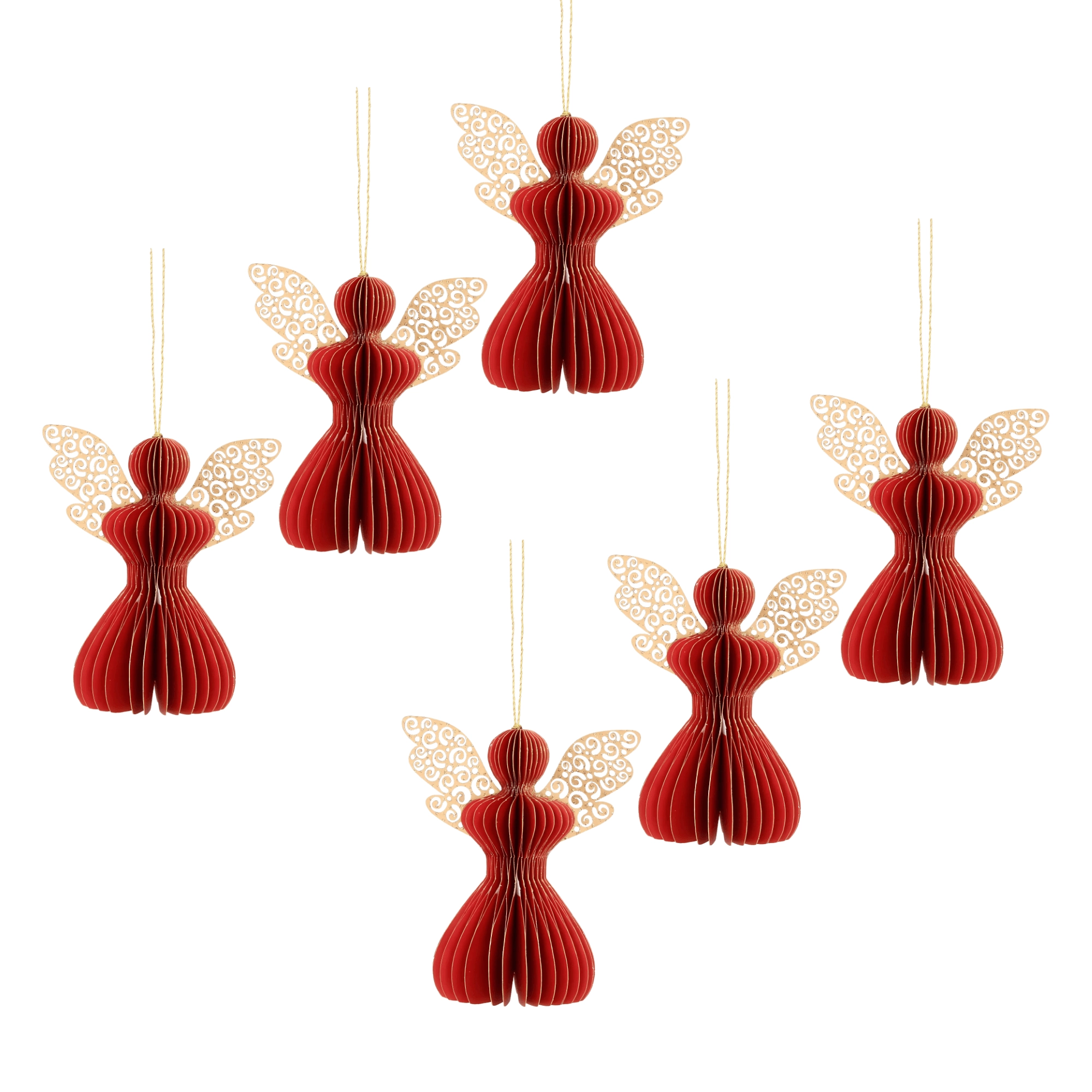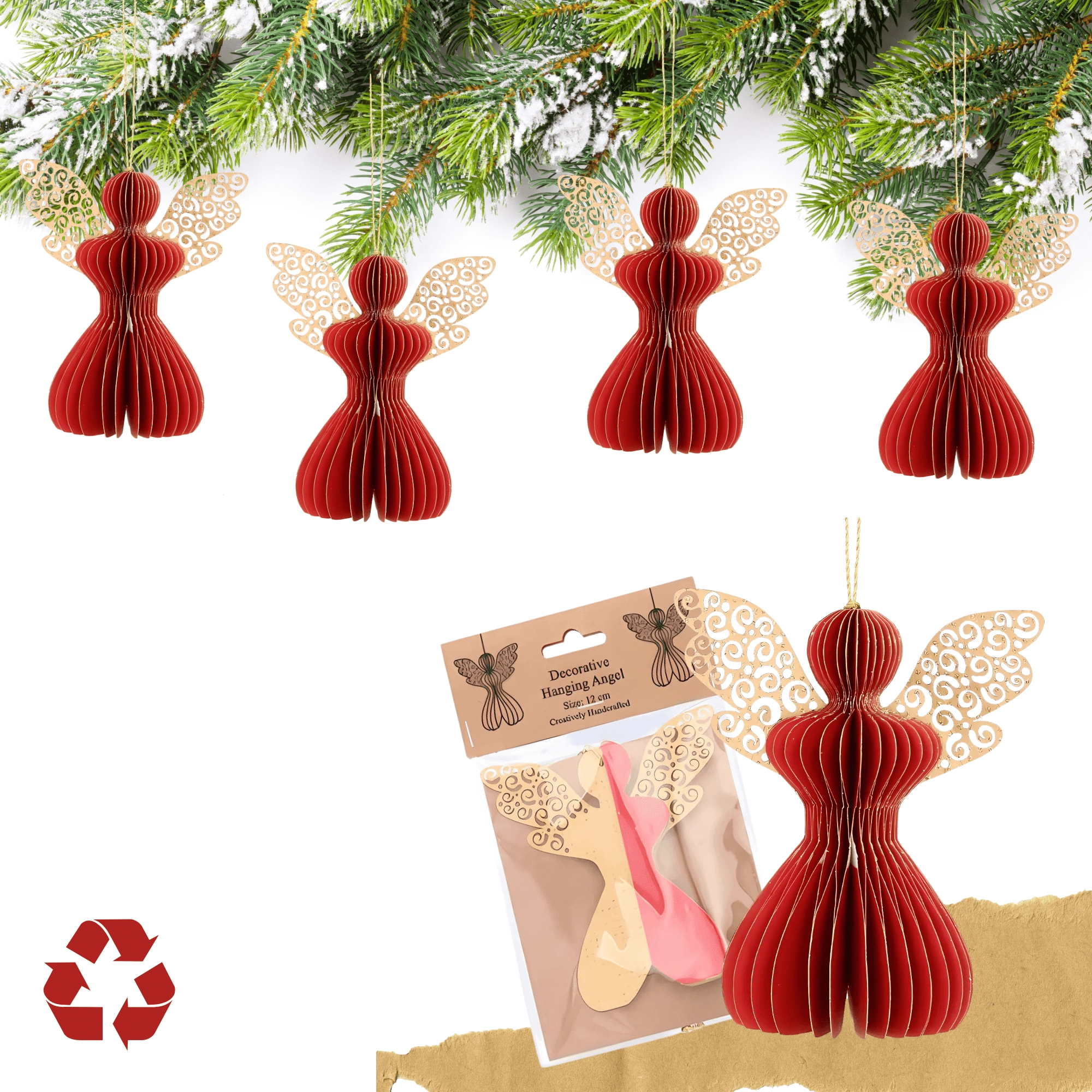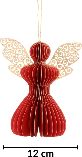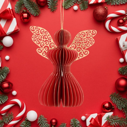 Den røde papirengel er en alsidig juledekoration, som passer både i klassiske og moderne interiører. Takket være det lette honeycomb (foldbare) design er den nem at hænge op og skaber en effektfuld 3D-virkning. Brug den på juletræet, kransen, i vinduerne eller som en diskret accent på det festlige bord.