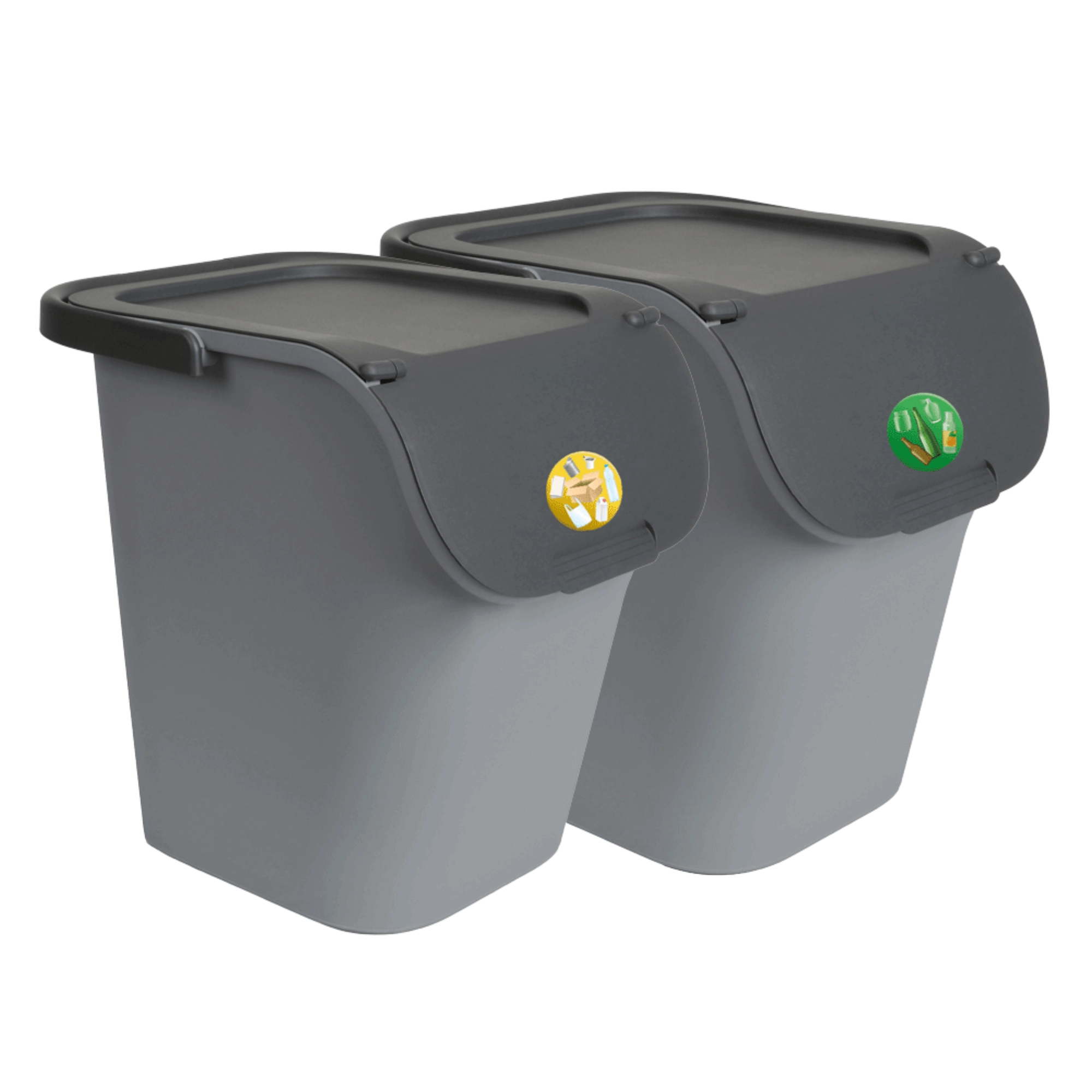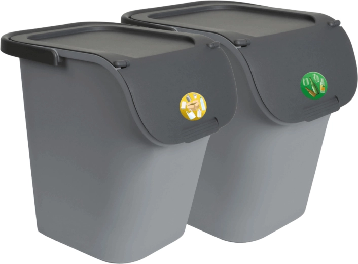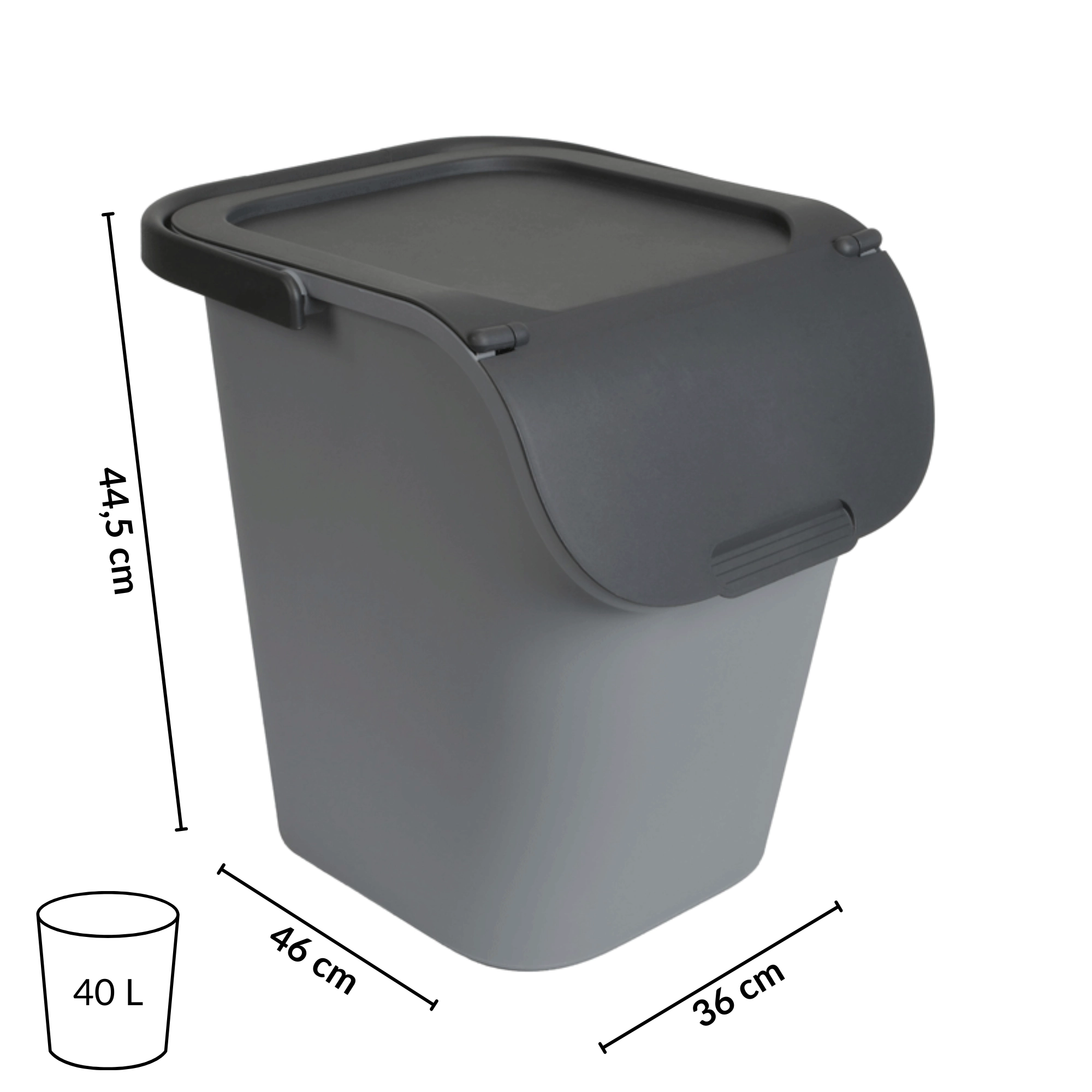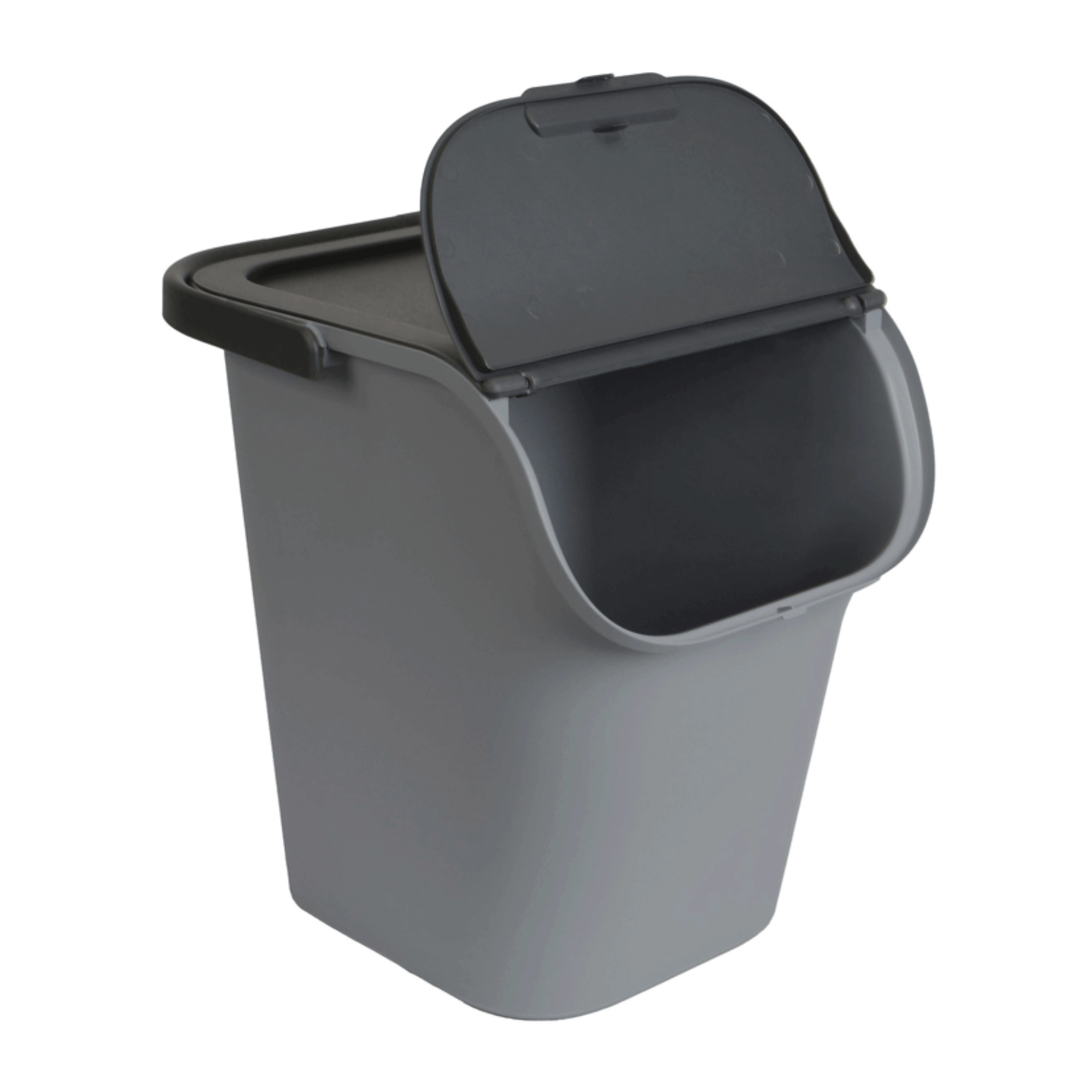 Den kompakte, rektangulære form gør det muligt at placere spandene side om side eller stable dem. Med de selvklæbende ikoner laver du en overskuelig genbrugsstation.