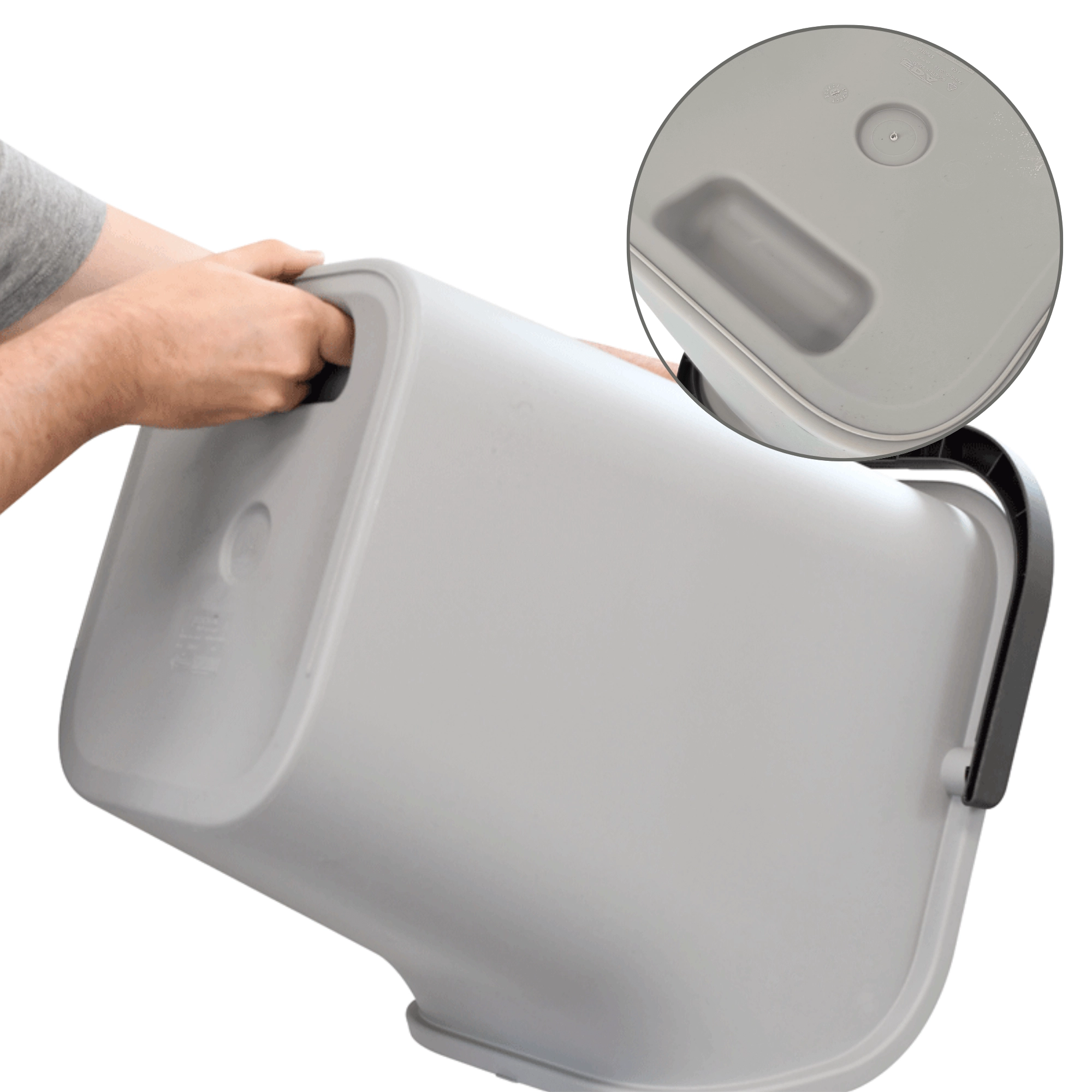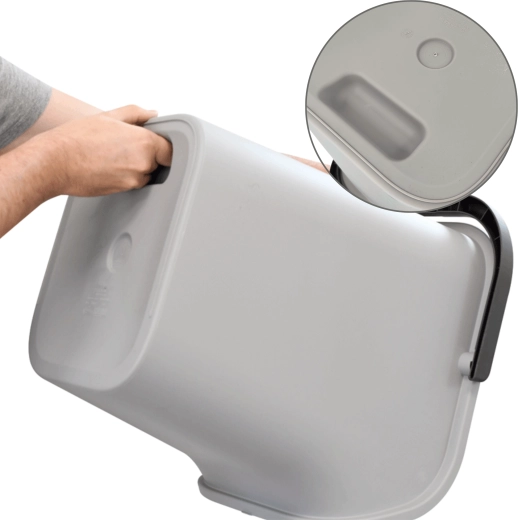 Den robuste hank og det forsænkede greb i låget gør det let at transportere og sikkert at tømme indholdet uden at spilde.