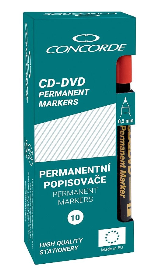 Universel permanent marker CONCORDE er ideel til præcis og varig mærkning af CD og DVD samt andre overflader som plast, glas, porcelæn og film. Den tilbyder hurtigtørrende spritbaseret blæk, der er vandafvisende og gnidningsresistent, og som alligevel kan afvaskes med sprit. Den fine stregbredde på 0,5 mm (F) sikrer rene og læselige markeringer.
