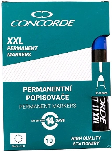 Universel permanent marker CONCORDE med alkoholbaseret blæk til pålidelig mærkning af folier, glas, plast, træ og metal. Tilbyder uudslettelig og vandafvisende skrift, ugennemsigtigt blæk og en behagelig stregbredde på 3 mm med rund spids. Holder op til 14 dage uden hætte uden at tørre ud.