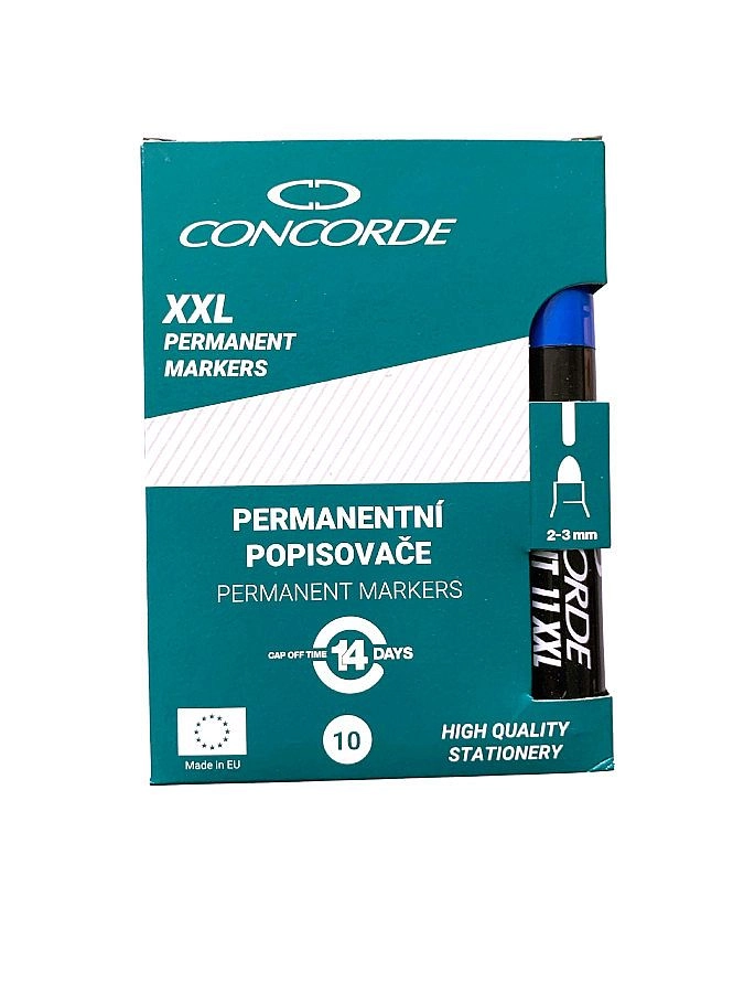 Den permanente marker CONCORDE i blå er det ideelle valg til daglig mærkning på kontoret, i skolen og i værkstedet. Det alkoholbaserede blæk giver en dyb, ugennemsigtig streg, som hæfter fremragende på både glatte og porøse overflader og er modstandsdygtig over for vand og afsmitning.