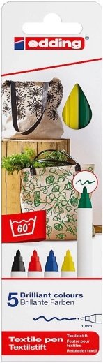 Oplev kreativ frihed med tekstilmarkere Edding 4600 i et praktisk sæt med 5 basisfarver. Ideel til skrivning, tegning og dekoration på lyse tekstiler som bomuld, silke og hør. Blækket er vandbaseret med neutral duft, hurtigtørrende og lyseægte. Den runde spids med en stregbredde på 1 mm sikrer præcise resultater på T-shirts, pudebetræk, poser og æsker beklædt med stof.