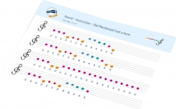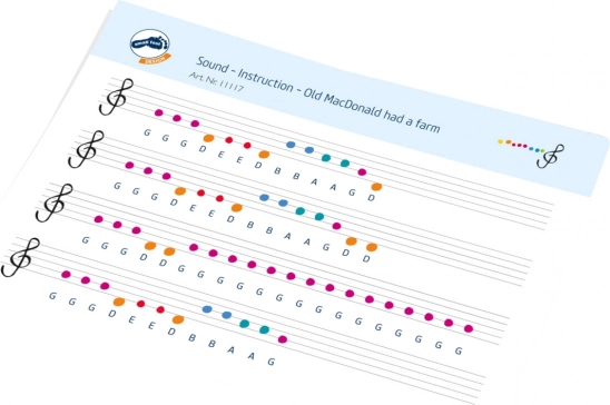 De medfølgende farvekodede nodesider (fx “Old MacDonald”) hjælper børn med at koble farver til toner og hurtigt lære de første melodier.
