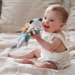 Denne nuttede bamse forener sikkerhed, bæredygtighed og leg. Når den trykkes, piver den blidt, og ved bevægelse rasler den, hvilket naturligt understøtter udvikling af finmotorik, hånd-øje-koordination og sanseindtryk allerede fra fødslen. Det bløde design i økologisk GOTS-certificeret bomuld er skånsomt mod sart babyhud.
