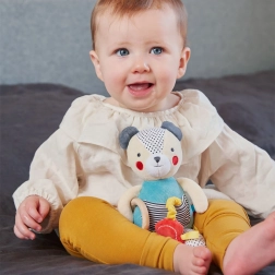 Bamsen med bidering fra Petit Collage udmærker sig ved høj kvalitet og skånsomme materialer. Den kombinerer blødt tekstil med en træring for at give børn komfort ved kramning og lindring ved bid. Takket være gennemtænkte teksturer og farver understøtter den taktil, visuel og motorisk udvikling fra de allerførste dage.