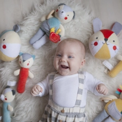 Kontrastmønstre, varierede teksturer og fine detaljer støtter udviklingen af syn, berøring og finmotorik fra 0+.