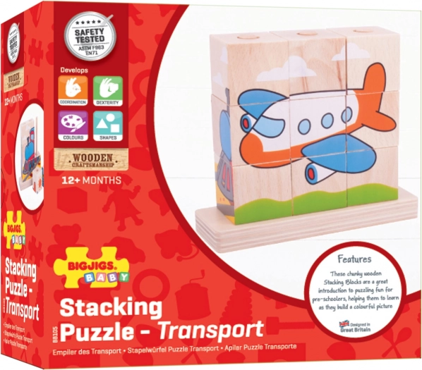 Træpuslespil Bigjigs Baby Transportmidler er det ideelle legetøj til at udvikle motoriske færdigheder og hånd-øje-koordination hos børn. Indeholder 10 stykker træblokke med fire transportscenarier: tog, bil, traktor og fly.