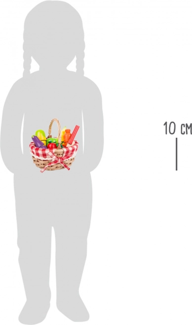 Farverig frugt og grønt i massivt træ i en kurv med ternet stof indbyder til leg i butik og køkken.