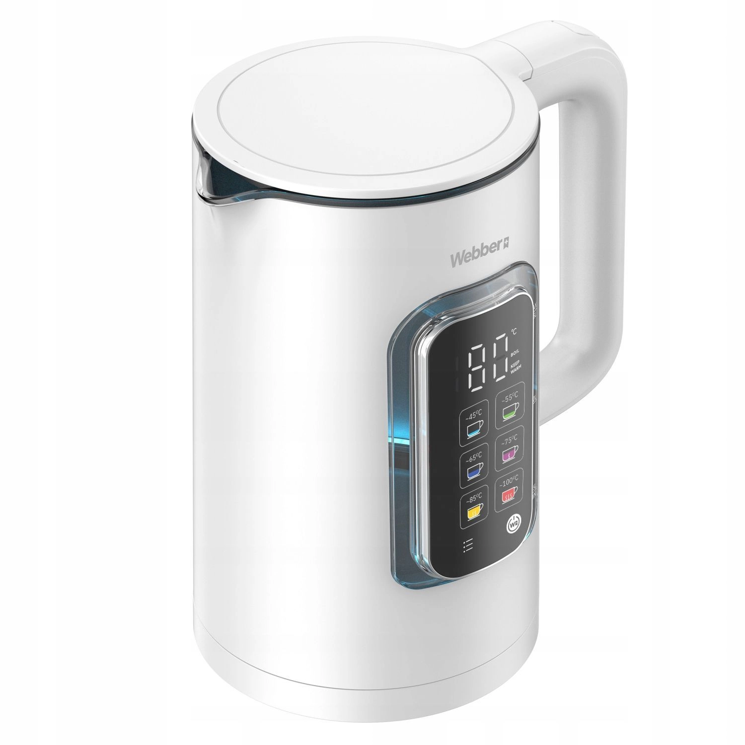 WEBBER ELIYA er en moderne elkedel designet til te- og kaffelskere, der kræver maksimal kontrol over temperaturen. Vælg nemt den ideelle opvarmning til fine teer, kaffe eller drikke til børn. Det indre i glas bevarer vandets rene smag, og det elegante hvide kabinet med bagbelyst display passer i ethvert køkken.