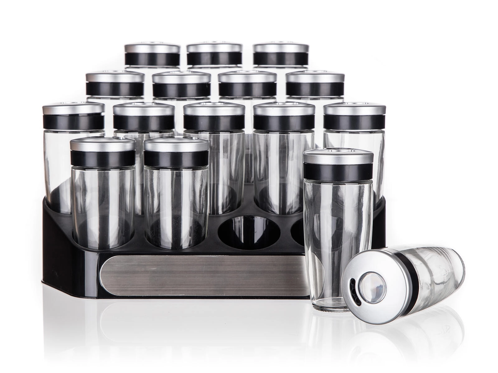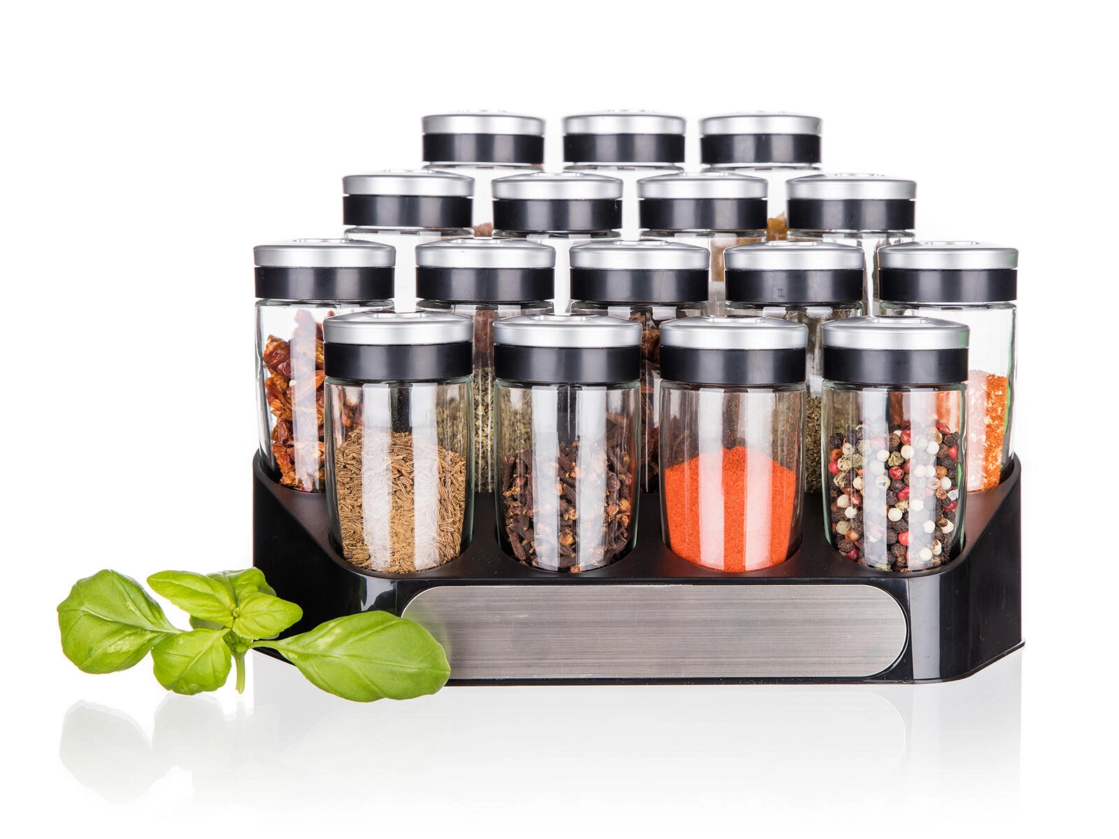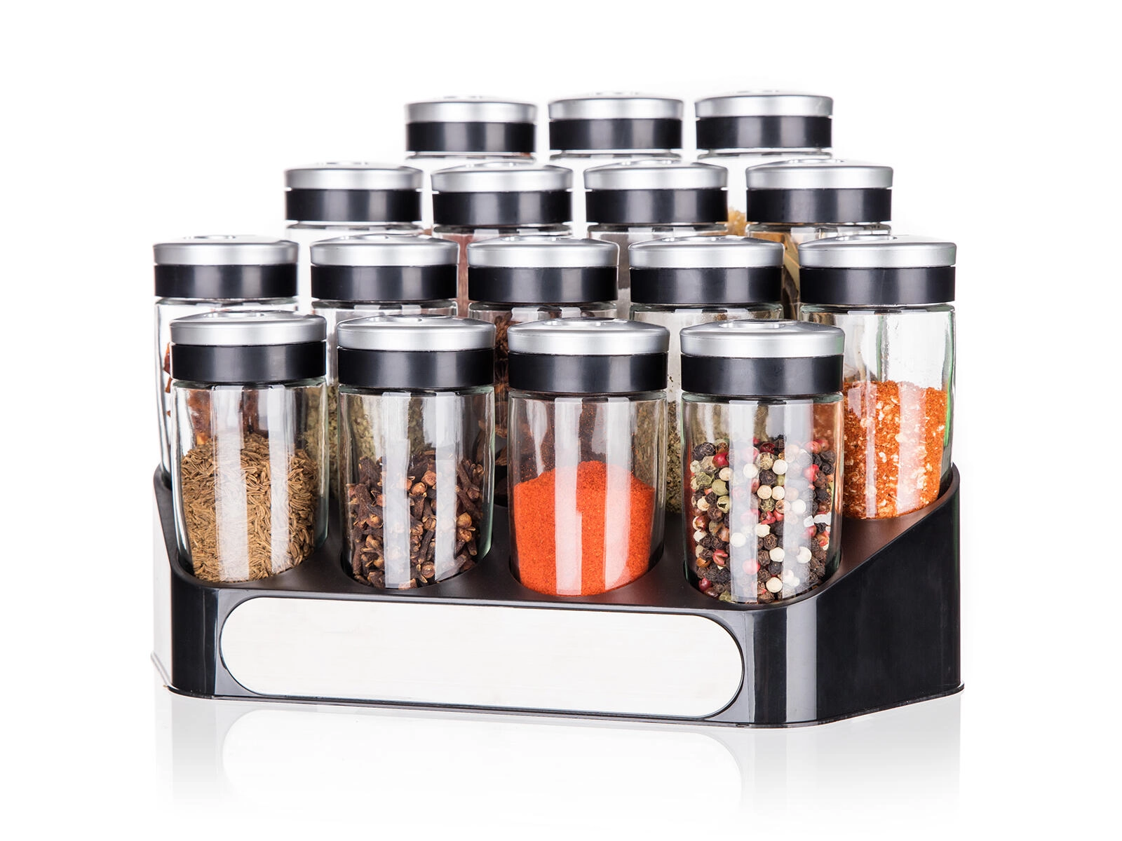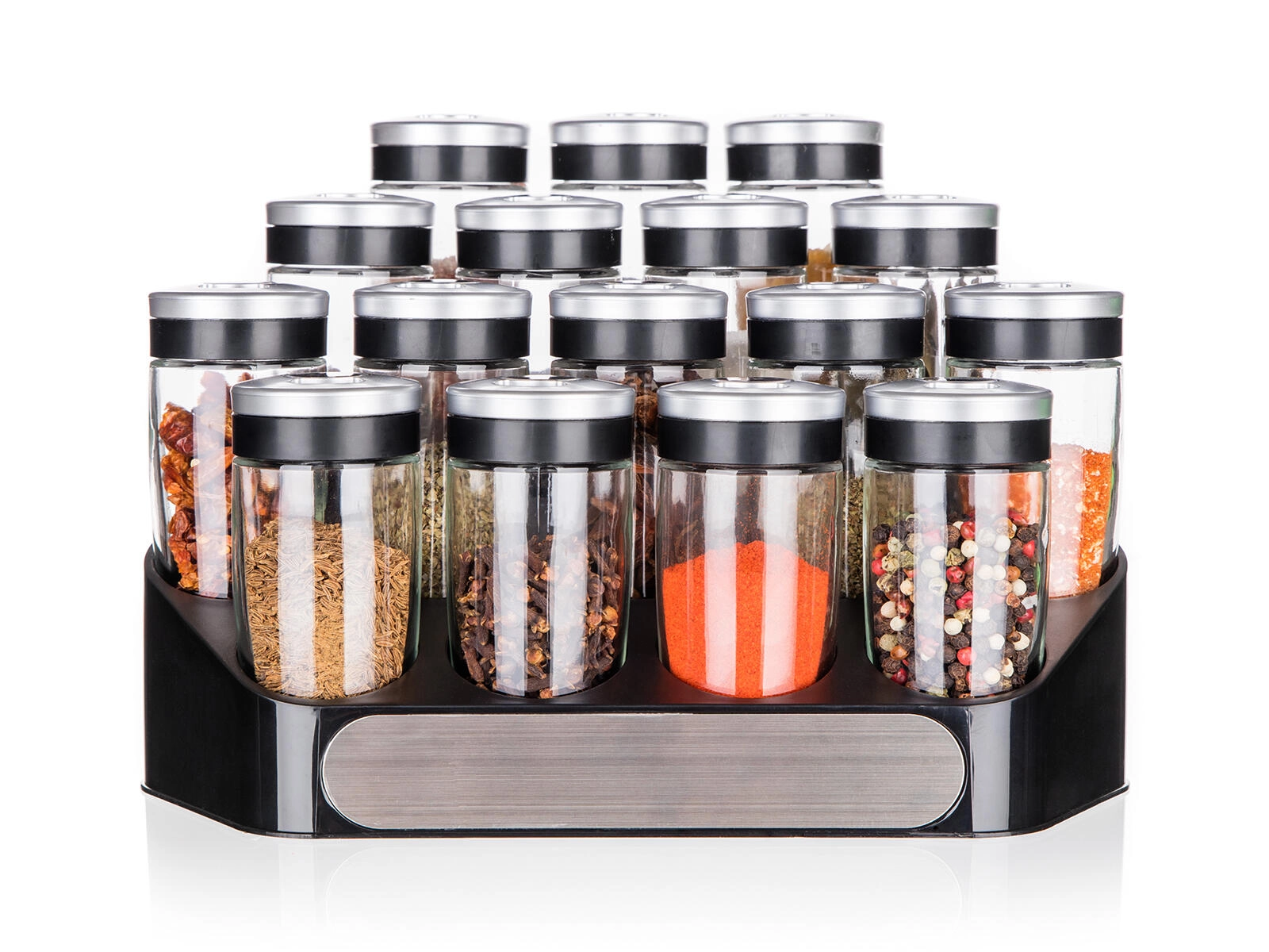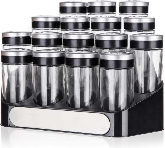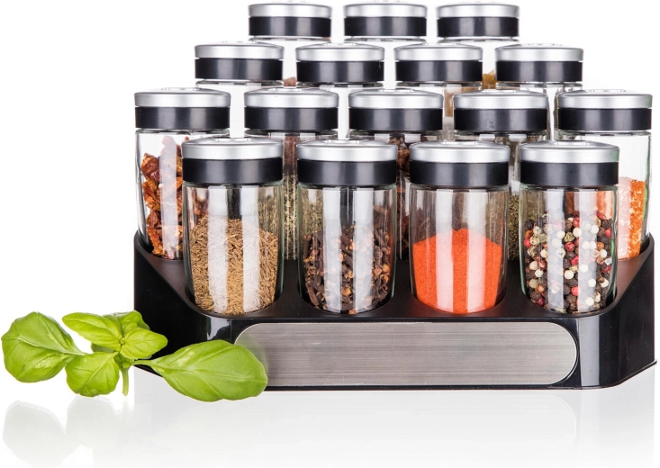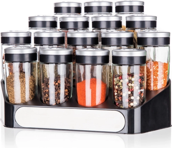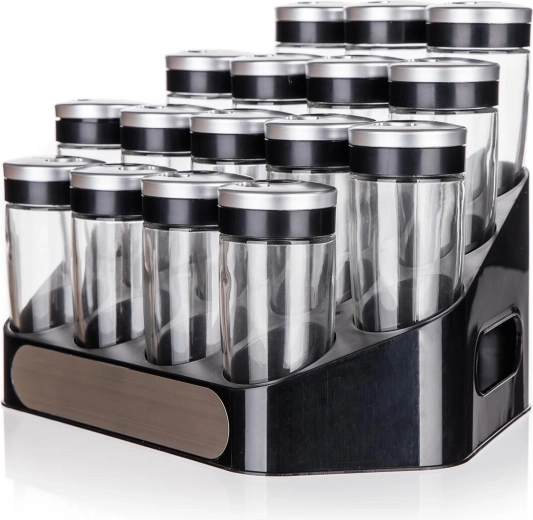 Det stabile ABS-stativ holder alle 16 krydderiglas pænt organiseret og inden for rækkevidde – ideelt til køkkenbordet eller spisekammeret.