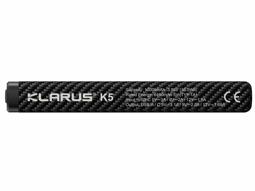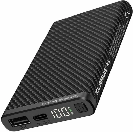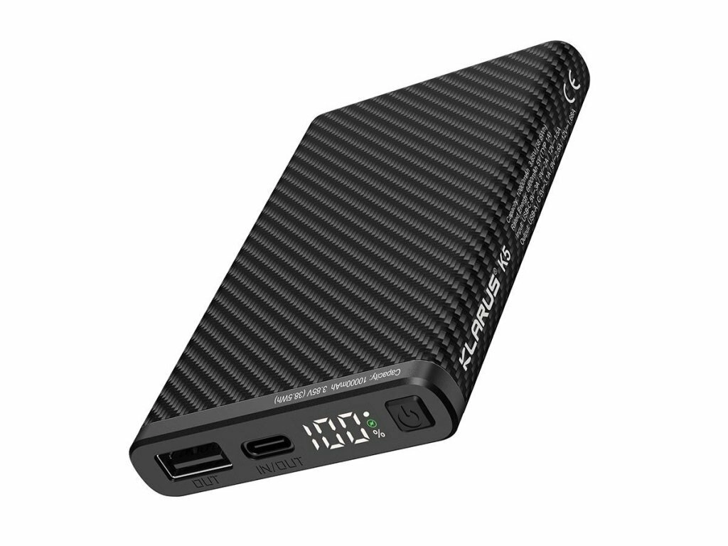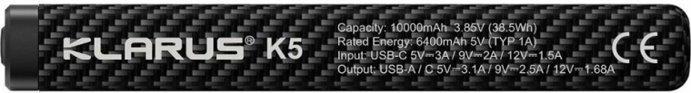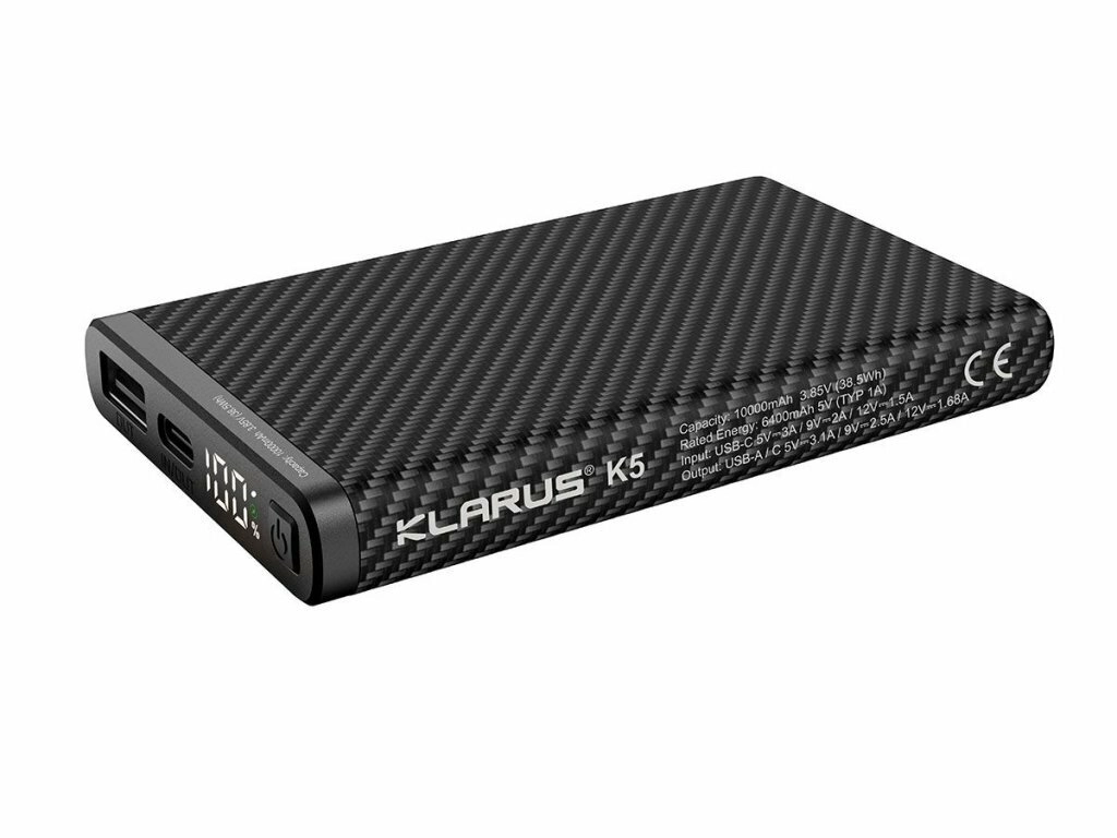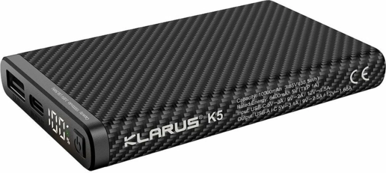 Ultralet powerbank Klarus K5 med en kapacitet på 10000 mAh og en tekstureret “carbon”-overflade er ideel til vandring, klatring og daglig brug. Den tilbyder USB‑A og USB‑C (IN/OUT), understøtter hurtigopladning QC/PD 22,5 W og har et digitalt LED‑display med batteristatus i procent.