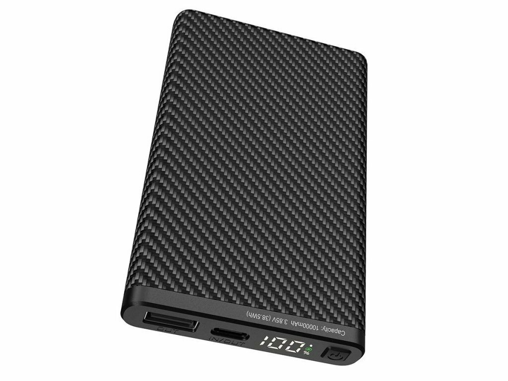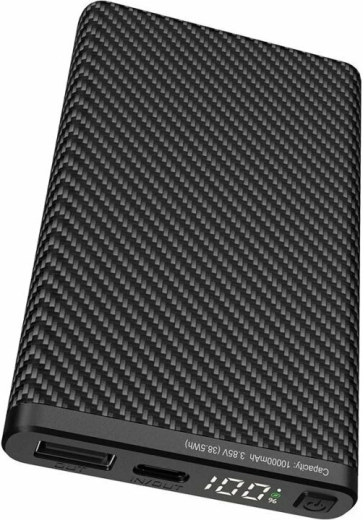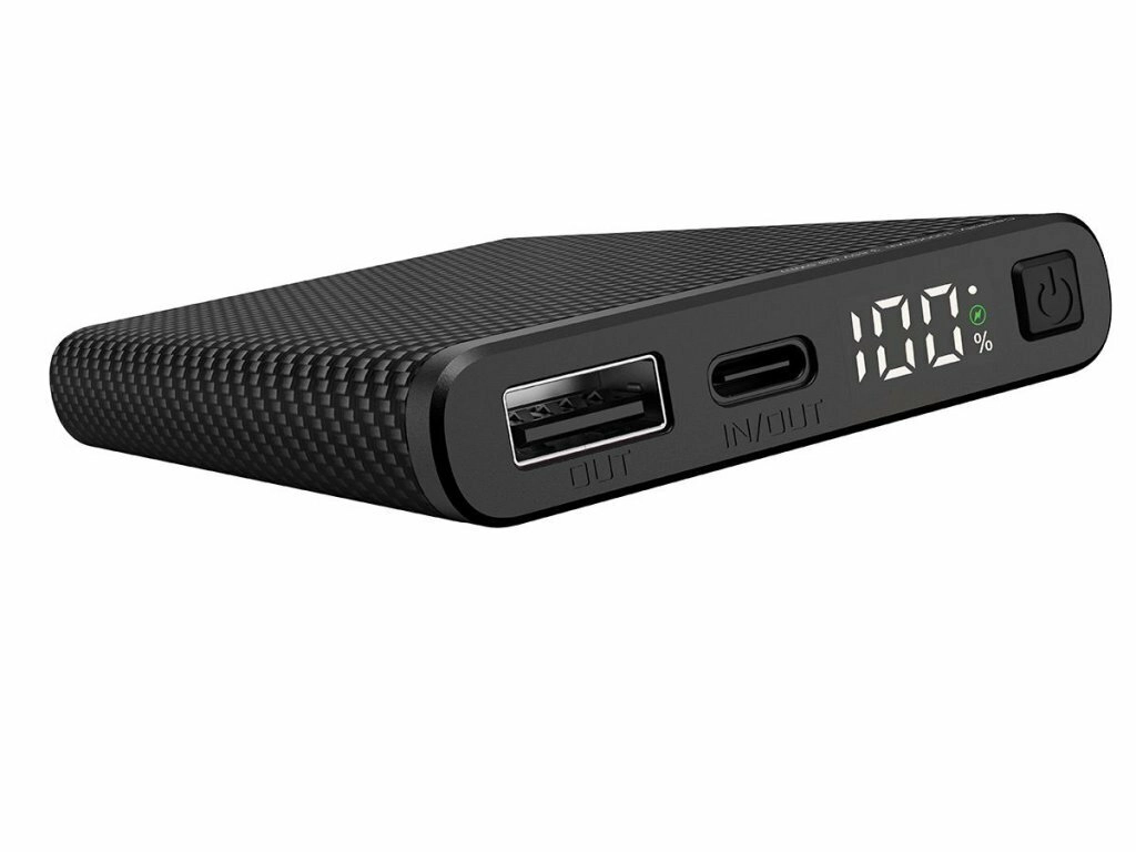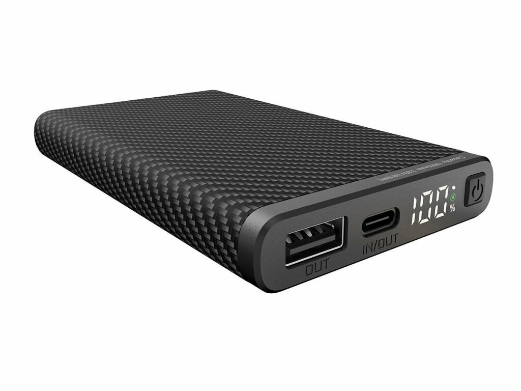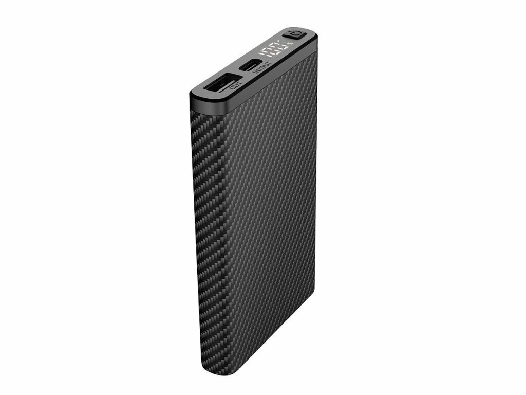 Ultralet powerbank Klarus K5 med en kapacitet på 10000 mAh og en tekstureret “carbon”-overflade er ideel til vandring, klatring og daglig brug. Den tilbyder USB‑A og USB‑C (IN/OUT), understøtter hurtigopladning QC/PD 22,5 W og har et digitalt LED‑display med batteristatus i procent.