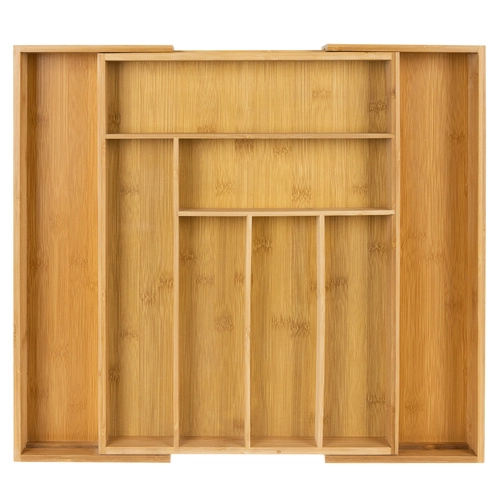 Den praktiske indsats i bambustræ tilpasses skuffens bredde takket være udtrækkelige sidepaneler. I grundkonfigurationen tilbyder den 6 rum, og efter udvidelse op til 8 sektioner for overskuelig sortering af bestik og køkkenredskaber. Glatte skillevægge gør organiseringen og hurtig adgang nem.