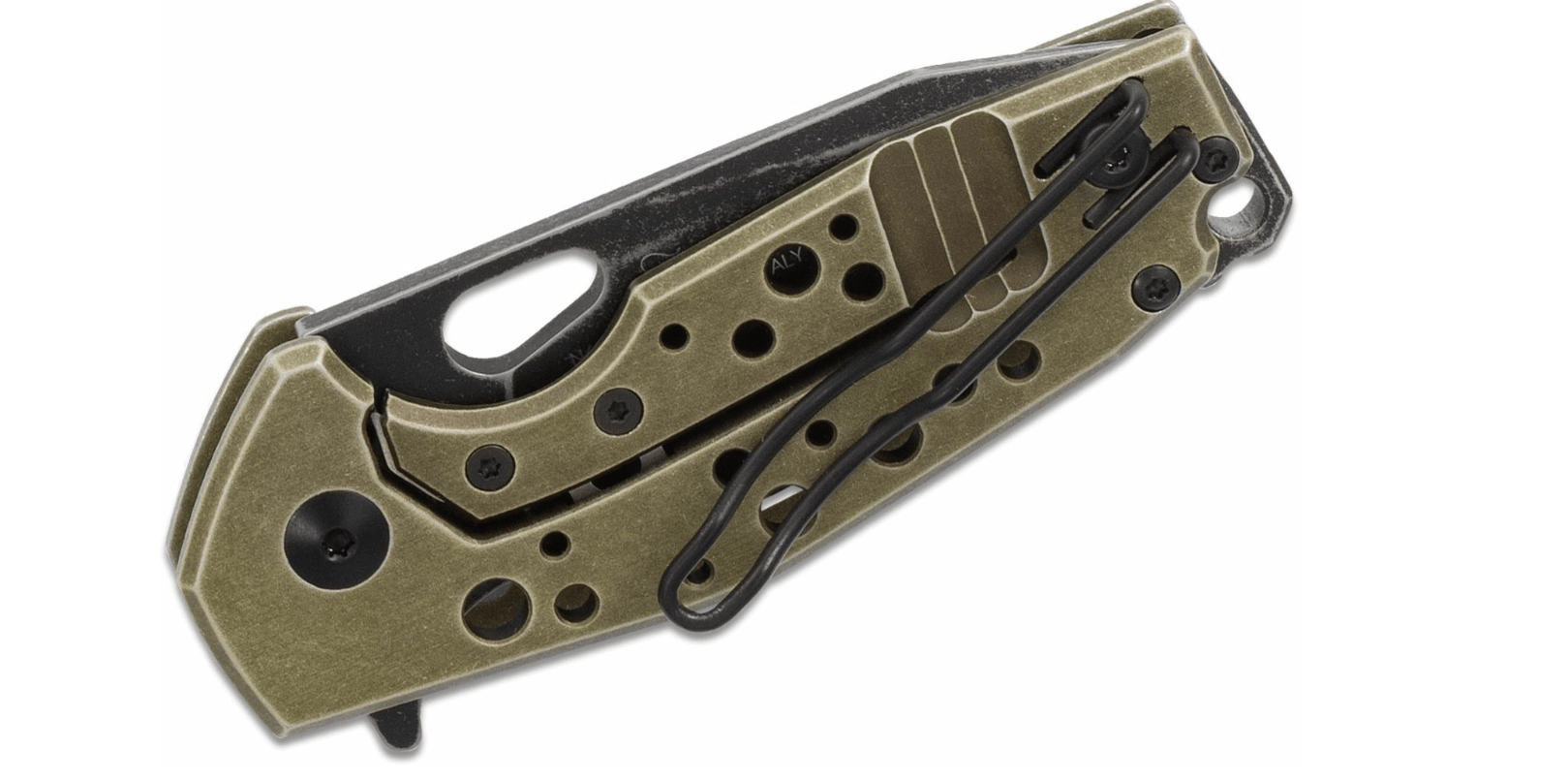 Det ergonomiske skaft af aluminium i grøn farve er let og slidstærkt. Aflastningshuller reducerer vægten, mens snorhul og lommeklips sikrer sikker og diskret bæring. Sikkerheden varetages af den pålidelige Frame Lock, som fastlåser klingen i åben position.