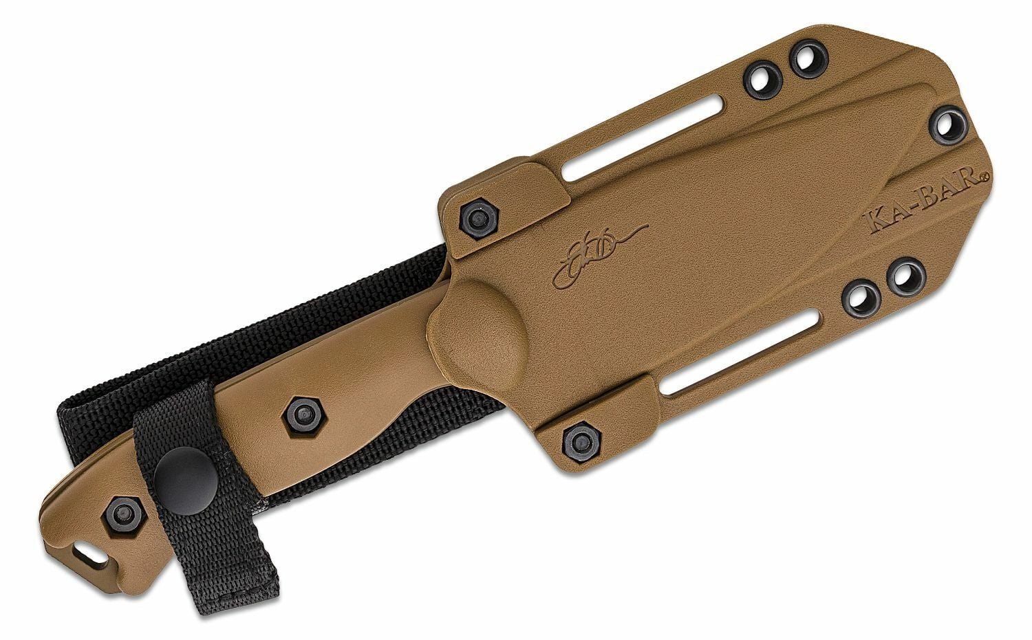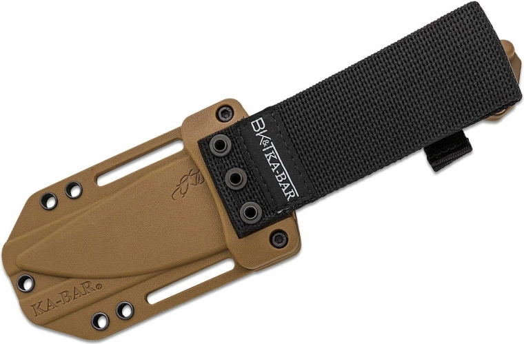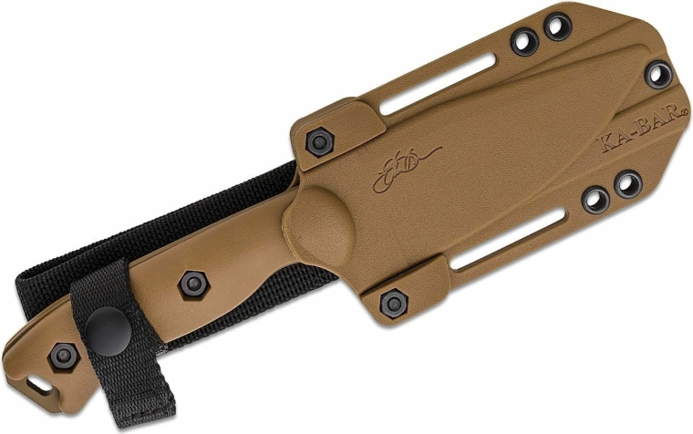 Den gennemgående full-tang konstruktion øger knivens styrke og levetid. De teksturerede skæfter i Zytel i en sandbrun nuance giver et komfortabelt og sikkert greb, også med handsker. Medfølgende er en robust polymer skede med flere monteringsmuligheder for sikker og fleksibel bæring på bælte eller udrustning.