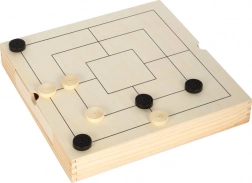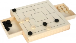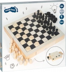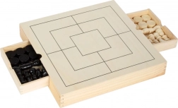 Dette elegante træsæt tilbyder tre klassiske strategispil i ét: skak, dam og mølle. Med de kompakte mål 28 × 28 × 4 cm og integrerede skuffer er det ideelt både på farten og derhjemme. Hver del har sin plads, så intet går tabt, og spillet kan begynde på få sekunder.