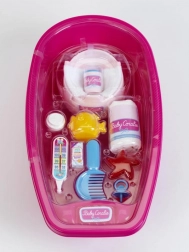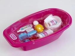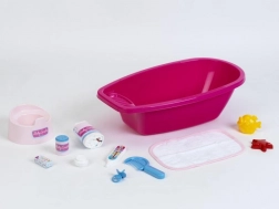Dette store badekar til dukker indeholder 12 stykker tilbehør, som enhver "mor" har brug for til at passe sin baby. Ideel til dukker op til 50 cm.