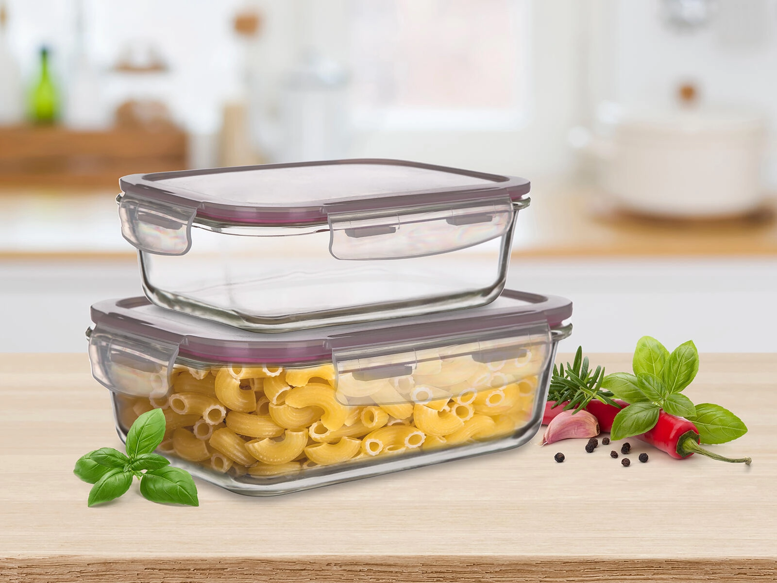 Praktisk sæt med to rektangulære glasdåser Lora på 0,55 l og 0,95 l med polypropylenlåg tilbyder hermetisk lukning, sikker bevarelse af friskhed og alsidig anvendelse i køkkenet. Velegnet til bagning i ovn (uden låg), opvarmning i mikrobølgeovn, frysning samt transport af mad. Låget er transparent med vinrød tætningsliste for pålidelig tætning.