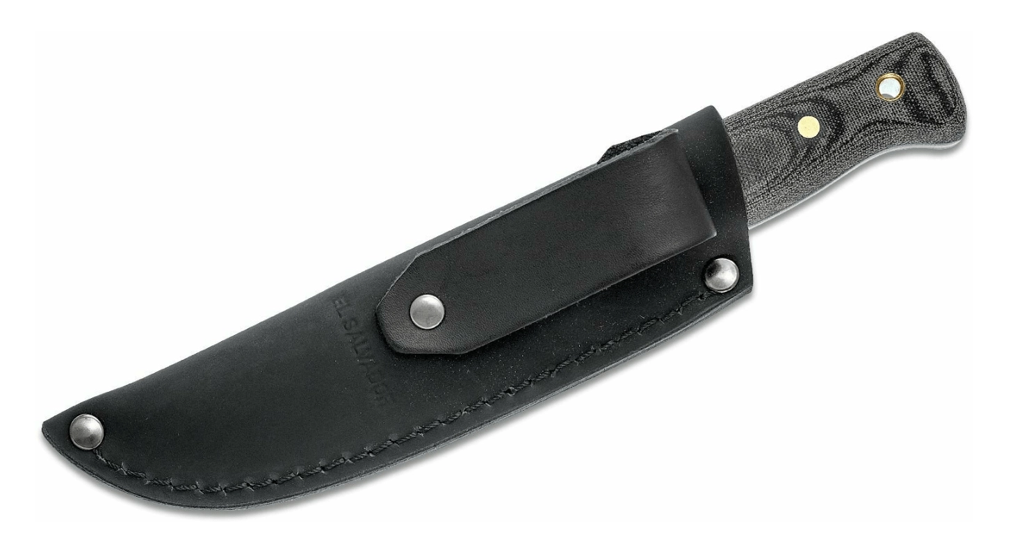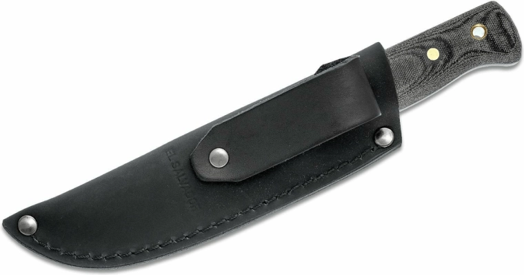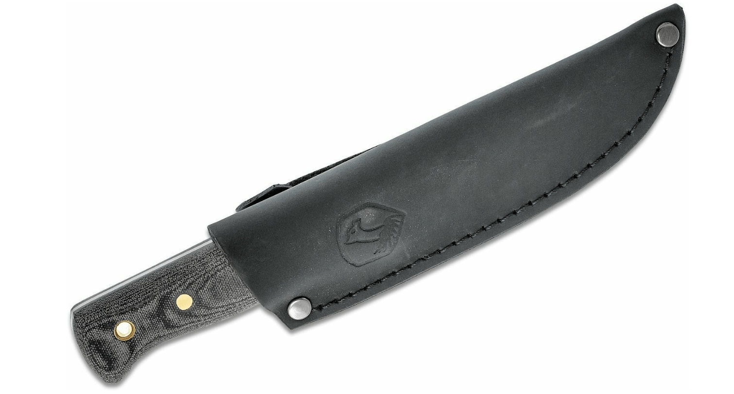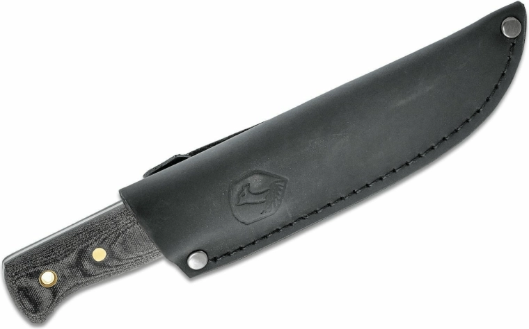 Der medfølger en mørk læderskede, som beskytter kniven pålideligt og gør den let at bære i bæltet. Kulstofstål kræver grundlæggende vedligeholdelse – hold det tørt, og rengør samt oliebehandl efter brug.